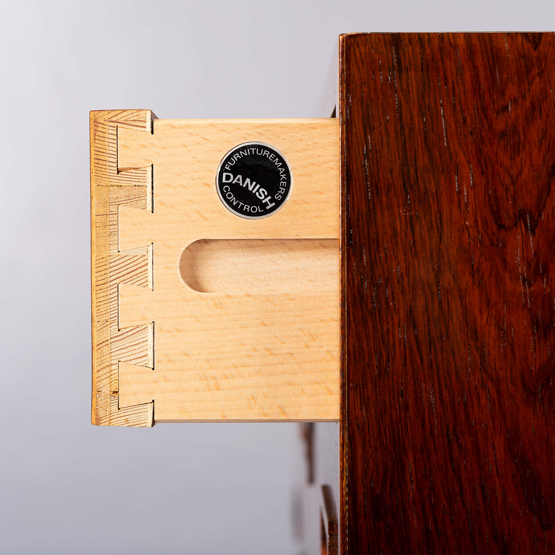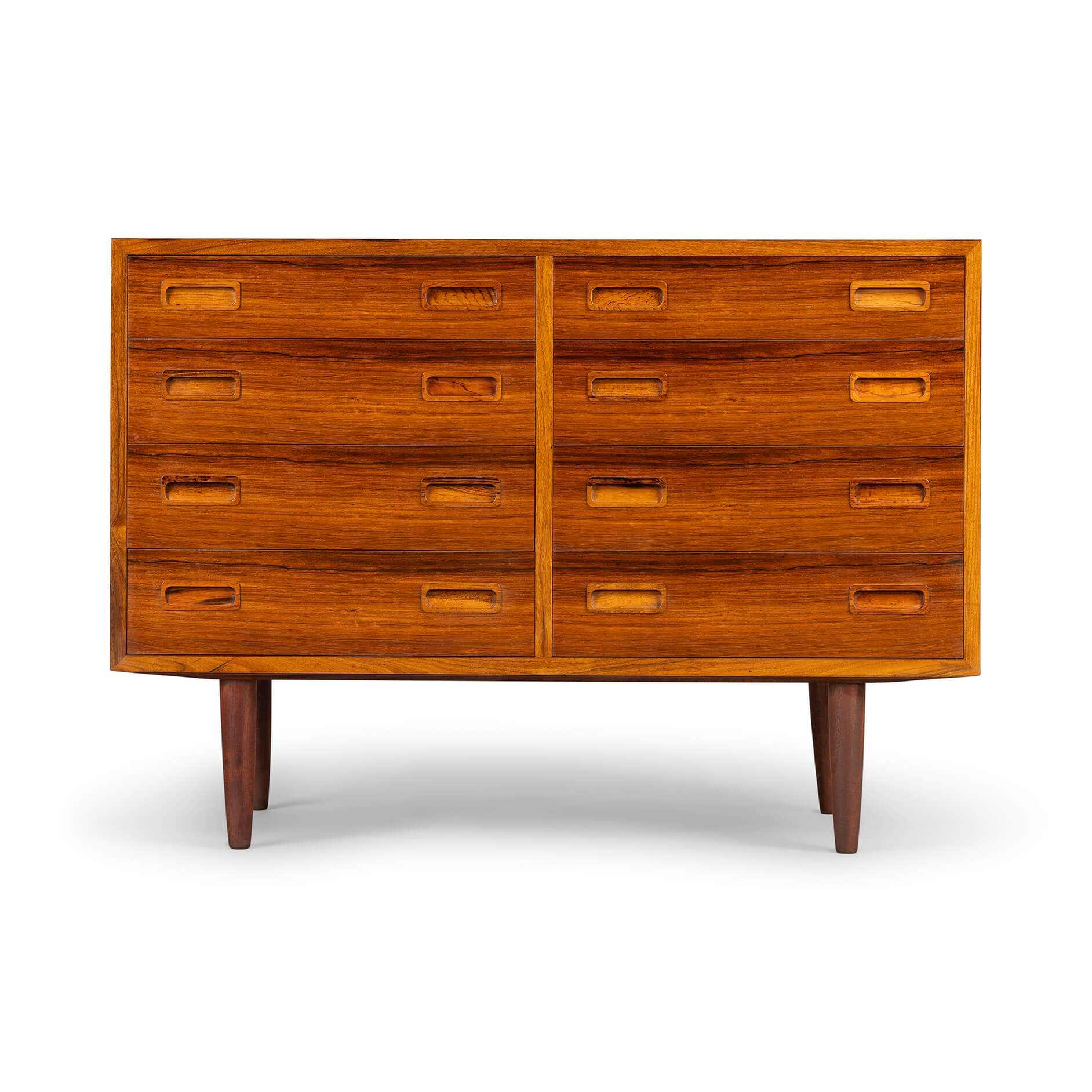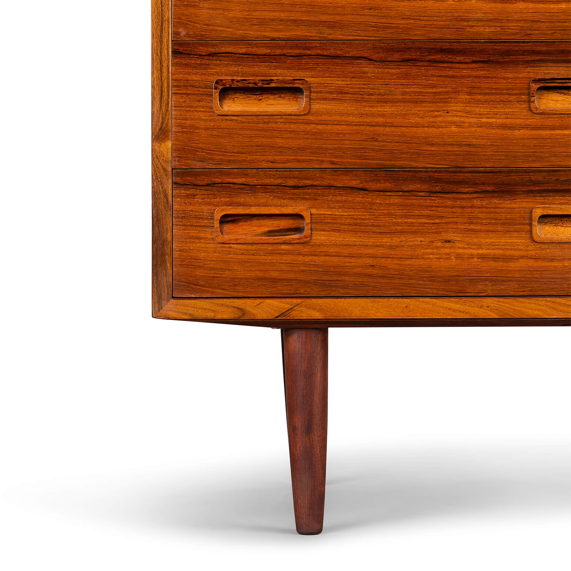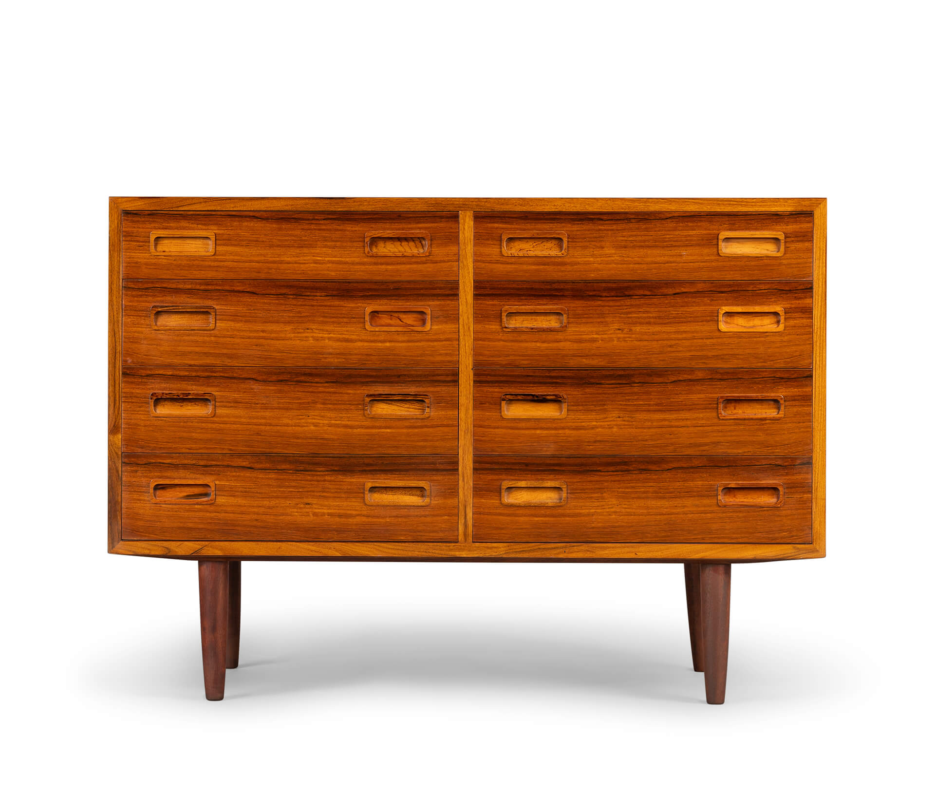 Deze ladekast is een typische Hundevad: functioneel, met aandacht tot in het kleinste detail afgewerkt met zorgvuldig geselecteerde materialen. De ‘perfect match’ tussen vorm en functie, tussen lades en kastframe. Voor dit design liet Poul Hundevad zich verleiden door ‘Dalbergia Sissoo’, ofwel Indiaas palissander. Het is een exclusieve zeer harde houtsoort met enkele diep zwarte accenten. De ladekast is gemaakt in de jaren ‘70 en bekroond met het Deense export label ‘furniture make control’. Kortom ben je op zoek naar uniek vintage design plaats dan deze ‘attention drawer’ in jouw interieur.