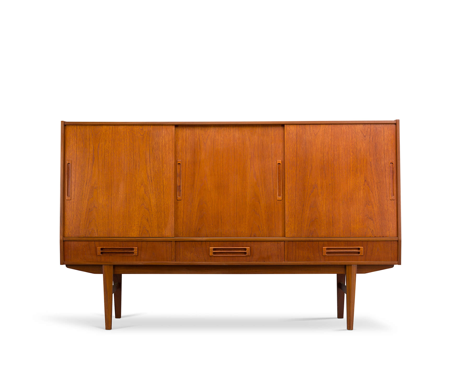 Een stijlvol hoog dressoir. Mooi Scandinavisch design, deze teak kast met een heel klein buikje. Wat zorgt voor maximale opbergruimte en bij een kast ook nog eens aantrekkelijk is ;-) Het dressoir is uitgevoerd met bijzondere dubbele grepen en de drie lades zijn net iets donkerder van kleur. Een subtiel detail.