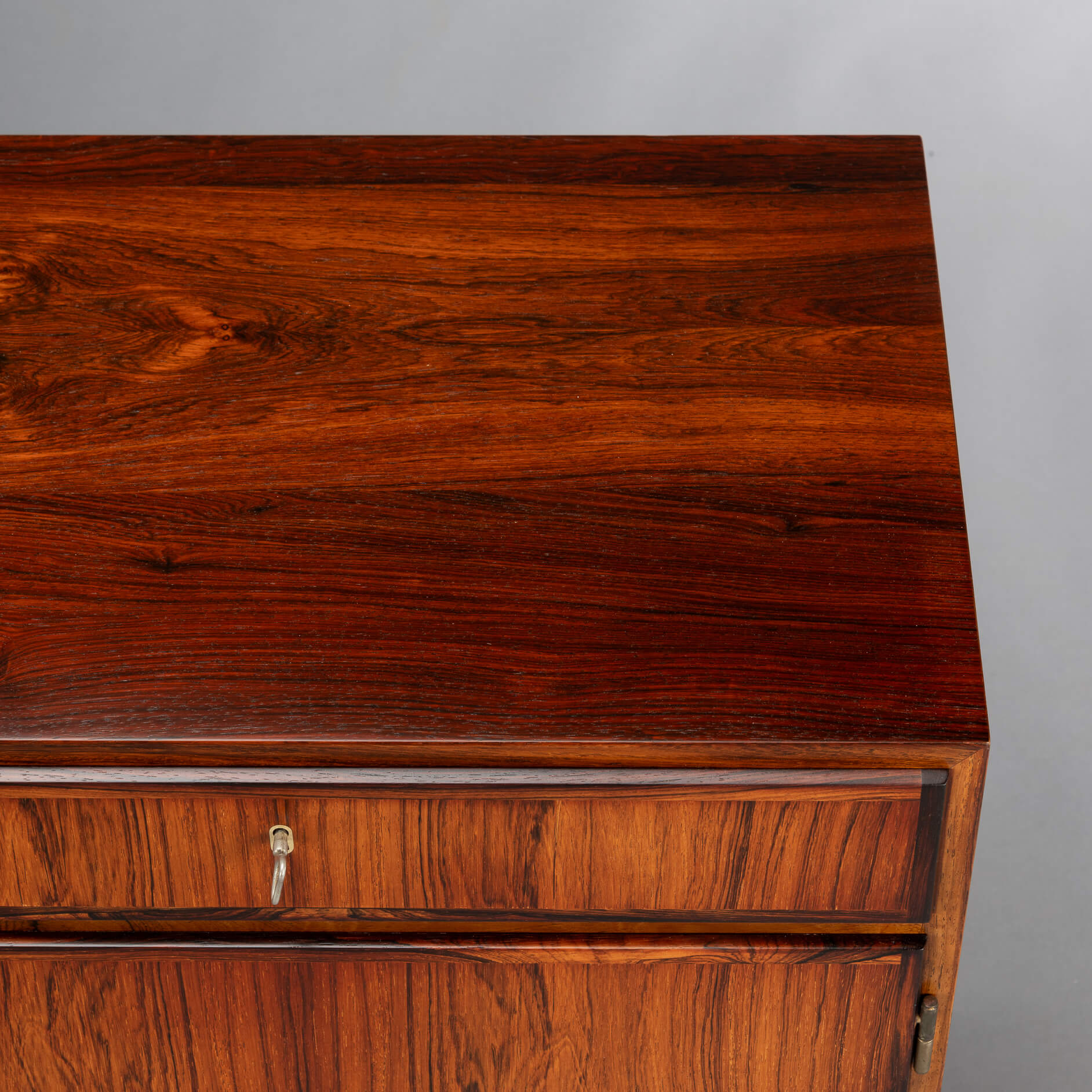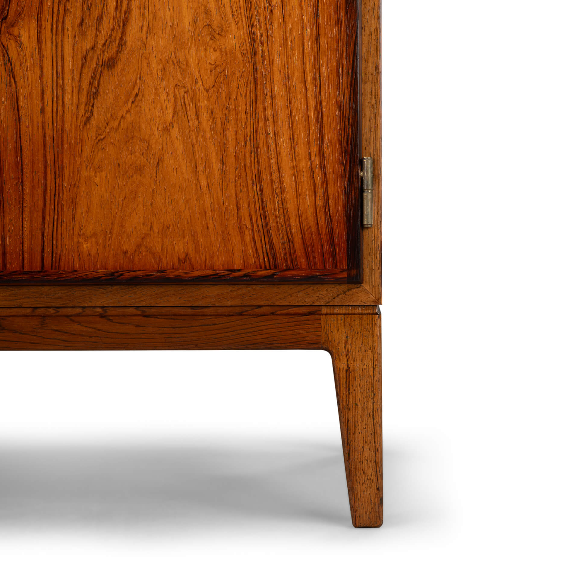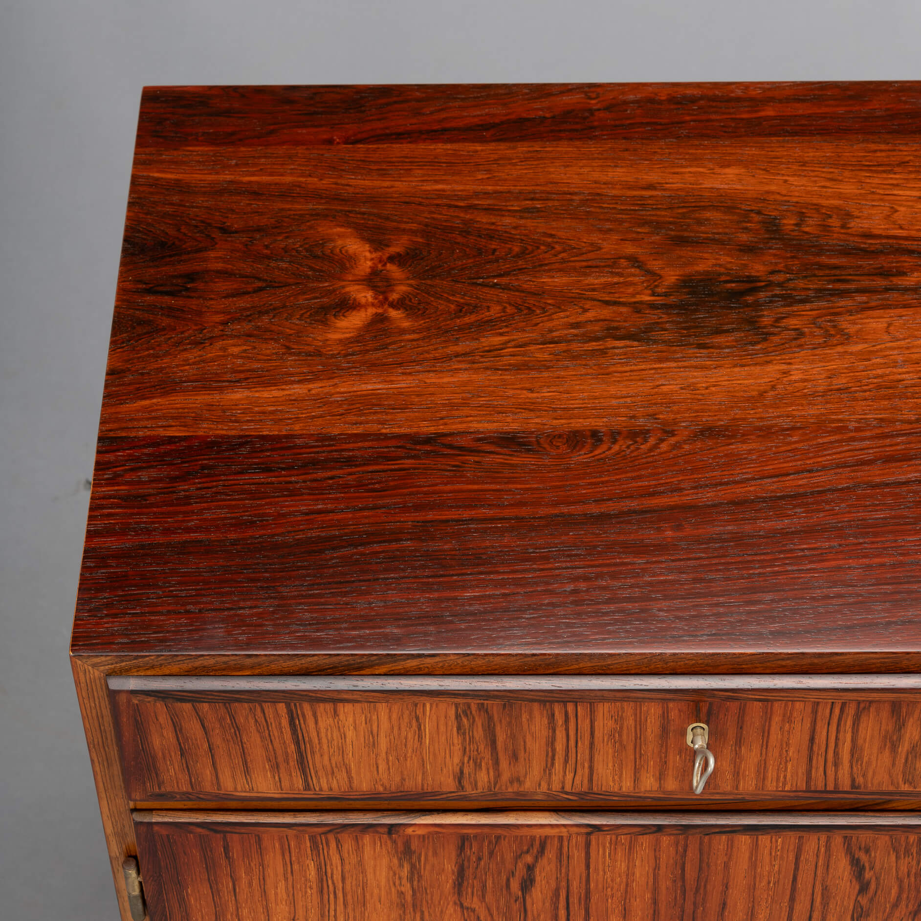 Dit masterpiece heeft het originele vaste onderstel. Deze uitvoering is zeldzamer, de meeste uitvoeringen zijn met losse (afdraaibare) poten. Achter de deuren bevinden zich twee in hoogte verstelbare legplanken. Wij hebben de bovenkant opnieuw professioneel laten spuiten met een hoogwaardige cellulose coating. Hierdoor is de top weer bestand tegen vocht (vazen etc.). Kortom de kast is in een zeer goede vintage staat met minimale gebruiksporen.