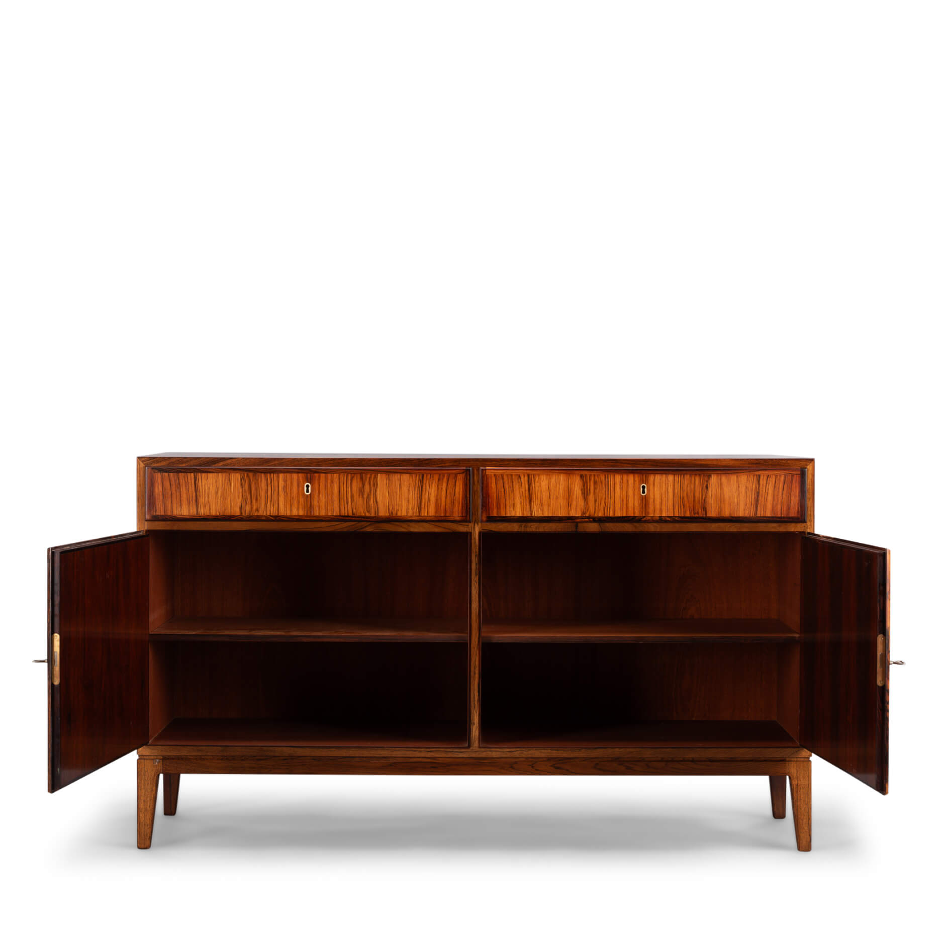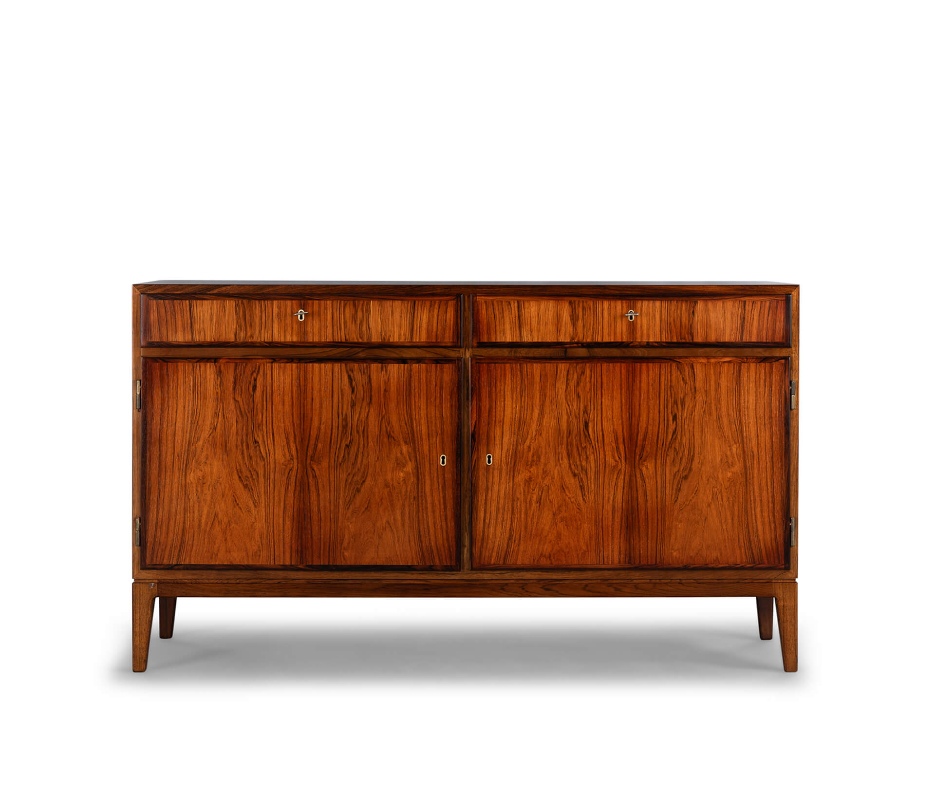 Stijlvol! Is dit laag Model no. 5 dressoir gedesigned door Gunni Omann. Deze kast heeft een kwalitatief hoge afwerkingsgraad. Door het gebruik van hoogwaardige materialen brengt deze kast een compromisloos Deens design signatuur in je woning. Het dressoir is uitgevoerd in een mooi getint palissander met een symmetrische tekening. De tekening is expressiever geworden door het egaal lichter worden van het hout door het zonlicht.
