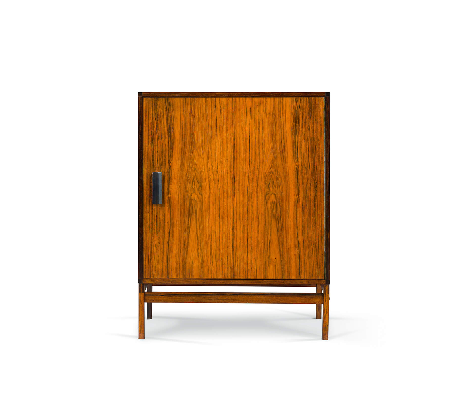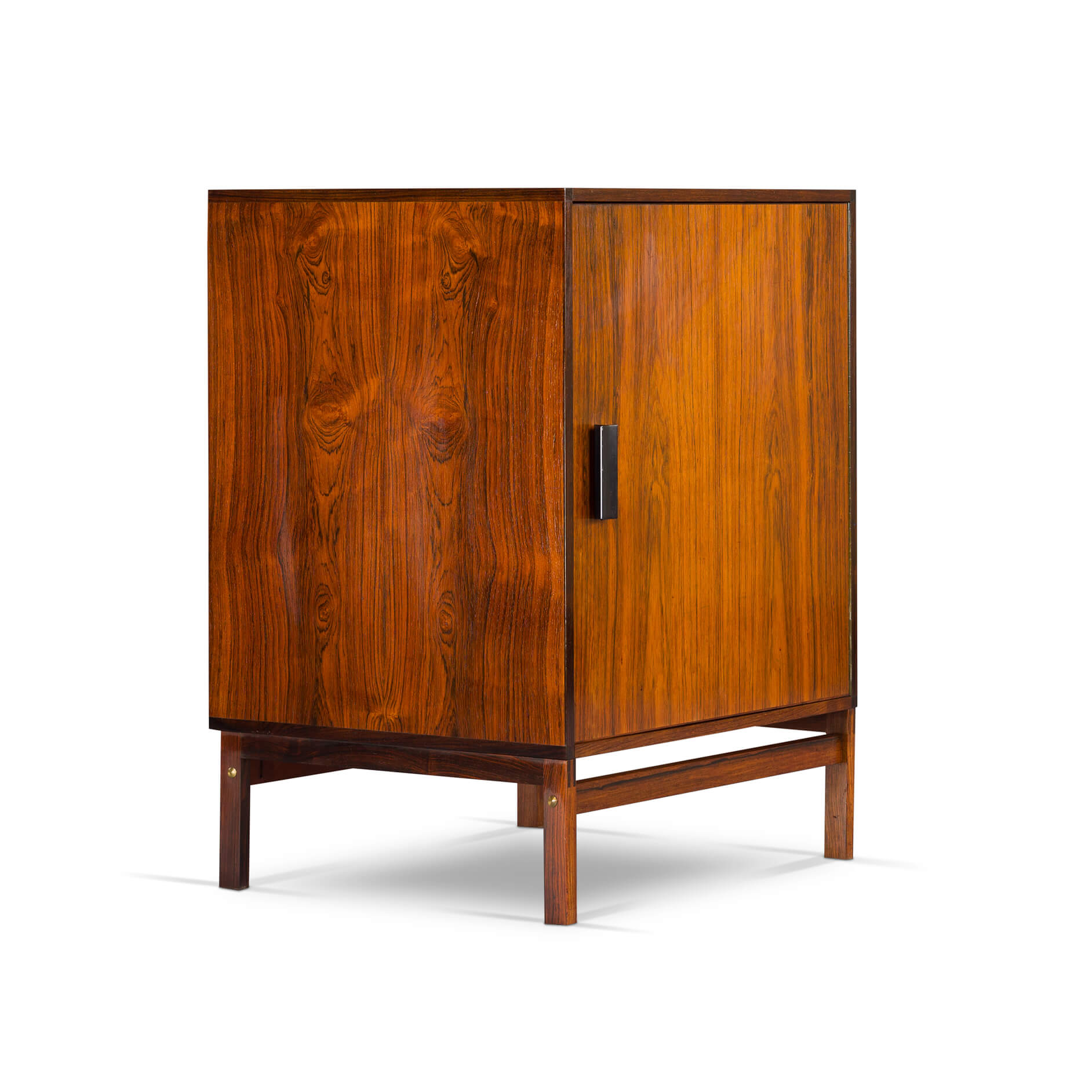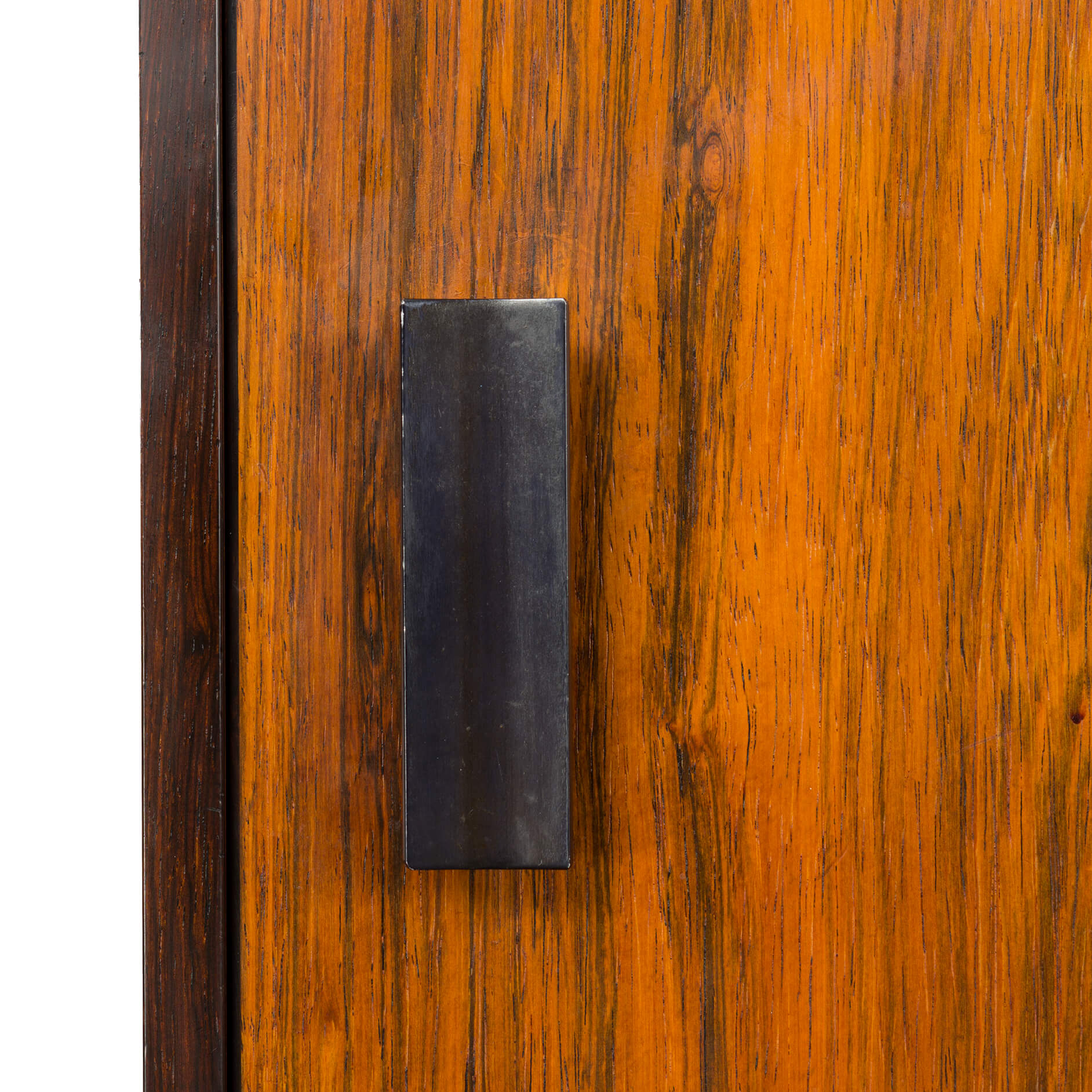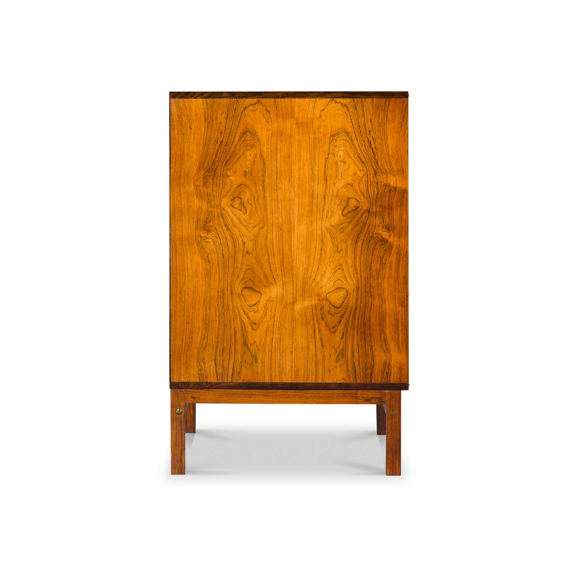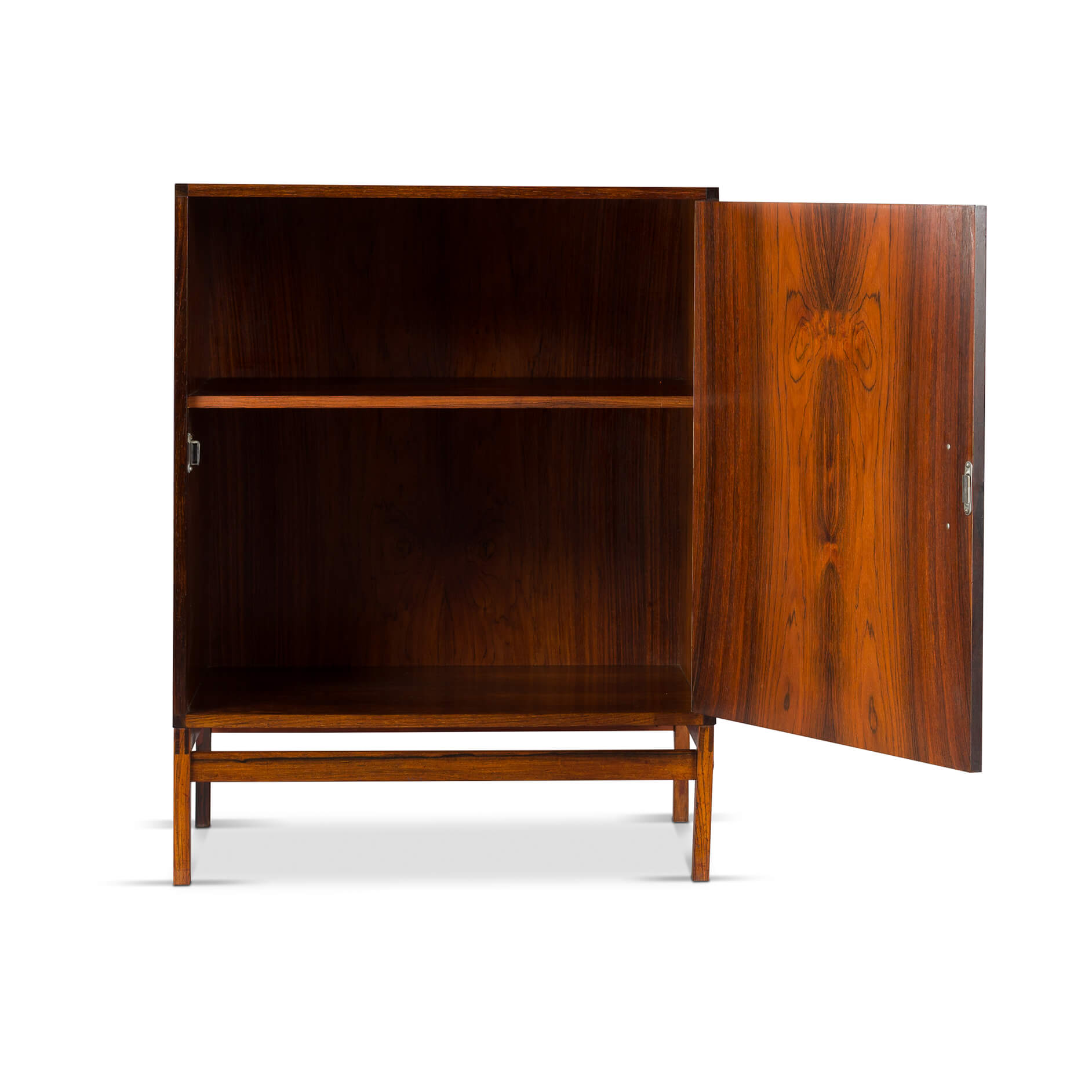 Een fantastische klein palissander dressoir/kast gemaakt in Denemarken door B&L. De kast is uitgevoerd in stijlvol rozenhout met een rustig patroon. Bergruimte bevindt zich achter de deur die sluit met een magneetsluiting, in de vorm van één plank. De greep op de deur is gemaakt van gecoat aluminium en de schroeven die de basis verbinden zijn gemaakt van brons. Het massieve palissander onderstel kan worden verwijderd en heeft mooie constructiedetails!