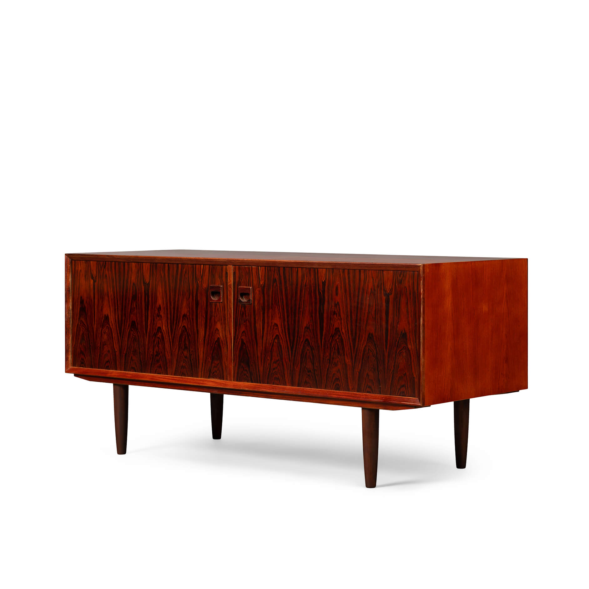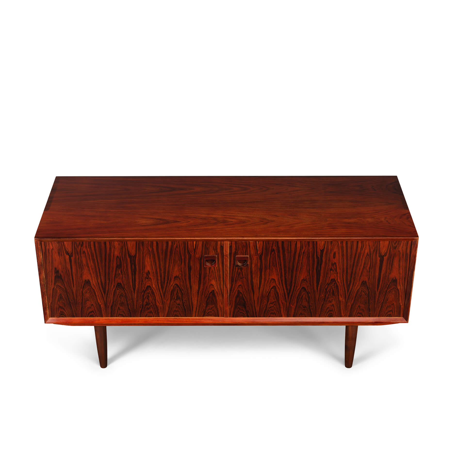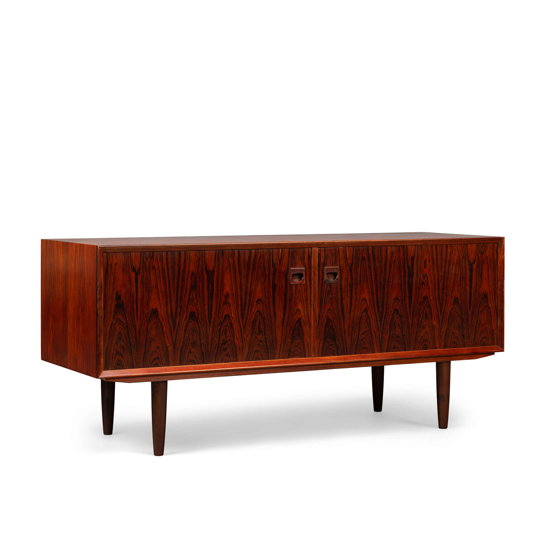 Wow wat een eye catcher! Deze lage Brouer kast gemaakt van rozenhout oftewel palissander. Prachtige roodbruine tint met een doorlopende tekening van het hout.