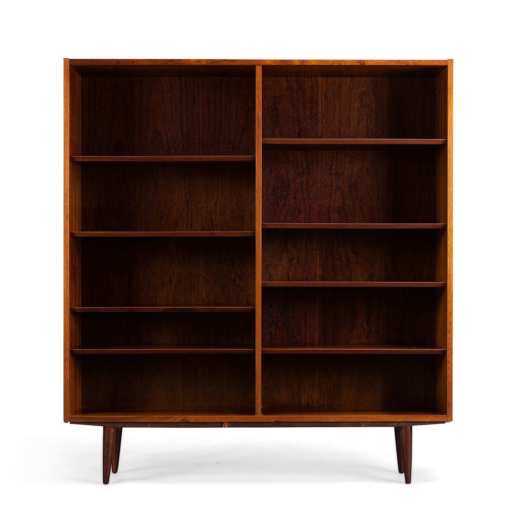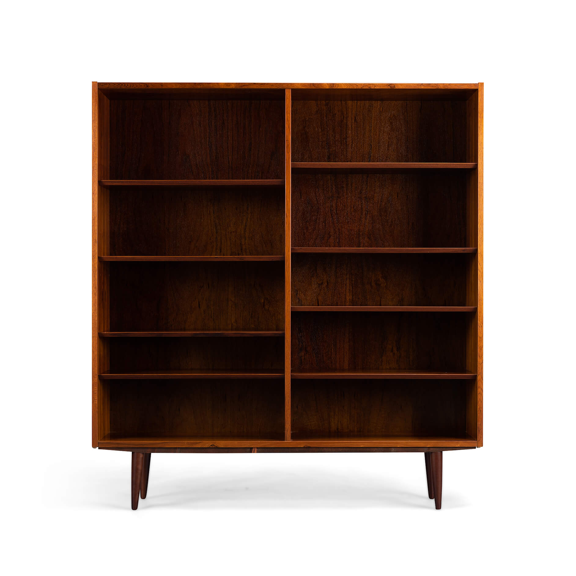 Deense boekenkast in prachtig palissander fineer. Design by Carlo Jensen en gemaakt door Hundevad & Co. Deze boekenkast verkeert in een zeer goede vintage staat en heeft in totaal 8 in hoogte verstelbare planken.