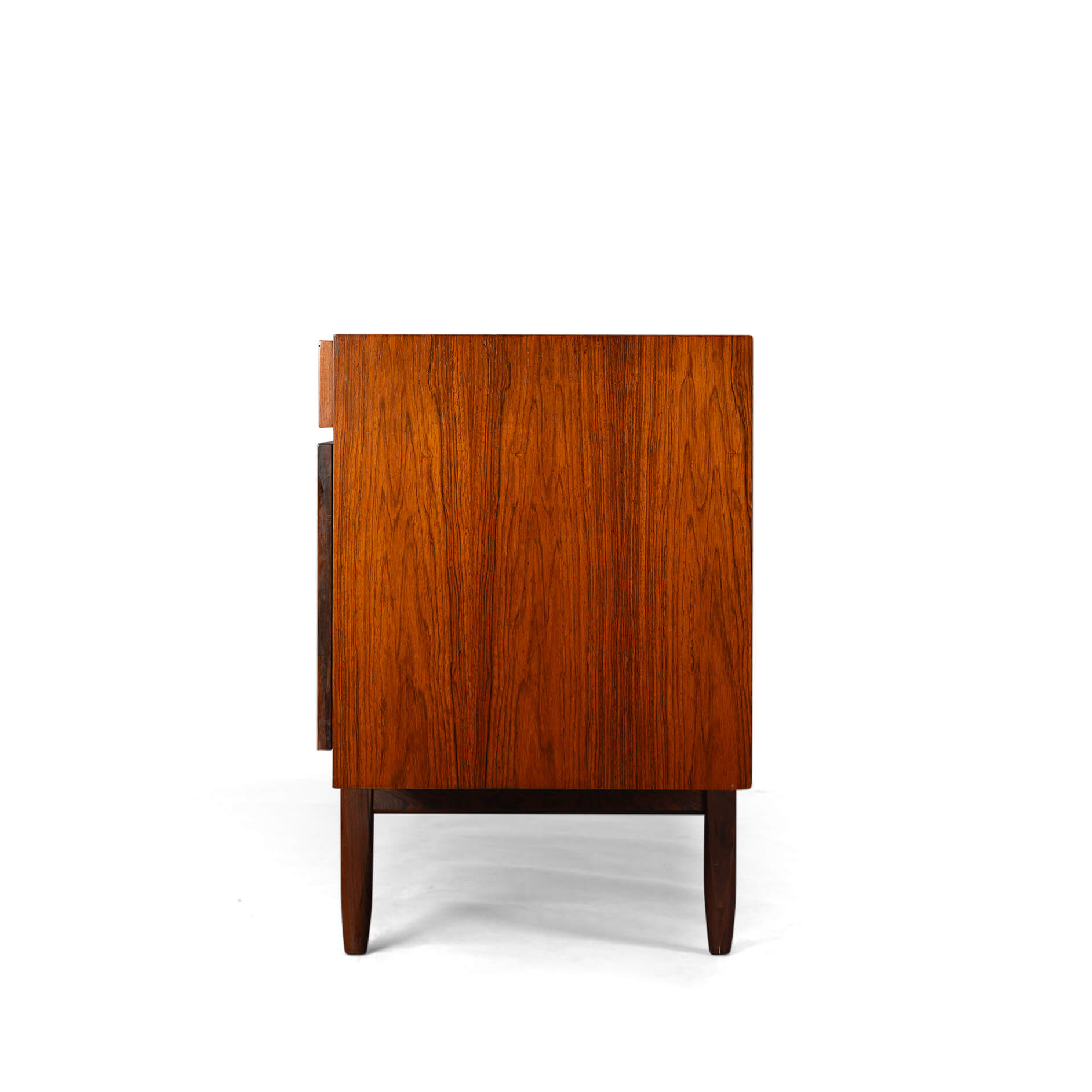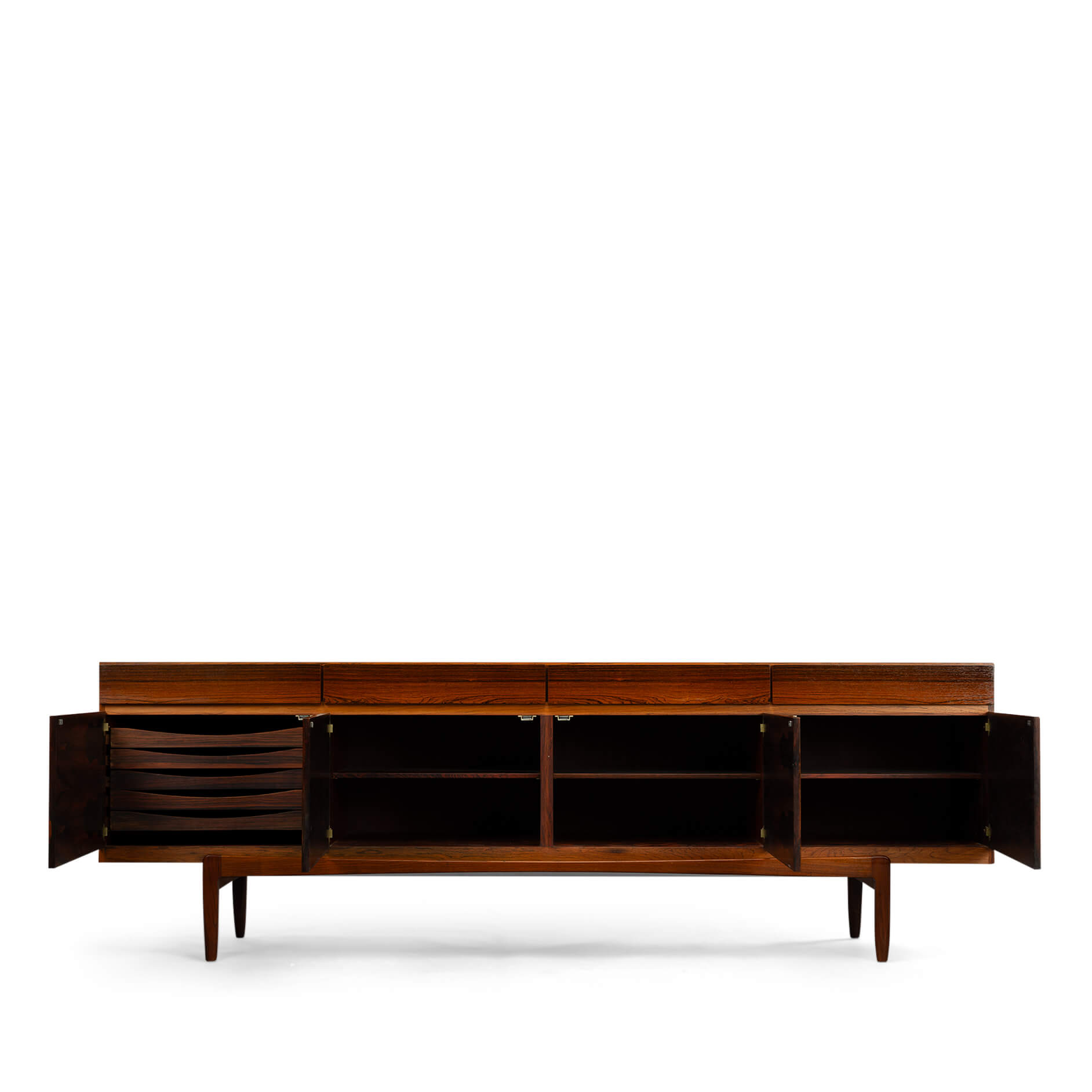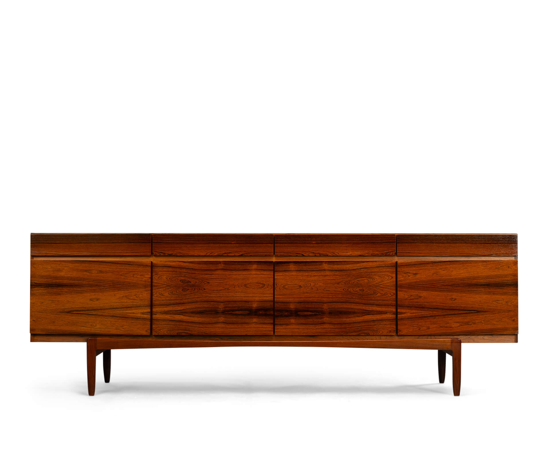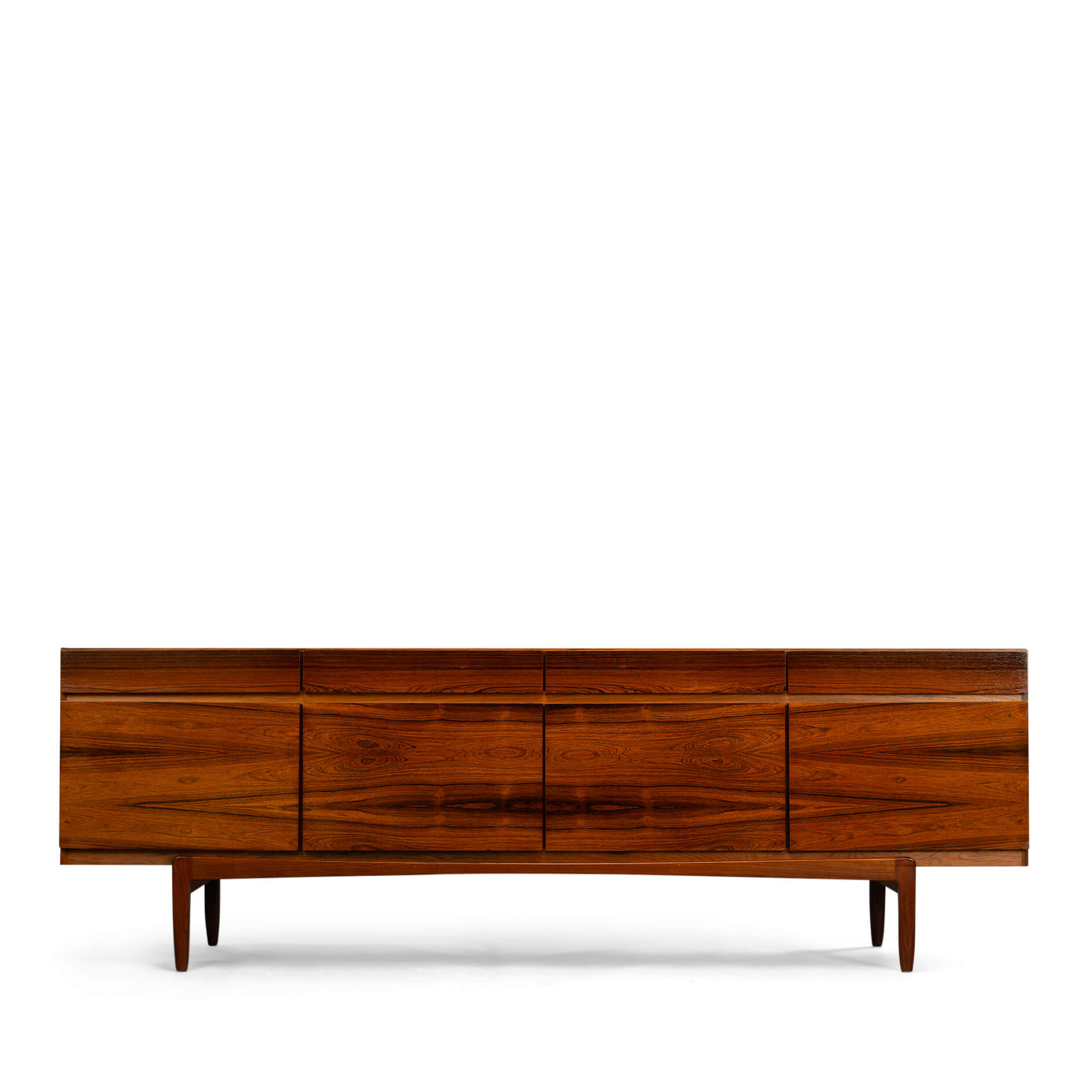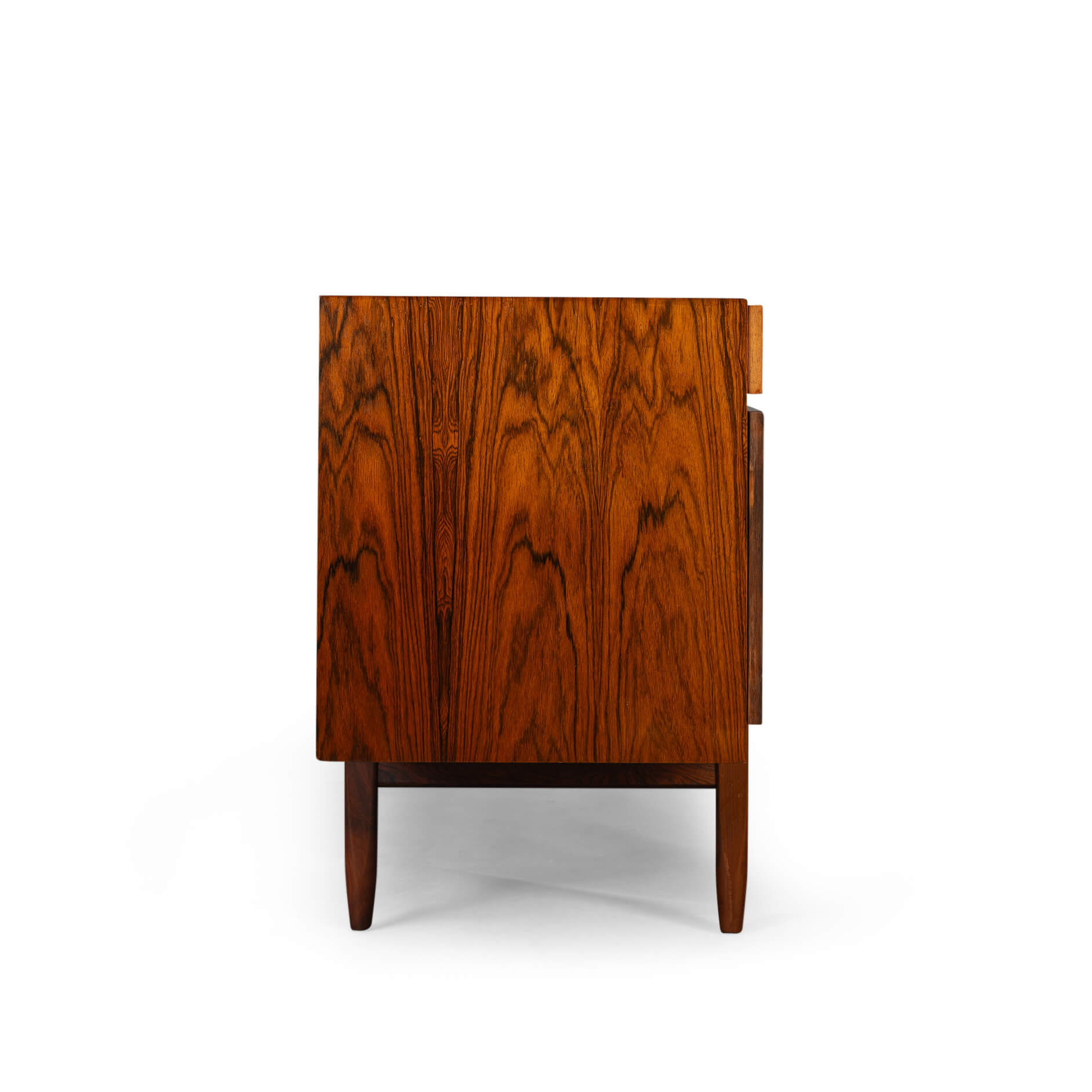 Royalty onder de Deense mid-century design dressoirs is dit bold statement van Ib Kofod Larsen, de FA66. Geen lijn teveel, geen greep erop, geen frutsels, alles staat in dienst van de visuele beleving van dit prachtige vintage dressoir. Onderverdeeld in vier laden en vier deuren uitgevoerd met een palissander fineer met vibrante print die alle zintuigen doet zinderen.