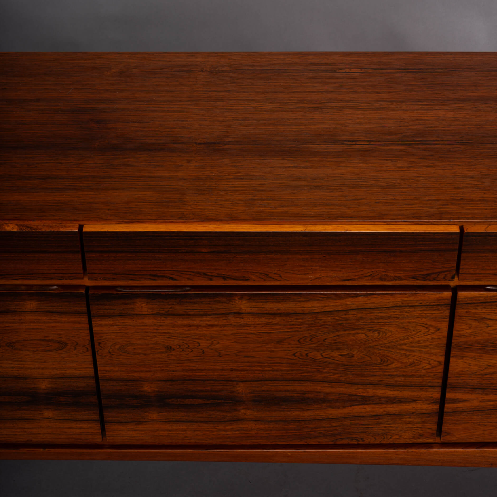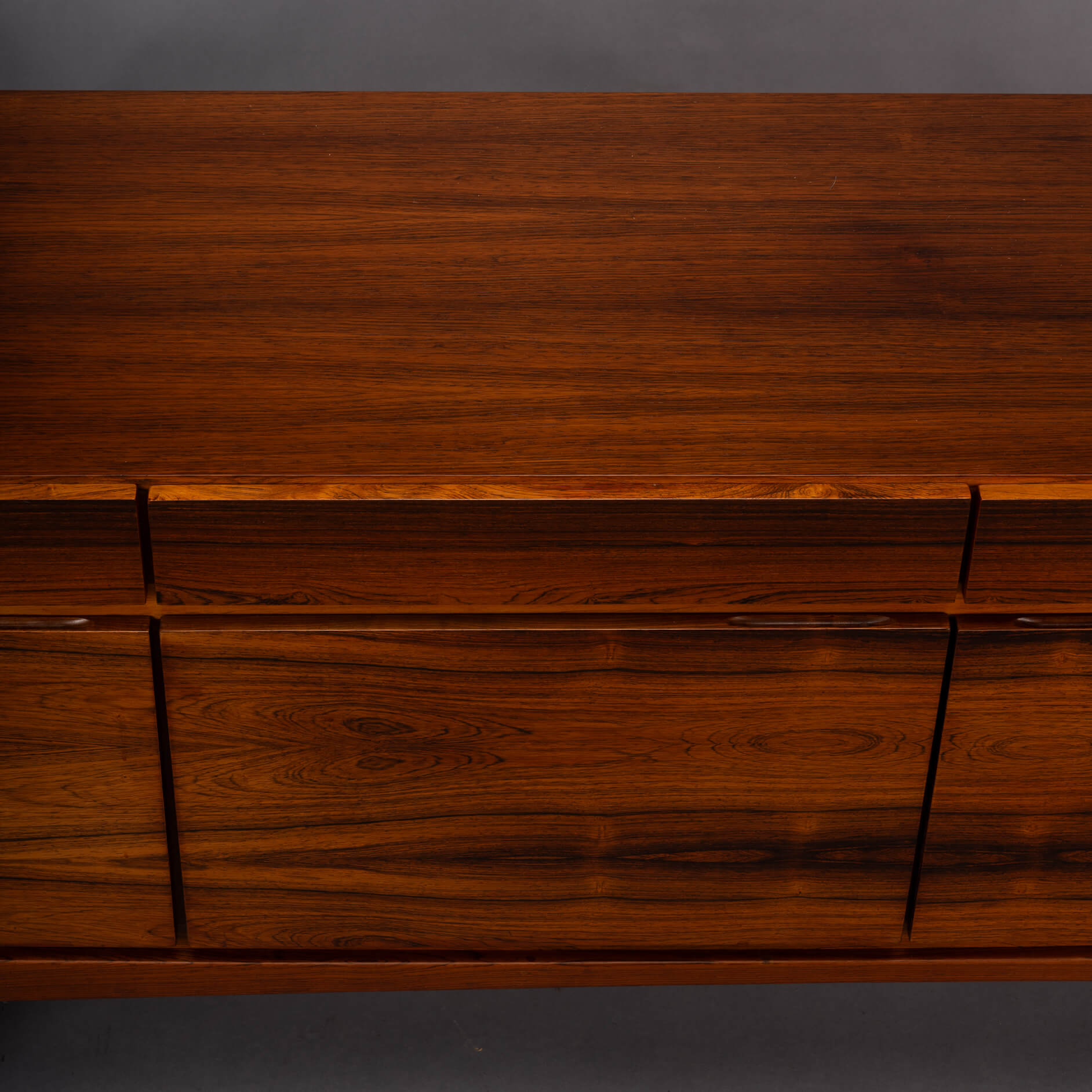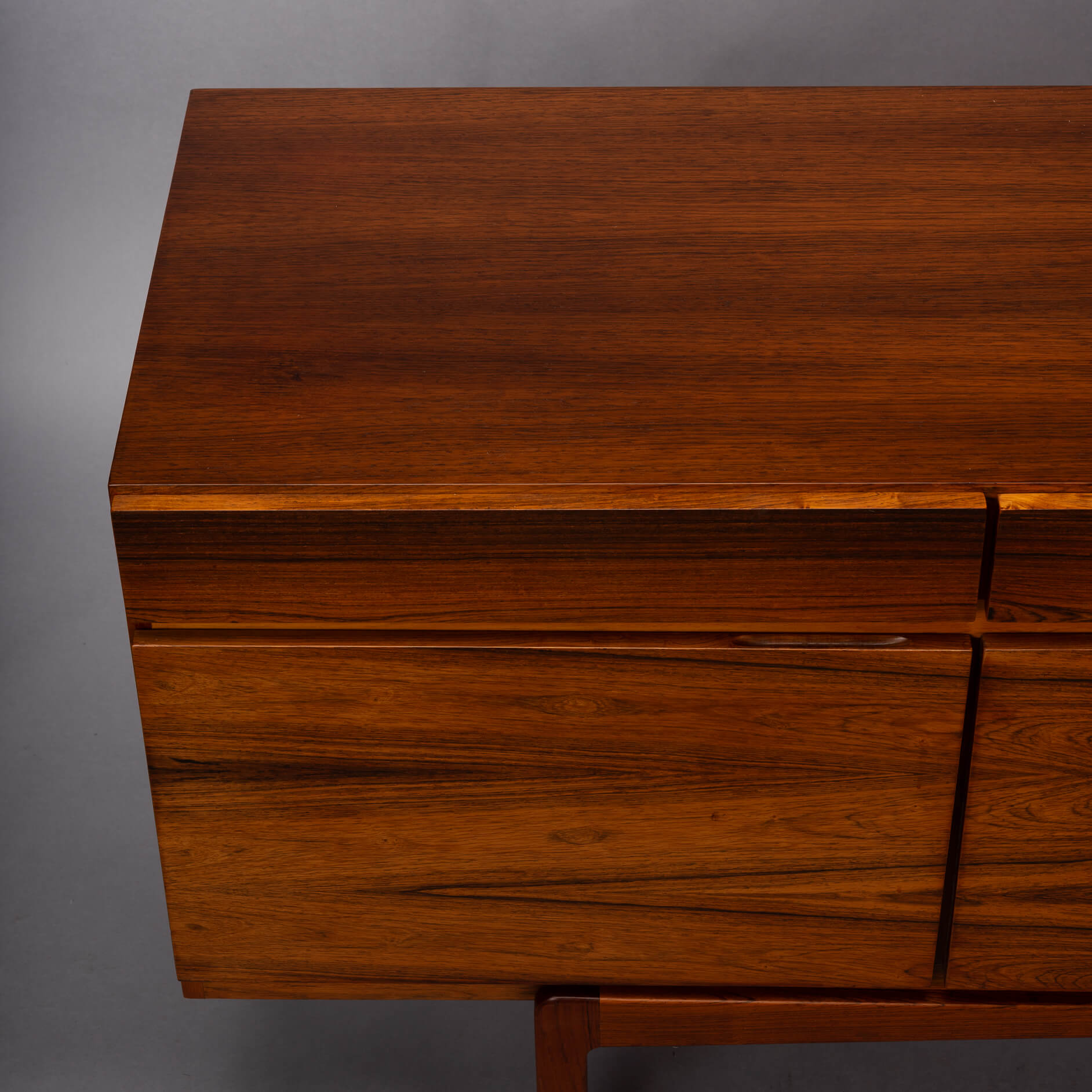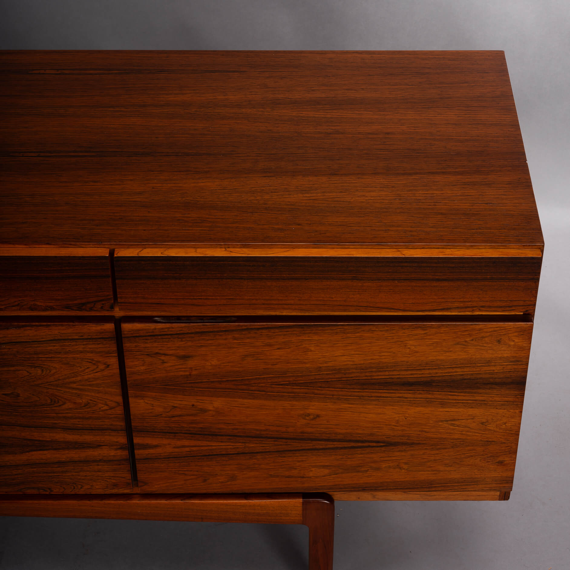 Royalty onder de Deense mid-century design dressoirs is dit bold statement van Ib Kofod Larsen, de FA66. Geen lijn teveel, geen greep erop, geen frutsels, alles staat in dienst van de visuele beleving van dit prachtige vintage dressoir. Onderverdeeld in vier laden en vier deuren uitgevoerd met een palissander fineer met vibrante print die alle zintuigen doet zinderen.