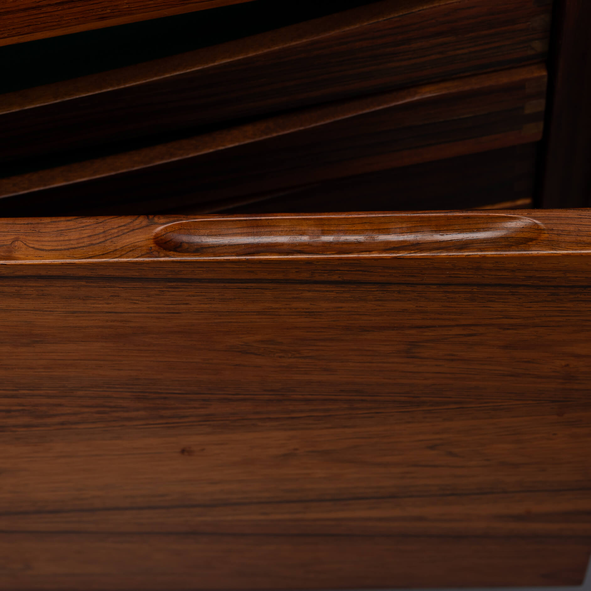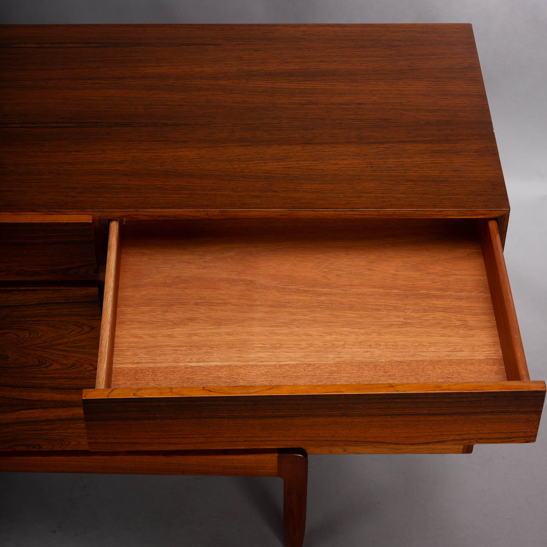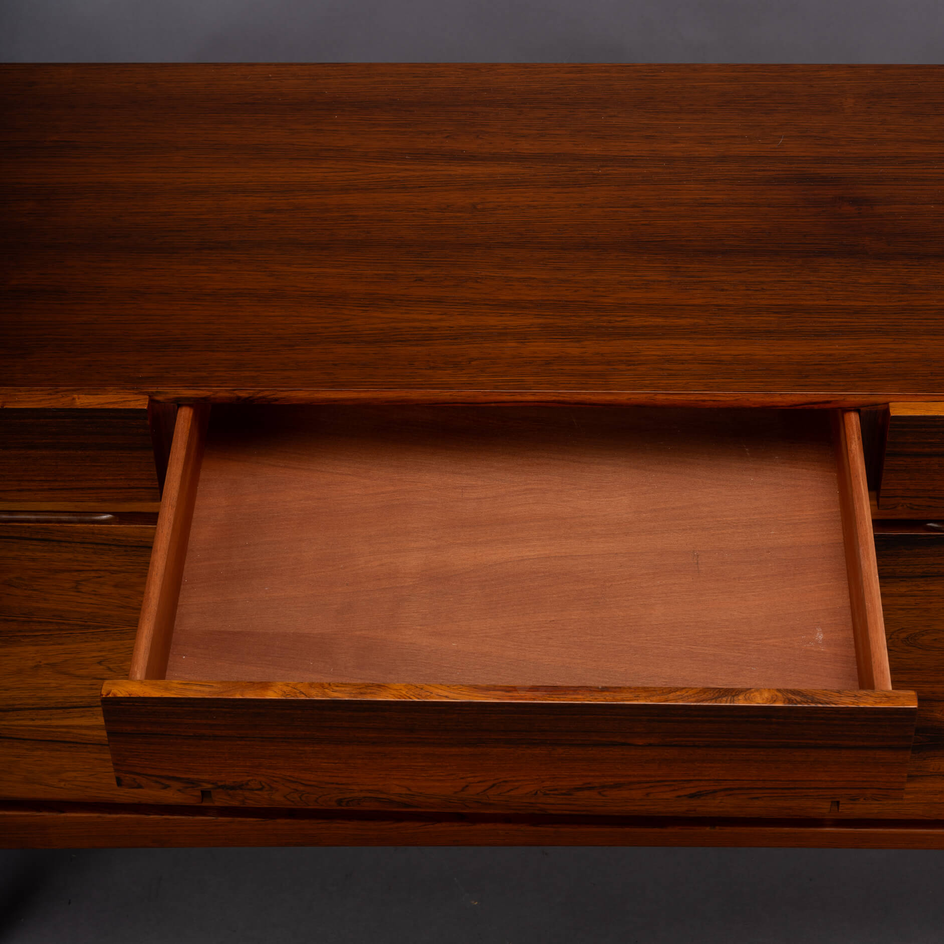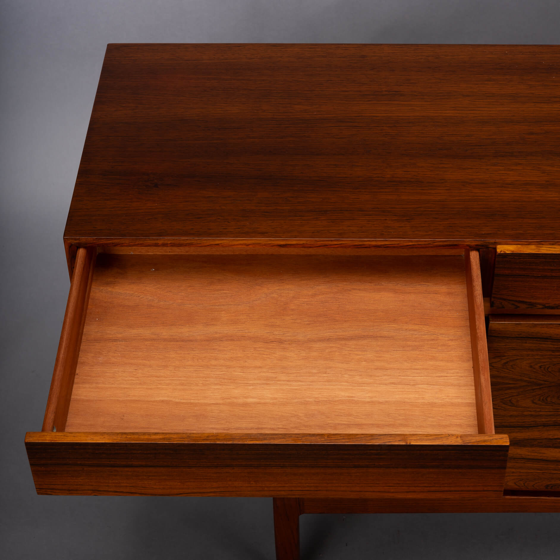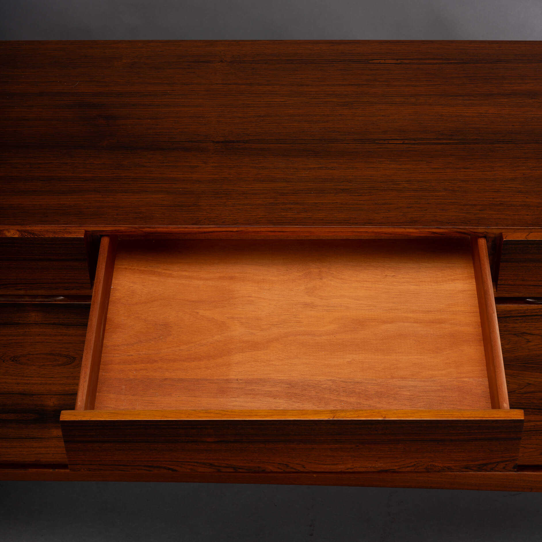 Royalty onder de Deense mid-century design dressoirs is dit bold statement van Ib Kofod Larsen, de FA66. Geen lijn teveel, geen greep erop, geen frutsels, alles staat in dienst van de visuele beleving van dit prachtige vintage dressoir. Onderverdeeld in vier laden en vier deuren uitgevoerd met een palissander fineer met vibrante print die alle zintuigen doet zinderen.