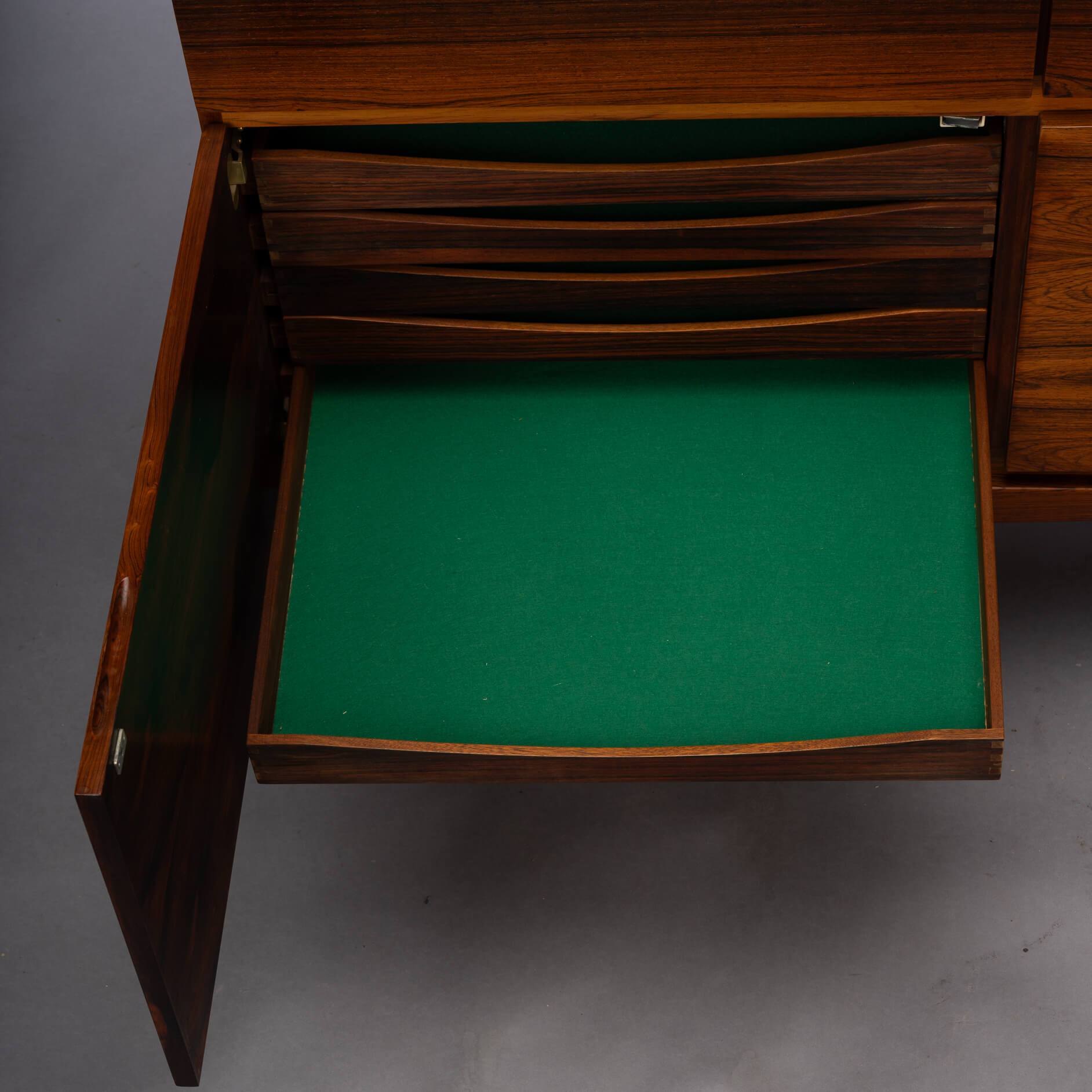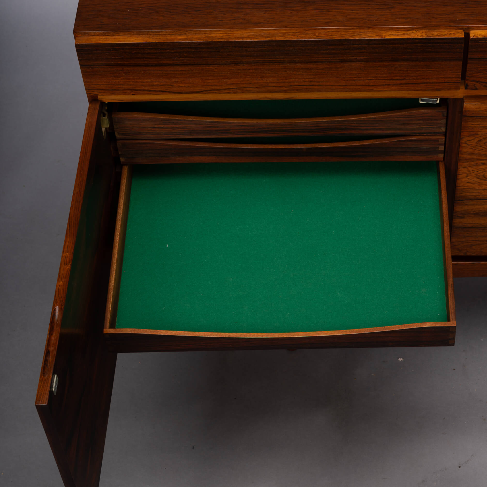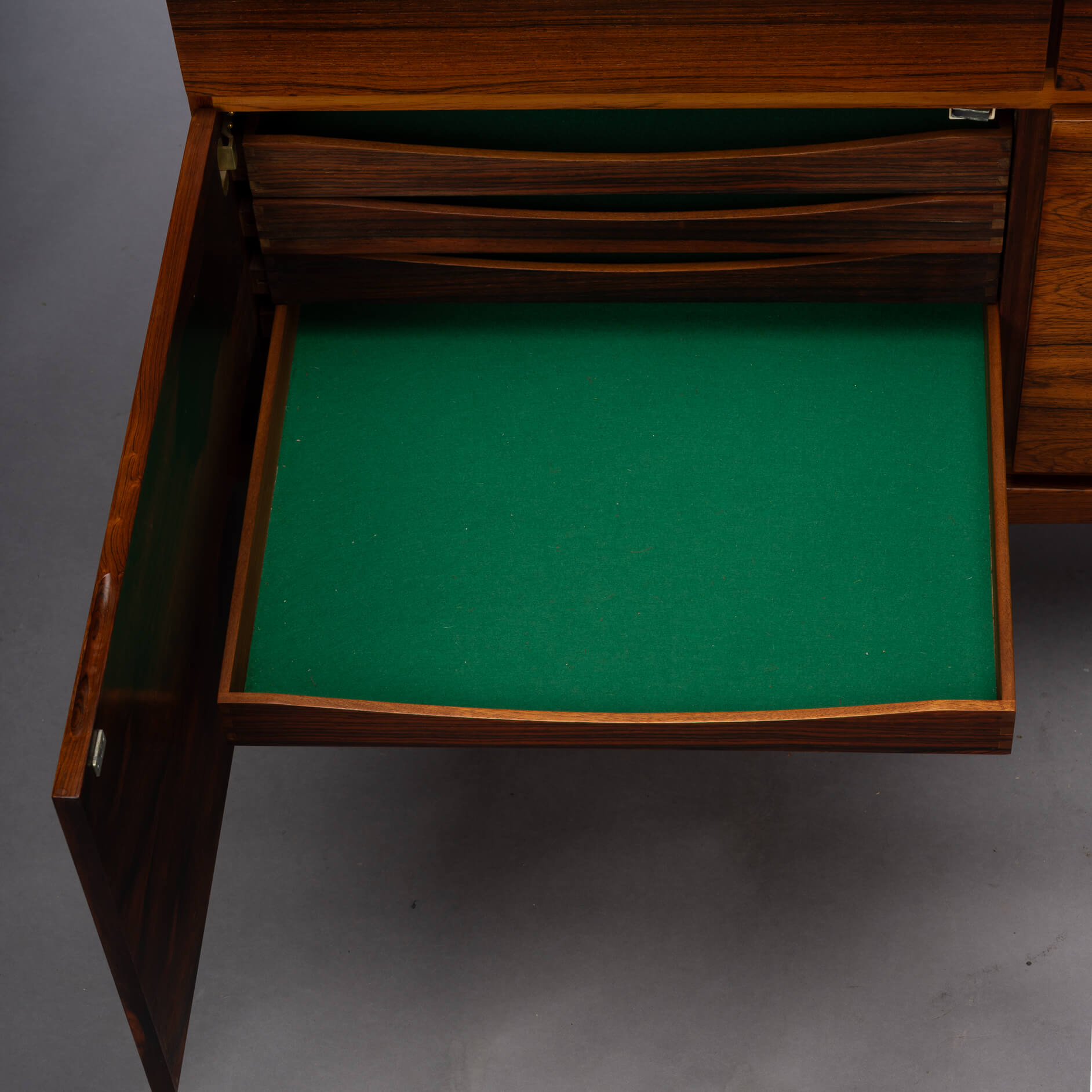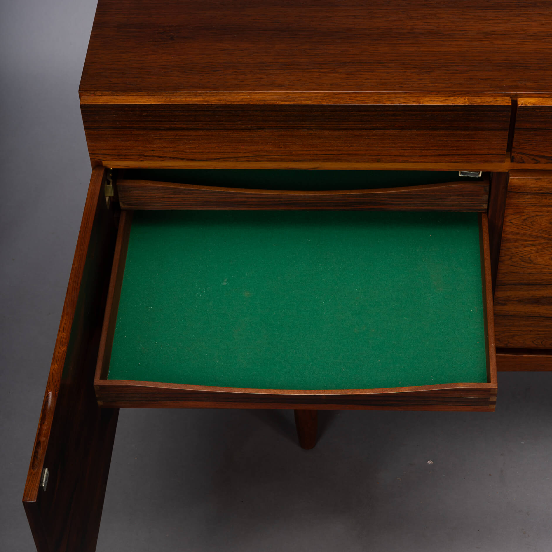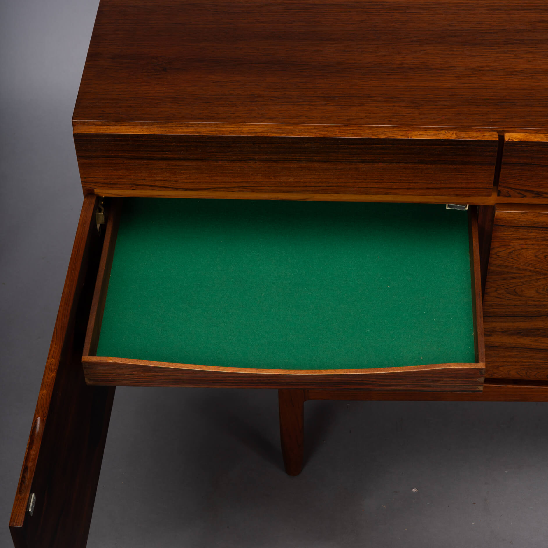 Je merkt, wij zien dit topstuk wel zitten, en we zijn niet de enige. Queen Elisabeth was zo onder de indruk van deze kast en designer dat ze er ook één haar palace liet binnendragen, groot gelijk! Wij hebben de bovenkant opnieuw professioneel laten spuiten met een hoogwaardige cellulose coating. Meer was ook niet nodig, de afgelopen 50 jaar is er op een koninklijke manier met dit door Faarup Møbelfabrik geproduceerde pronkstuk omgegaan :-)
