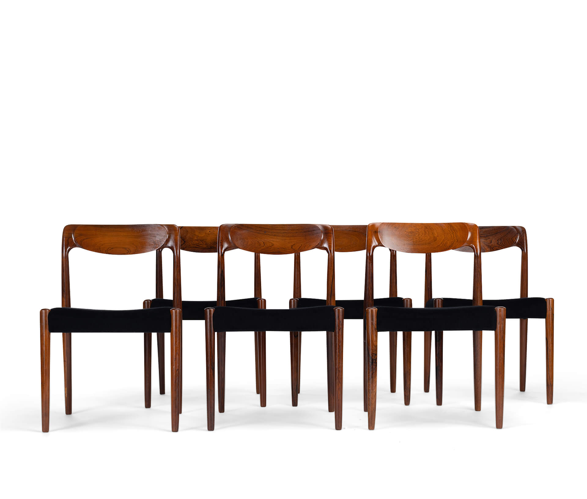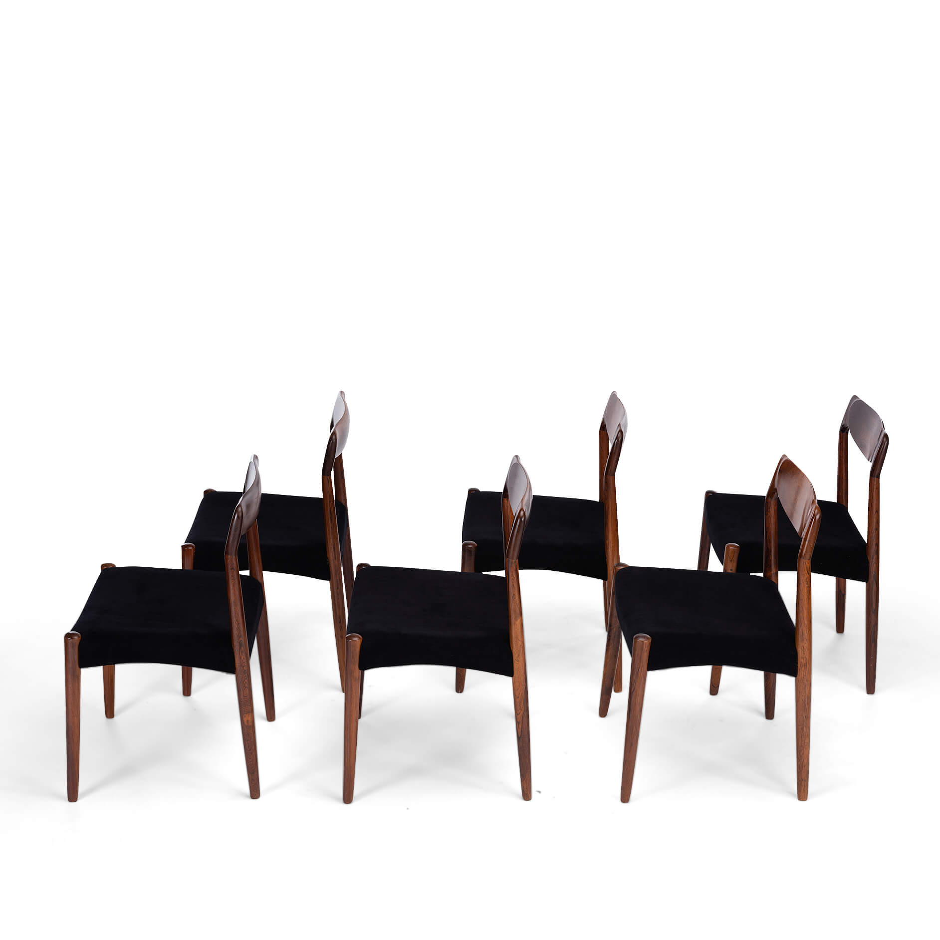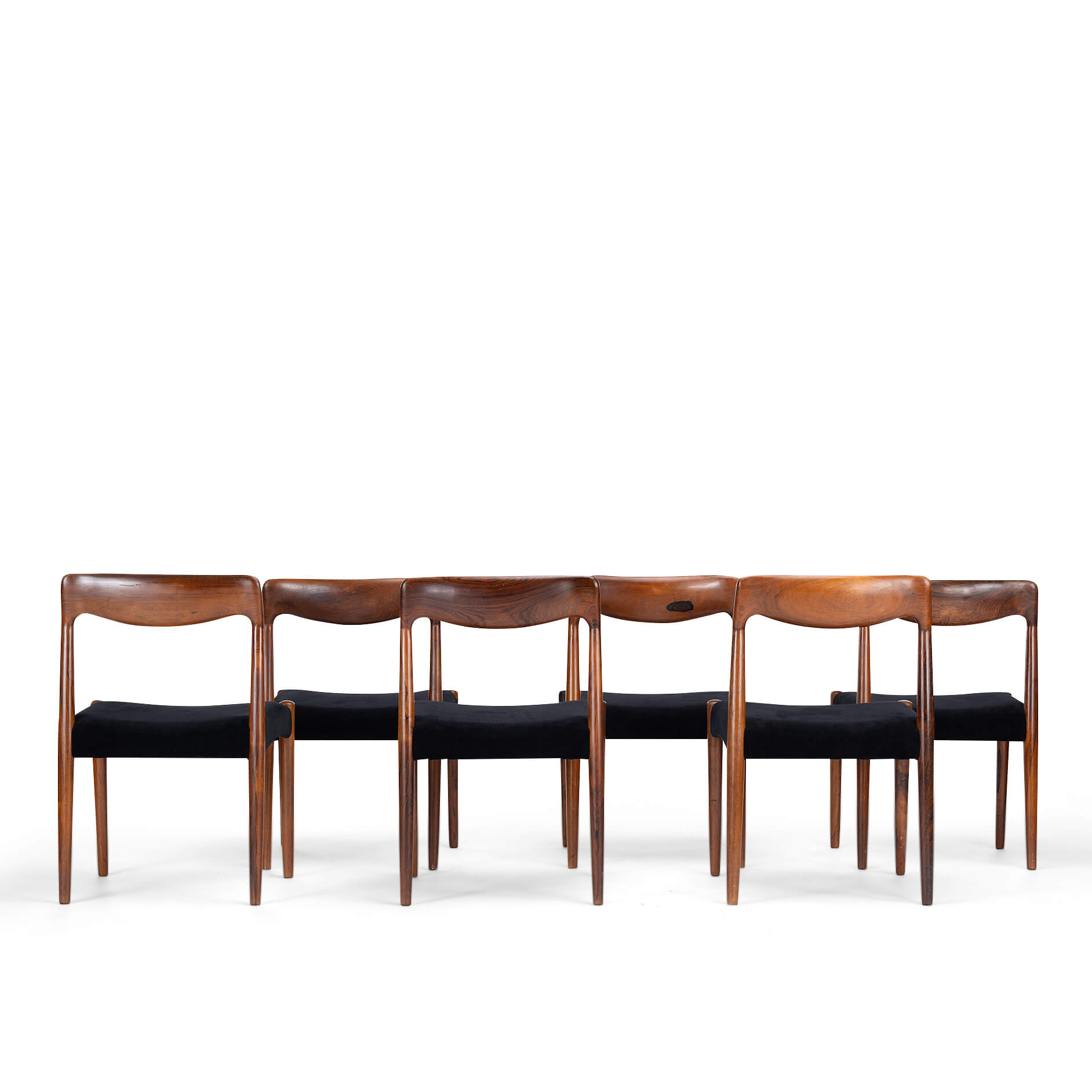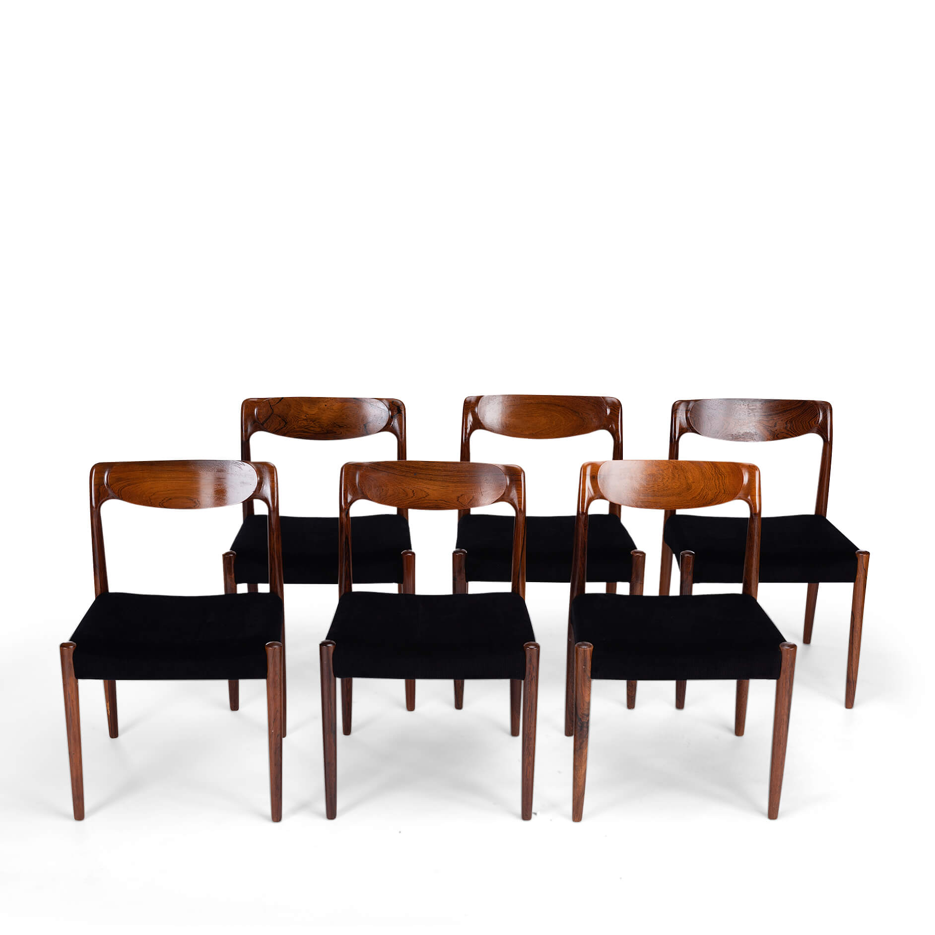 Een set van zes Deense stoelen gemaakt van prachtig palissander. Let op de massief palissander rugleuningen, die op een organische manier zijn ingefreesd. Voor ons zijn helaas de designer en maker onbekend. De stickers die vaak werden gebruikt in de jaren 60 aan de onderkant van de stoel, zijn er inmiddels afgevallen. We hebben deze stoelen professioneel laten herstofferen. Ook het binnenwerk van deze stoelen is volledig vernieuwd, met polyether van 2 cm dik en afgedekt met 100 grams Dacron.
