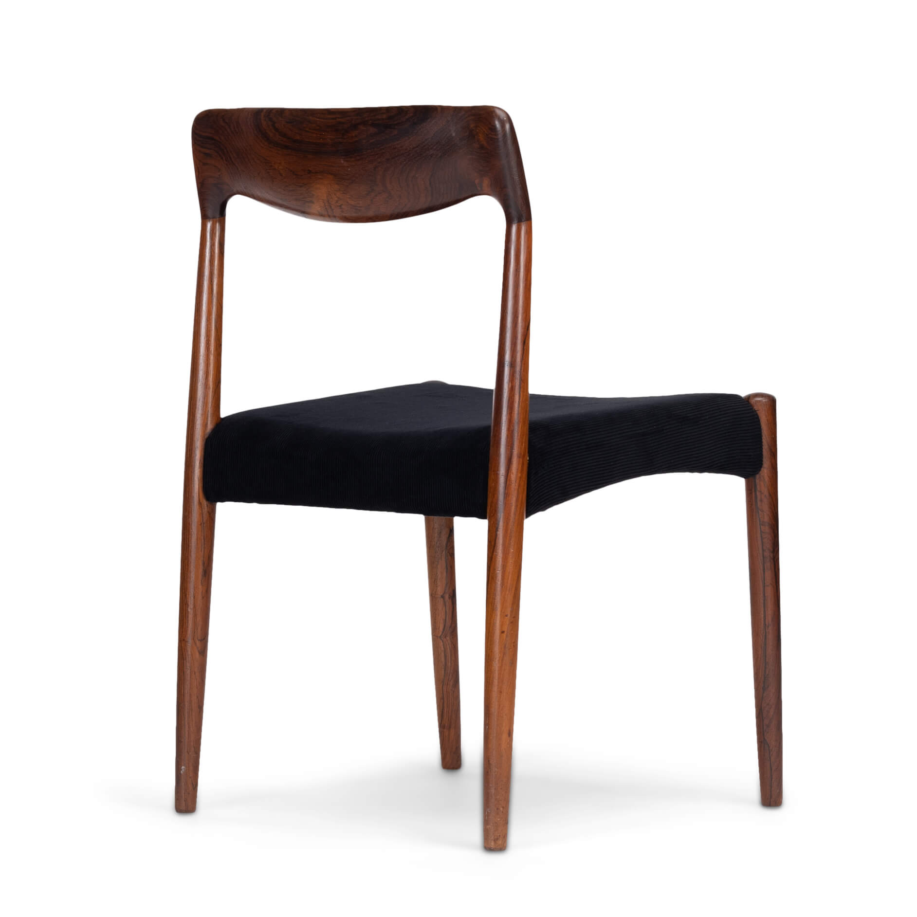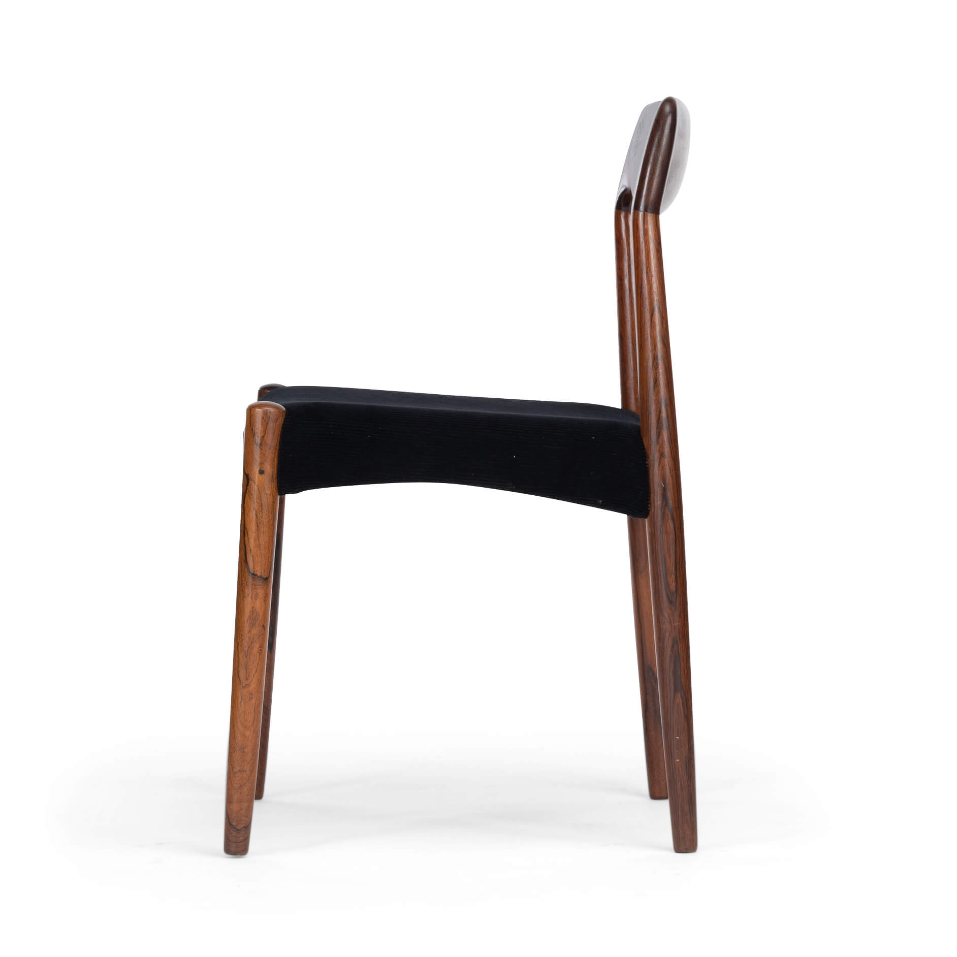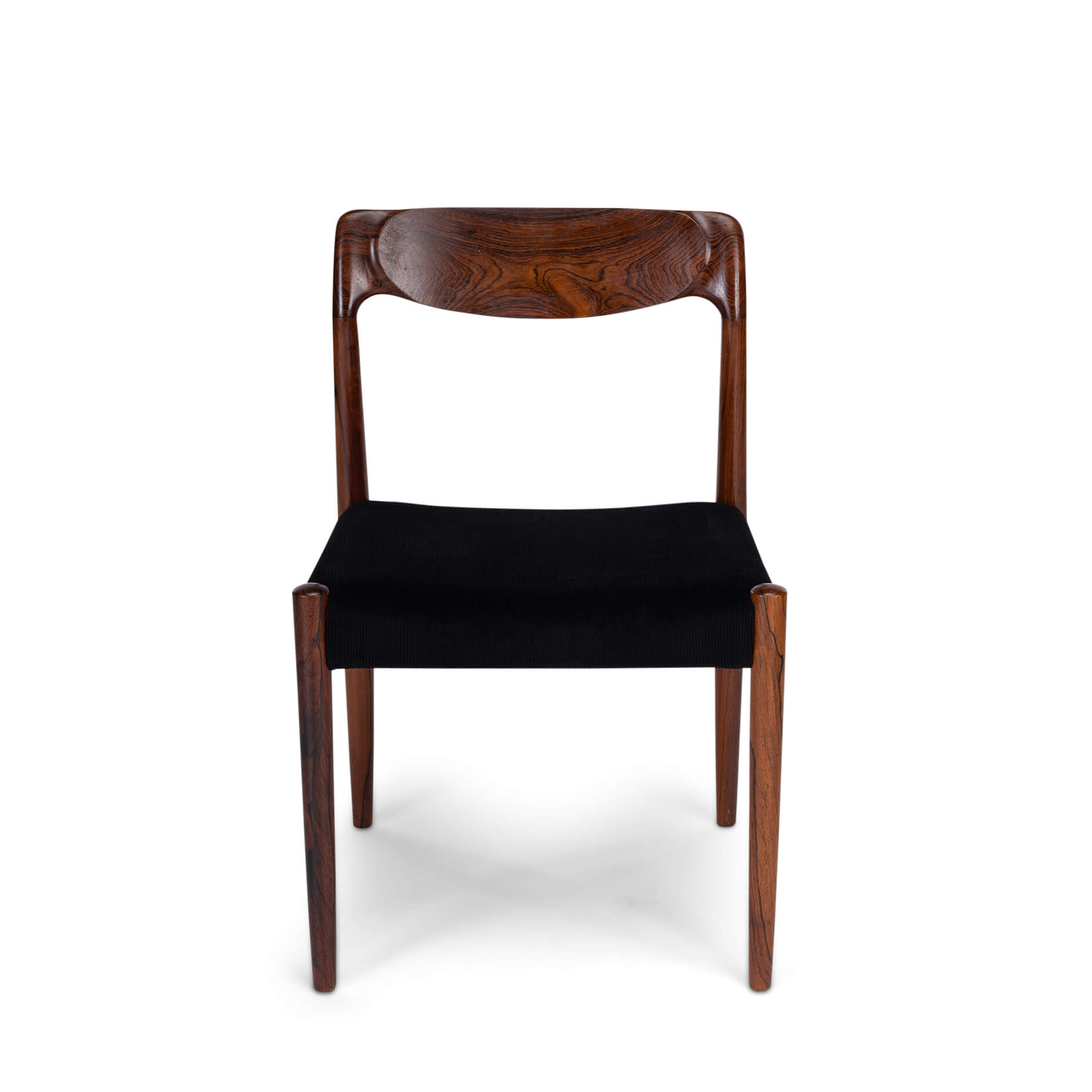 Een set van zes Deense stoelen gemaakt van prachtig palissander. Let op de massief palissander rugleuningen, die op een organische manier zijn ingefreesd. Voor ons zijn helaas de designer en maker onbekend. De stickers die vaak werden gebruikt in de jaren 60 aan de onderkant van de stoel, zijn er inmiddels afgevallen. We hebben deze stoelen professioneel laten herstofferen. Ook het binnenwerk van deze stoelen is volledig vernieuwd, met polyether van 2 cm dik en afgedekt met 100 grams Dacron.