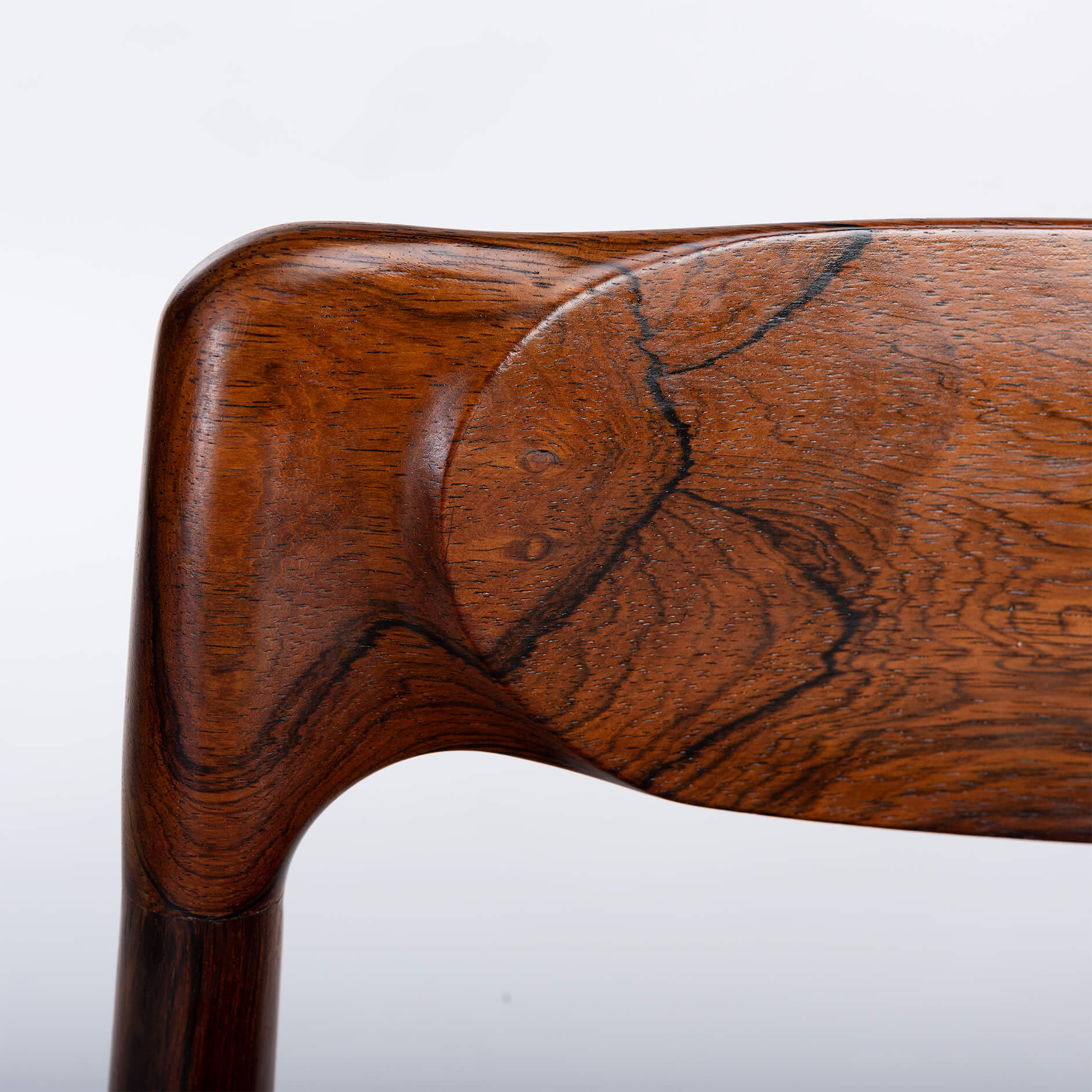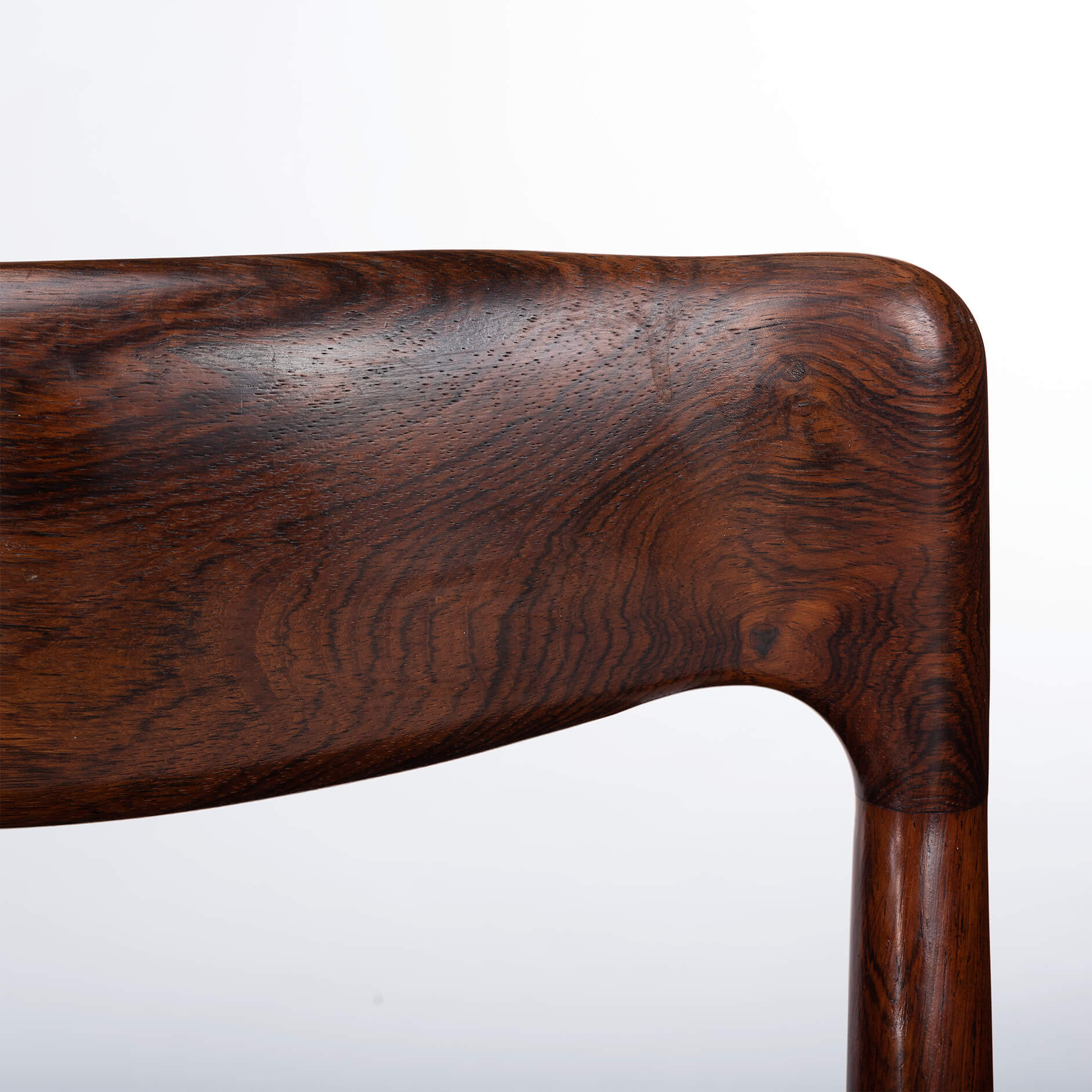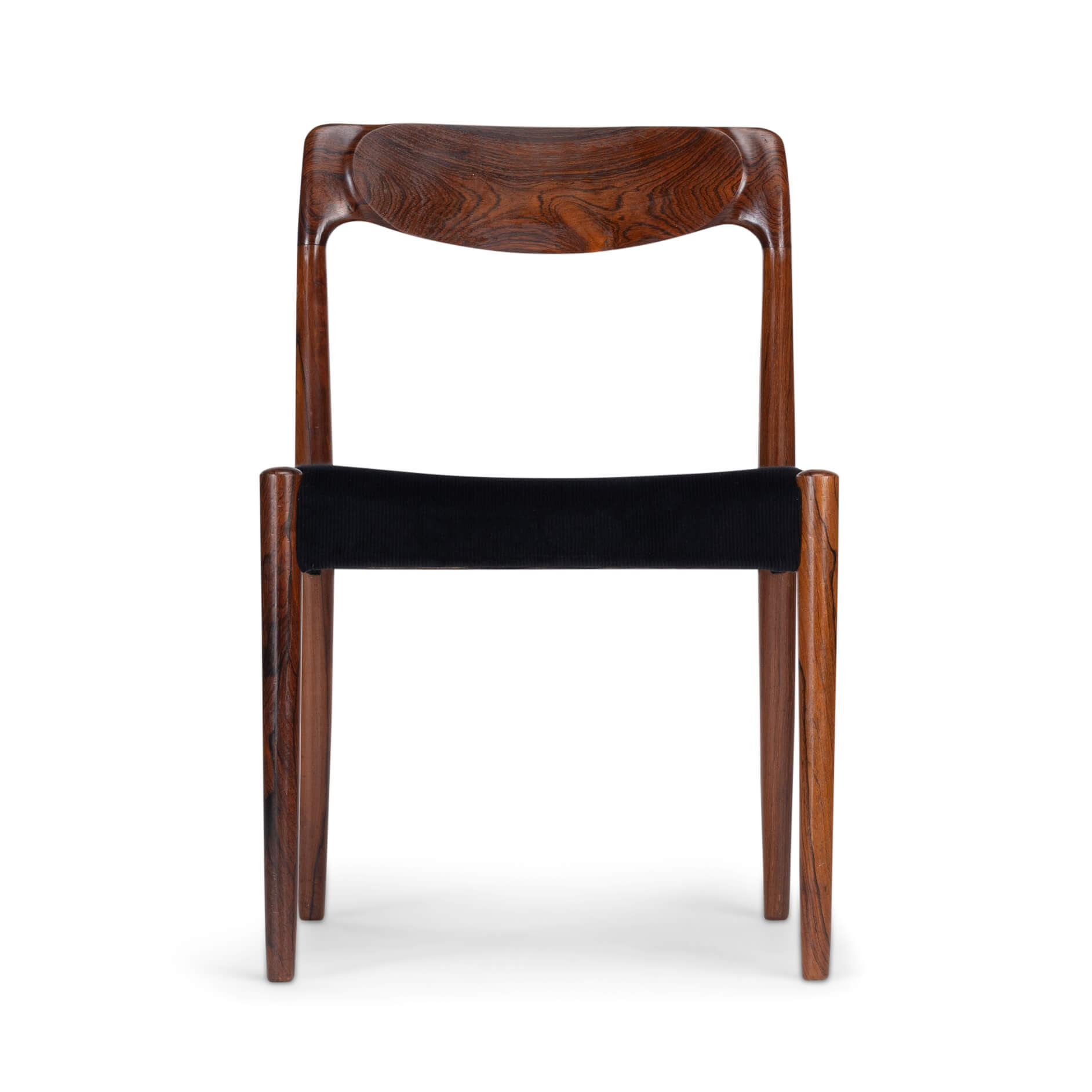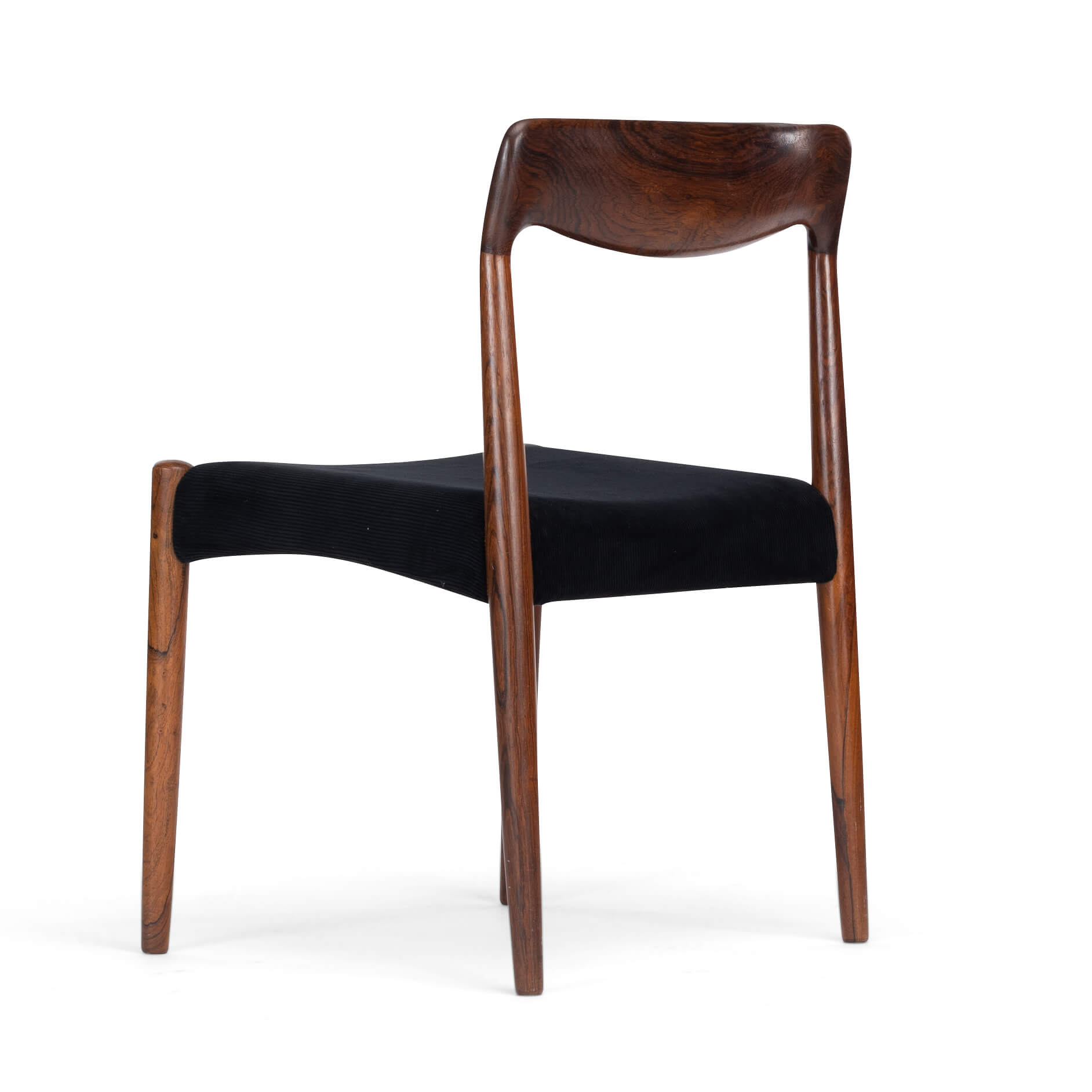 Een set van zes Deense stoelen gemaakt van prachtig palissander. Let op de massief palissander rugleuningen, die op een organische manier zijn ingefreesd. Voor ons zijn helaas de designer en maker onbekend. De stickers die vaak werden gebruikt in de jaren 60 aan de onderkant van de stoel, zijn er inmiddels afgevallen. We hebben deze stoelen professioneel laten herstofferen. Ook het binnenwerk van deze stoelen is volledig vernieuwd, met polyether van 2 cm dik en afgedekt met 100 grams Dacron.