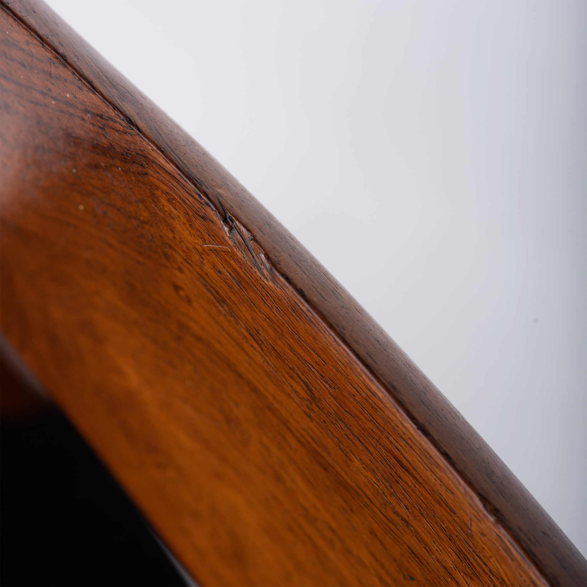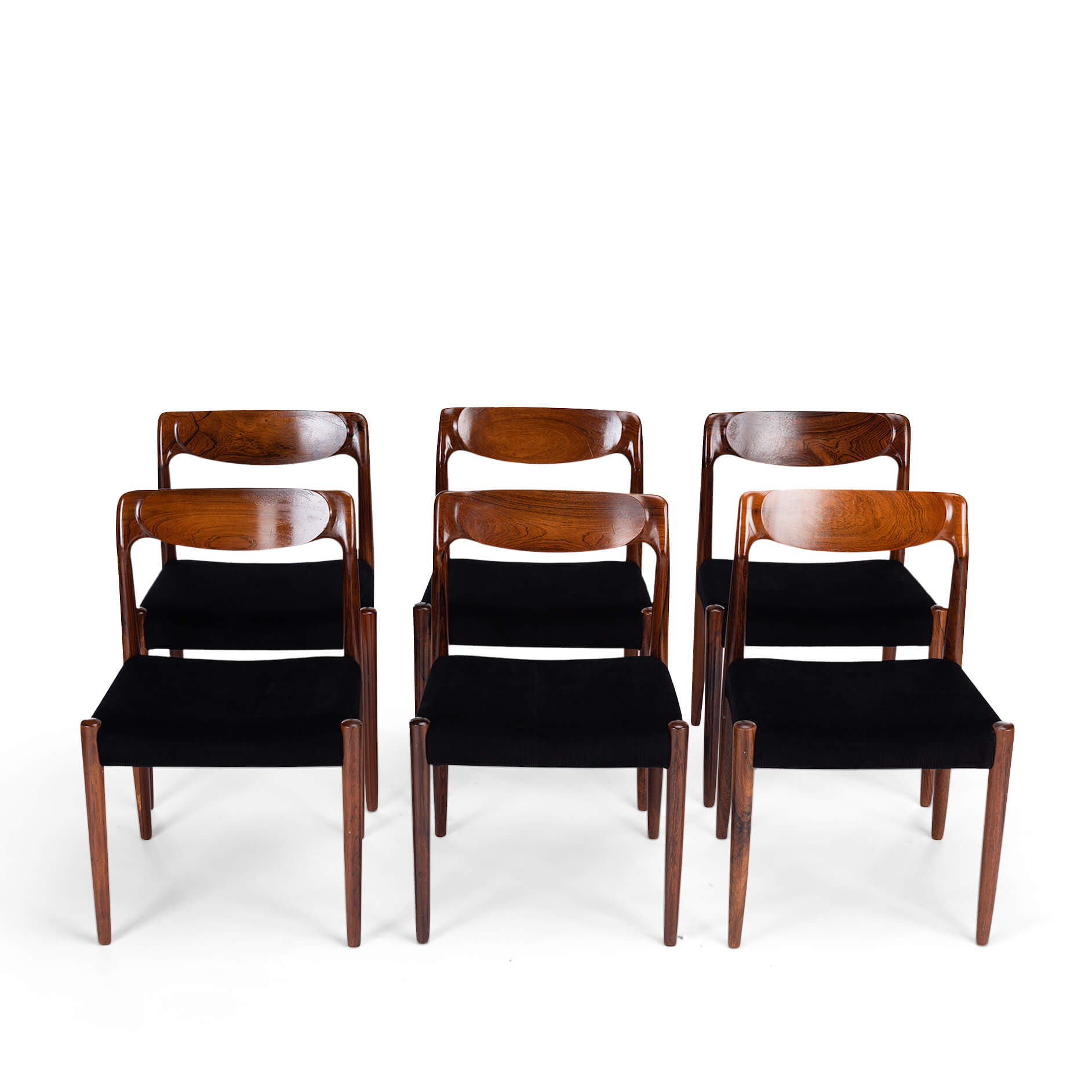 - Deze zes geherstoffeerde design stoelen verkeren in een zeer goede vintage conditie. Eén van de stoelen heeft een donkere ovale verkleuring op de achterkant van de rugleuning. Dit is een zwarte houtlijn in het palissander. Deze stoel heeft ook een kleine beschadiging van het hout. Zie foto´s.