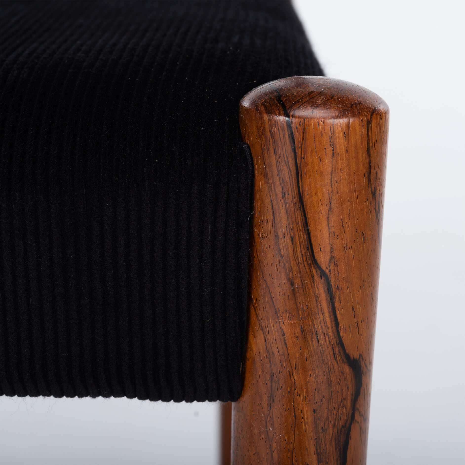 De gekozen stof is Cordova 2 van Gispen Originals by Lancier van kleur 9011. De smalle ribstof - die destijds ontwerper Willem Gispen persoonlijk inkocht bij producent ‘Van Heek Schuttersveld’ - maakt een mooie comeback. Deze corduroy staat onomwonden voor een stukje Nederlandse Textielhistorie.