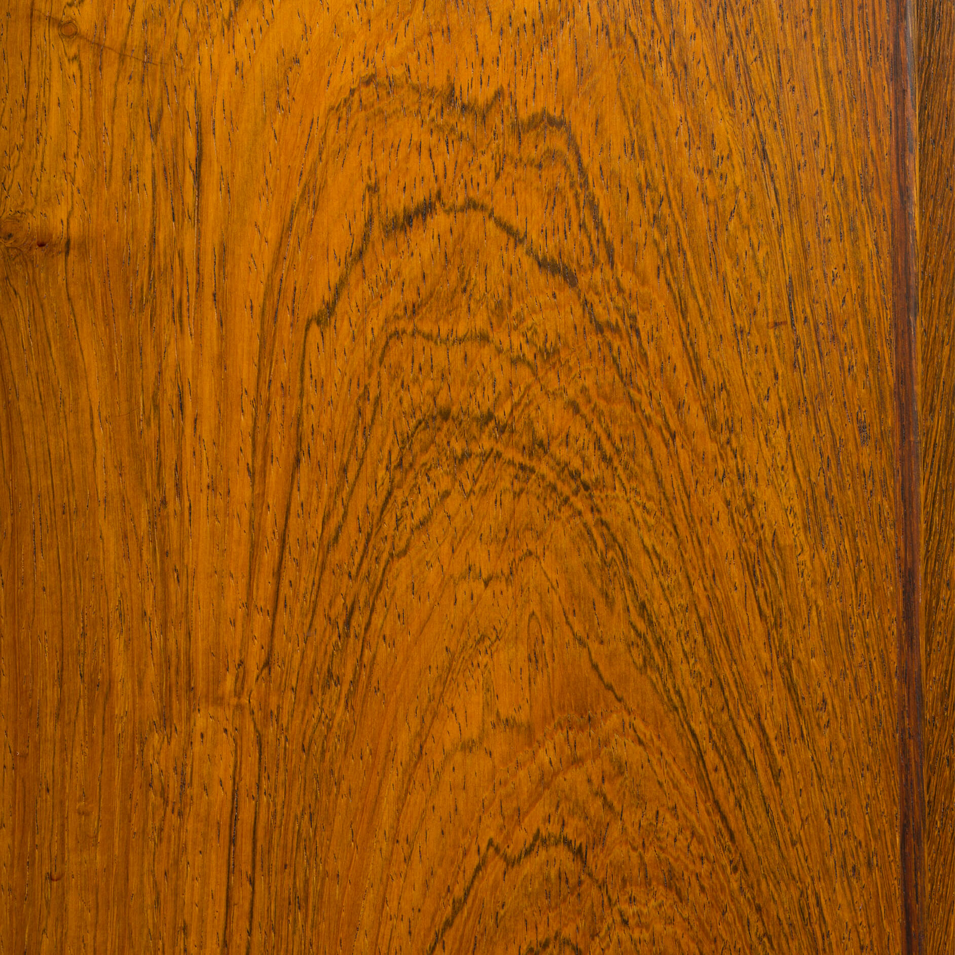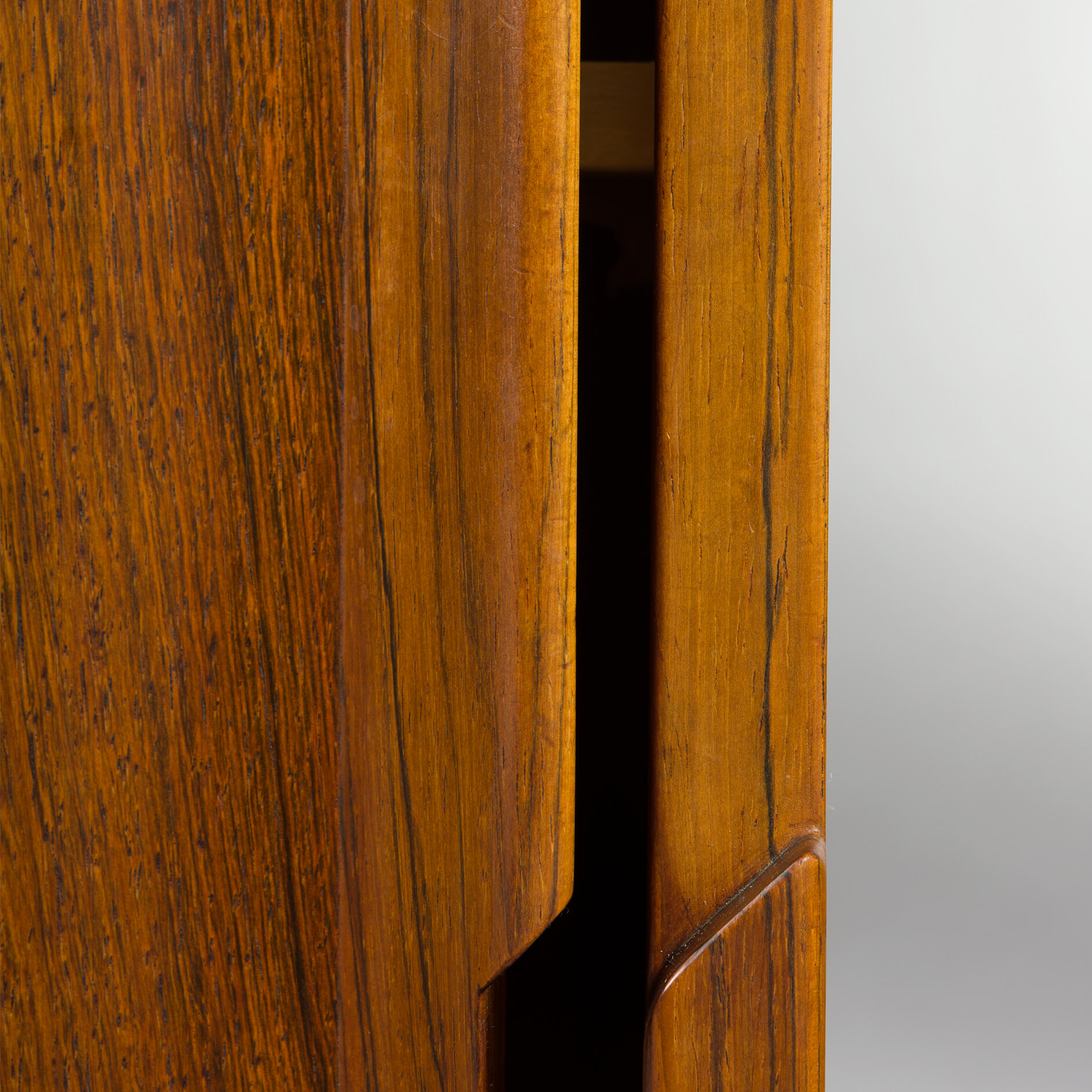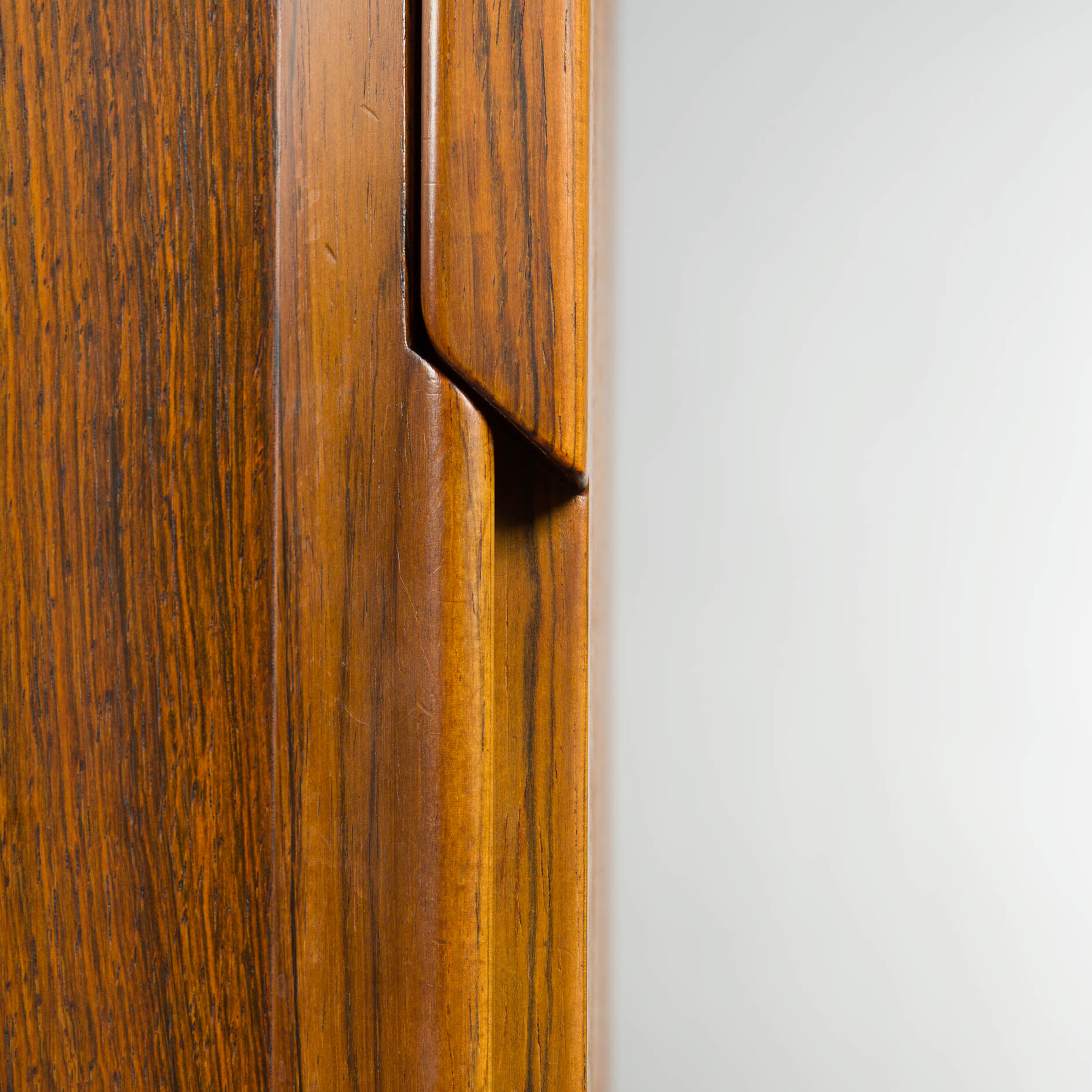 Het design komt bij de twee middelste schuifdeuren tot uiting in mooi gevormde massieve grepen over de gehele hoogte van de kast. Oja, palissander wordt door de Engelsen rosewood genoemd en is inmiddels een beschermde houtsoort. Lees er hier meer over.
