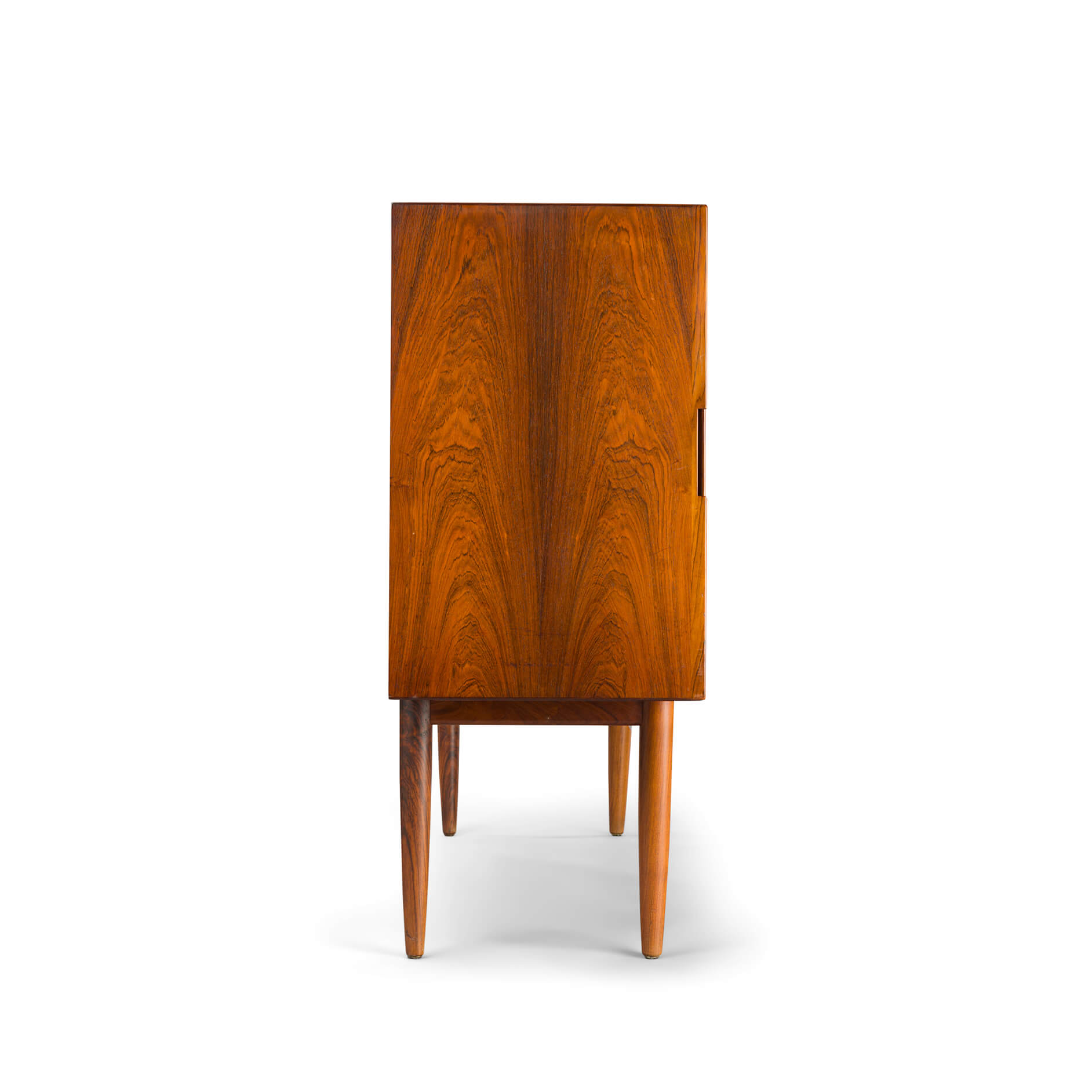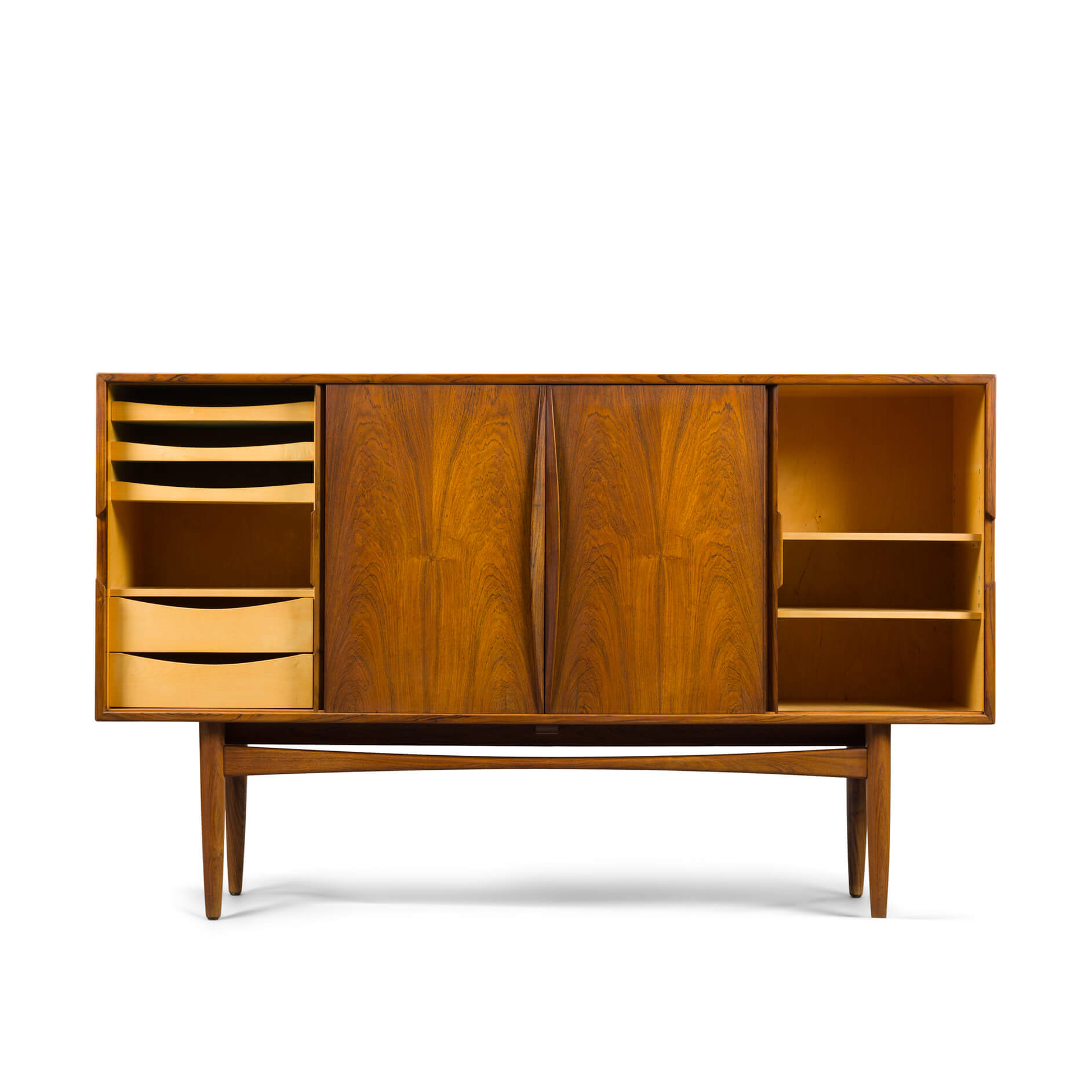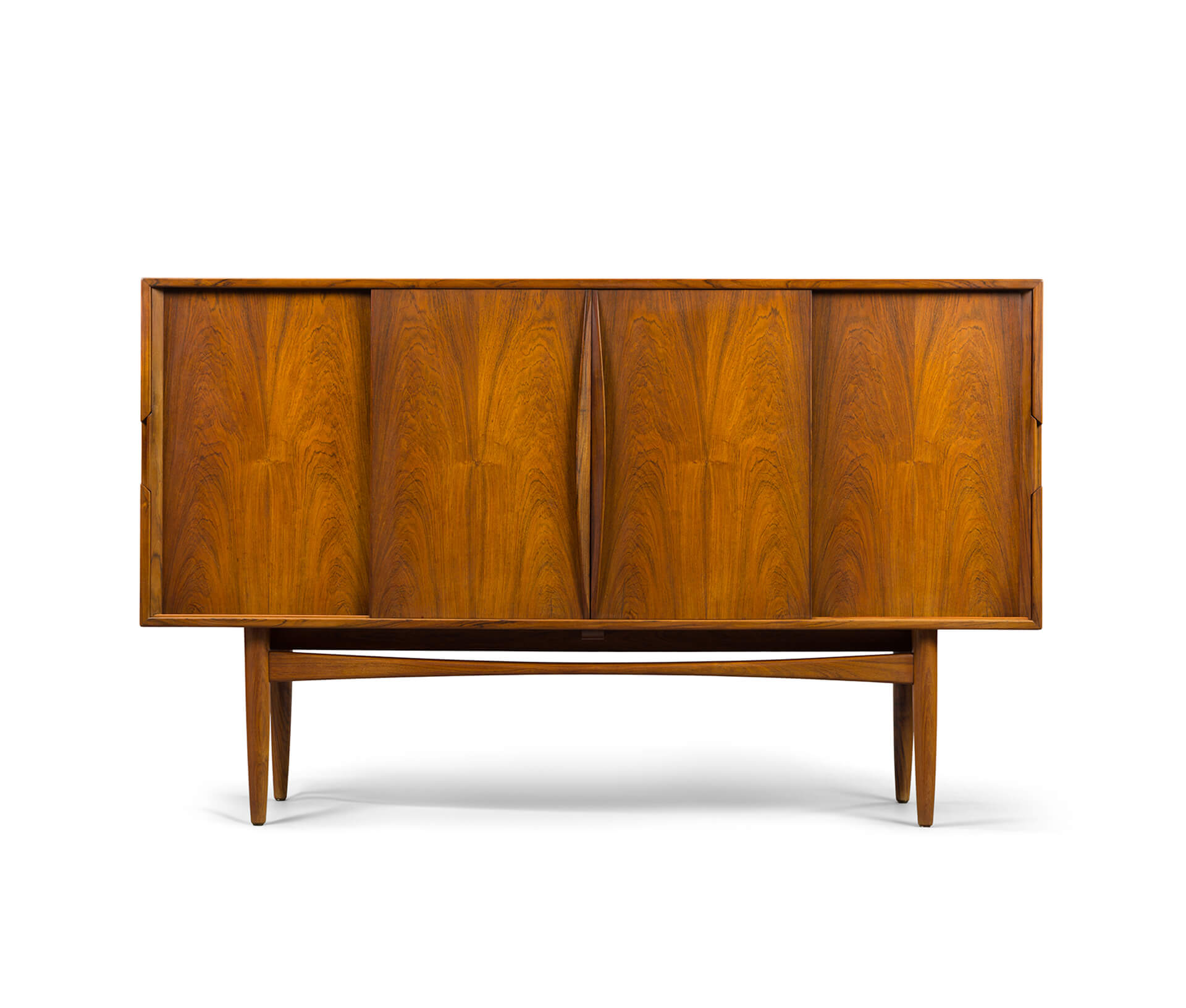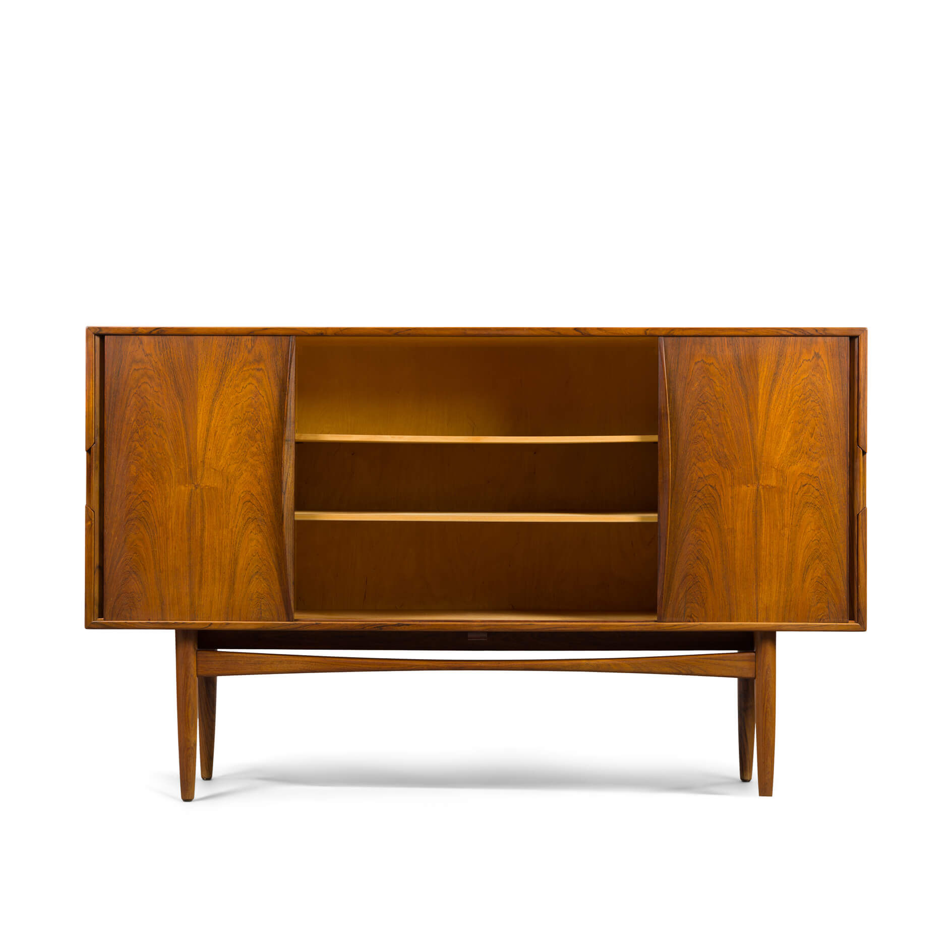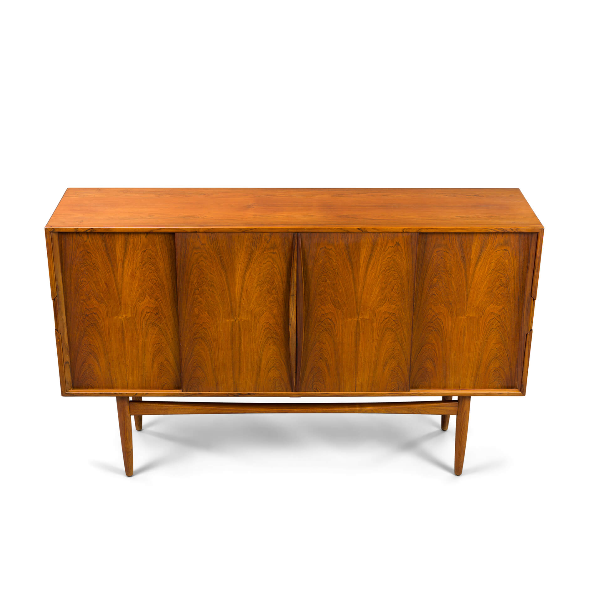 Stunning Deens palissander dressoir met bijzondere design features. Het dressoir is van hoogwaardige kwaliteit en heeft vier schuifdeuren. De grepen van de twee buitenste schuifdeuren zijn uitgevoerd in massief palissander en schuiven in de zijlijsten van de kast. Een knap staaltje meubelmakelaardij!
