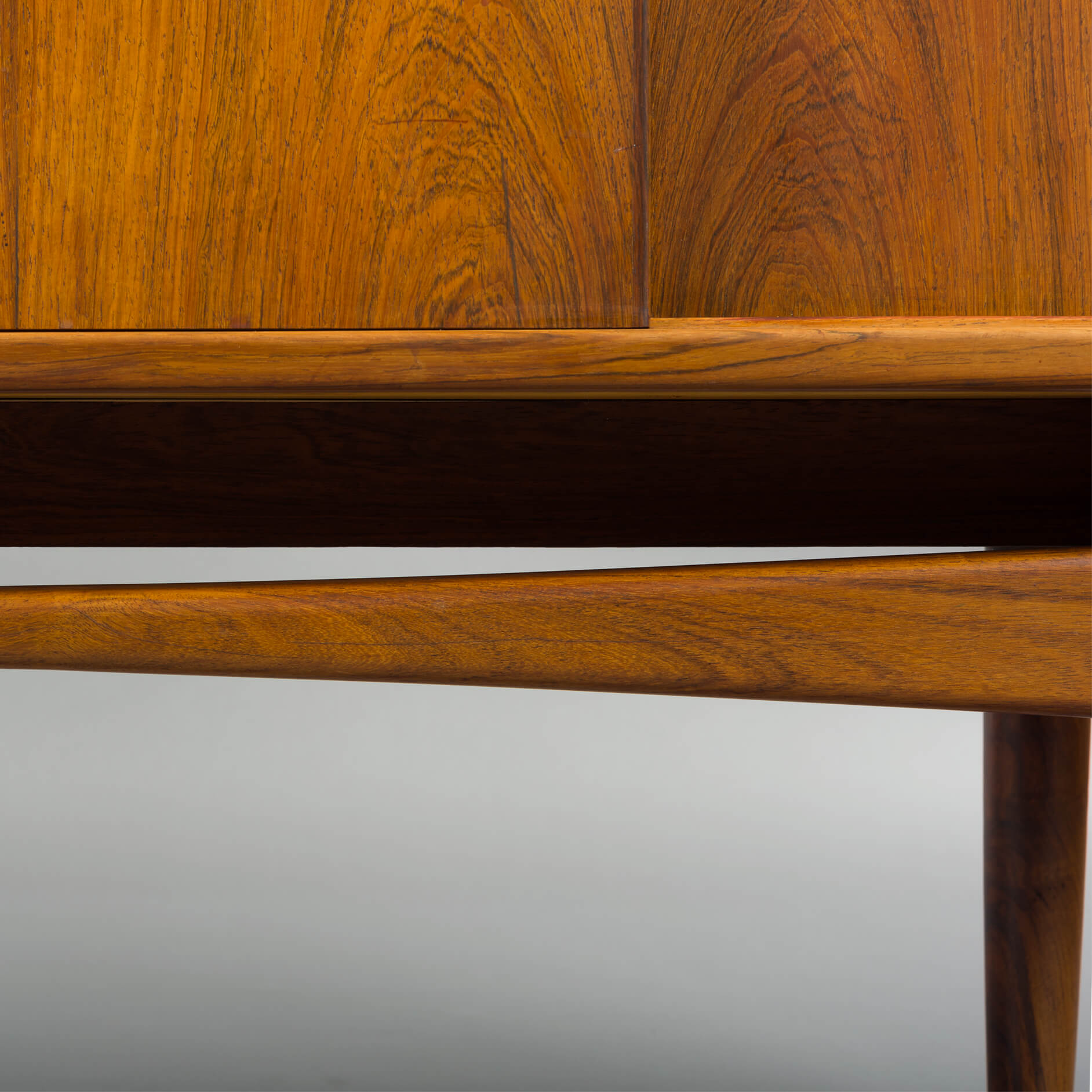 De kast staat op een massief palissander onderstel met een bijzondere dwarsverbinding tussen de poten. Aan de binnenkant van de kast bevinden zich in hoogte verstelbare planken en in het linker kast element schuifladen van verschillende hoogtes.