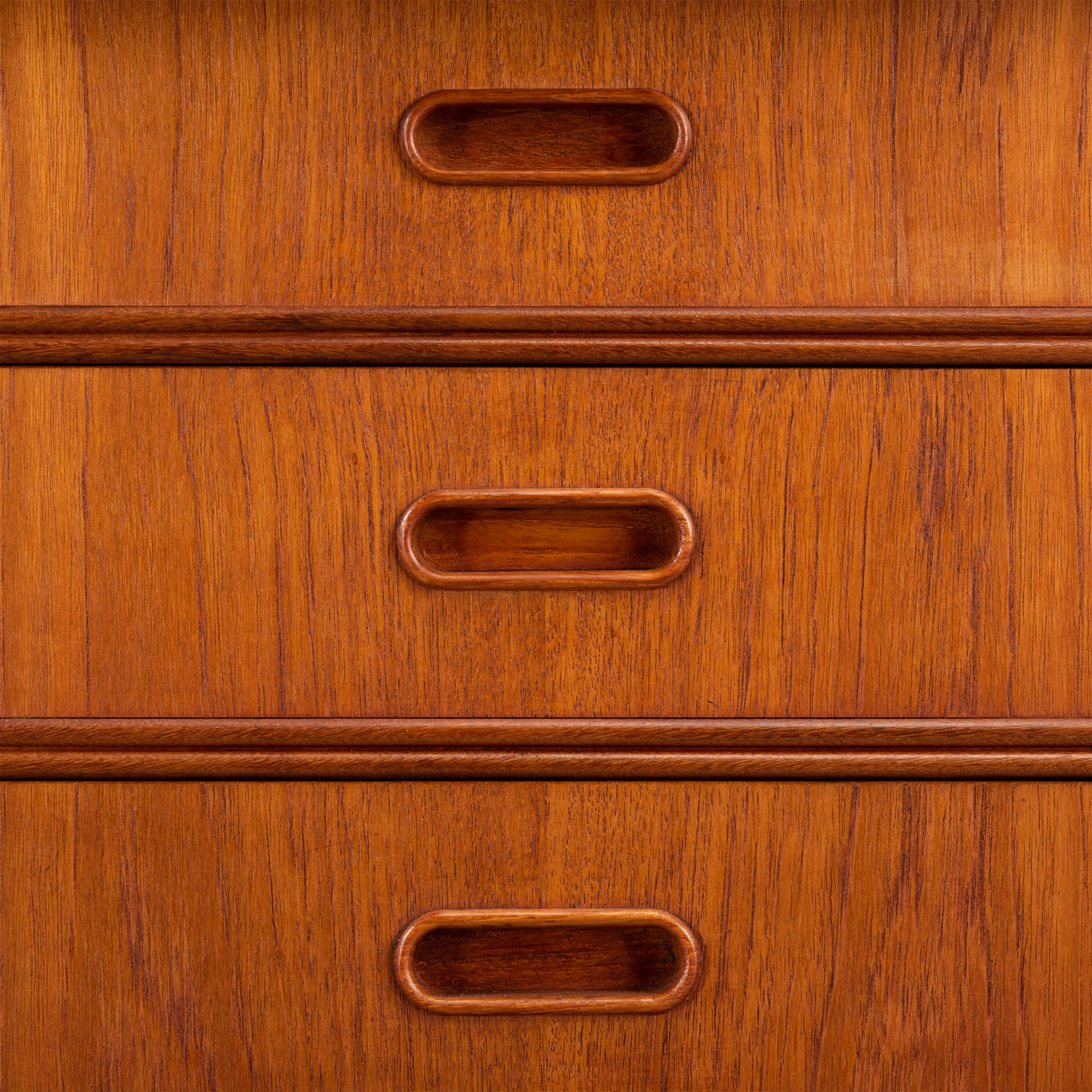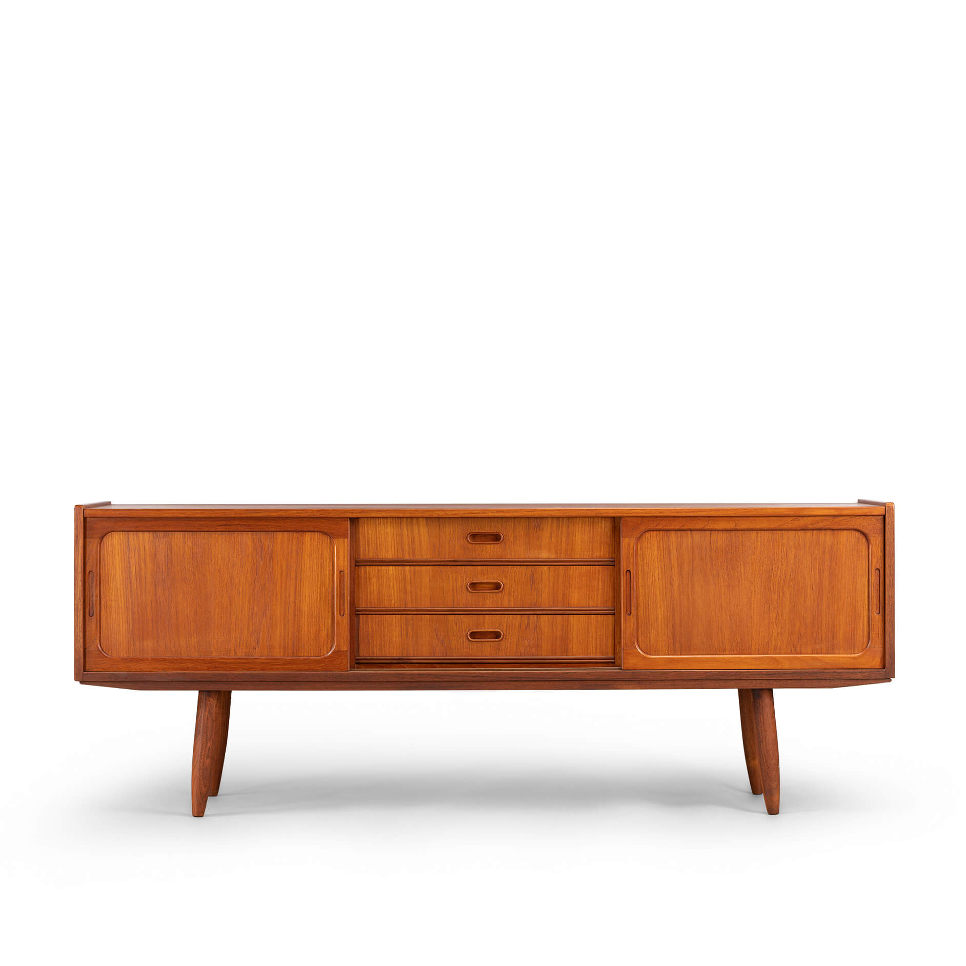 Laag dressoir in teak om alles wat je nodig hebt in te verbergen! Prachtige roodbruine tint met mooie houten grepen. En super 60s style omkaderde deuren. Aan de binnenkant bevindt zich alles wat men nodig heeft in de bar sectie aan de rechterkant met spiegel en plankje voor je favo tumblers. Aan de linkerkant een drietal laden achter de schuifdeur voor bestek. In het midden drie handige laden.