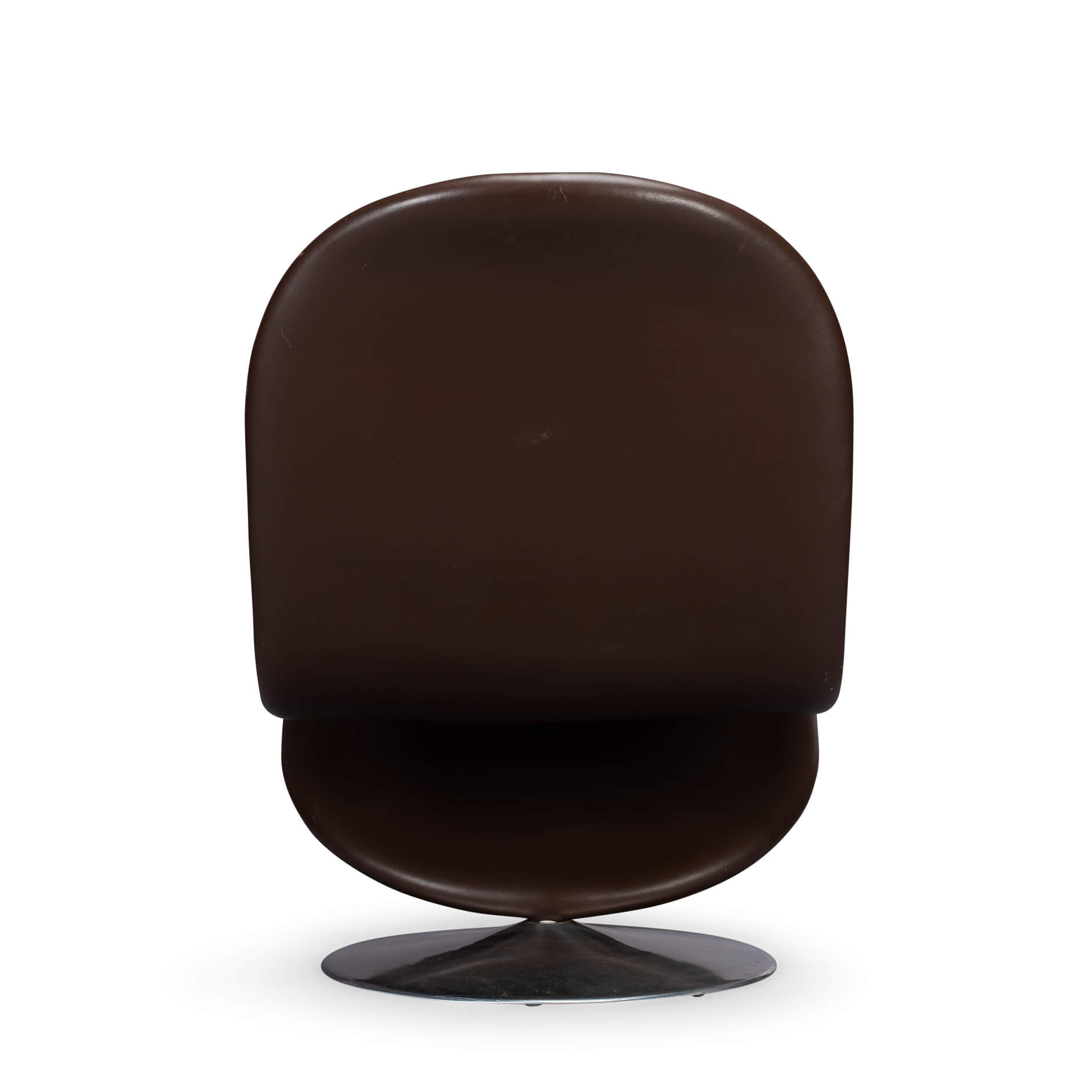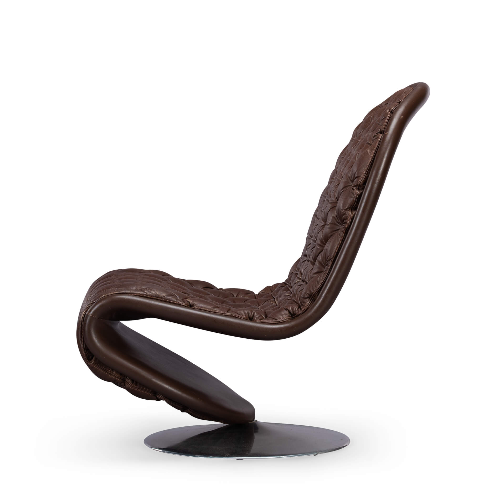 Verner Panton 'System 1-2-3 lounge stoel geproduceerd door Fritz Hansen. Voorzien van een diep gestikt skai leer, dit geeft de bekleding veel uitstaling en volume. Het skai leer heeft een diep bruine tint en heeft de juiste patina door gebruik en tijd. Het geheel staat op een draaibare ronde aluminium voet.