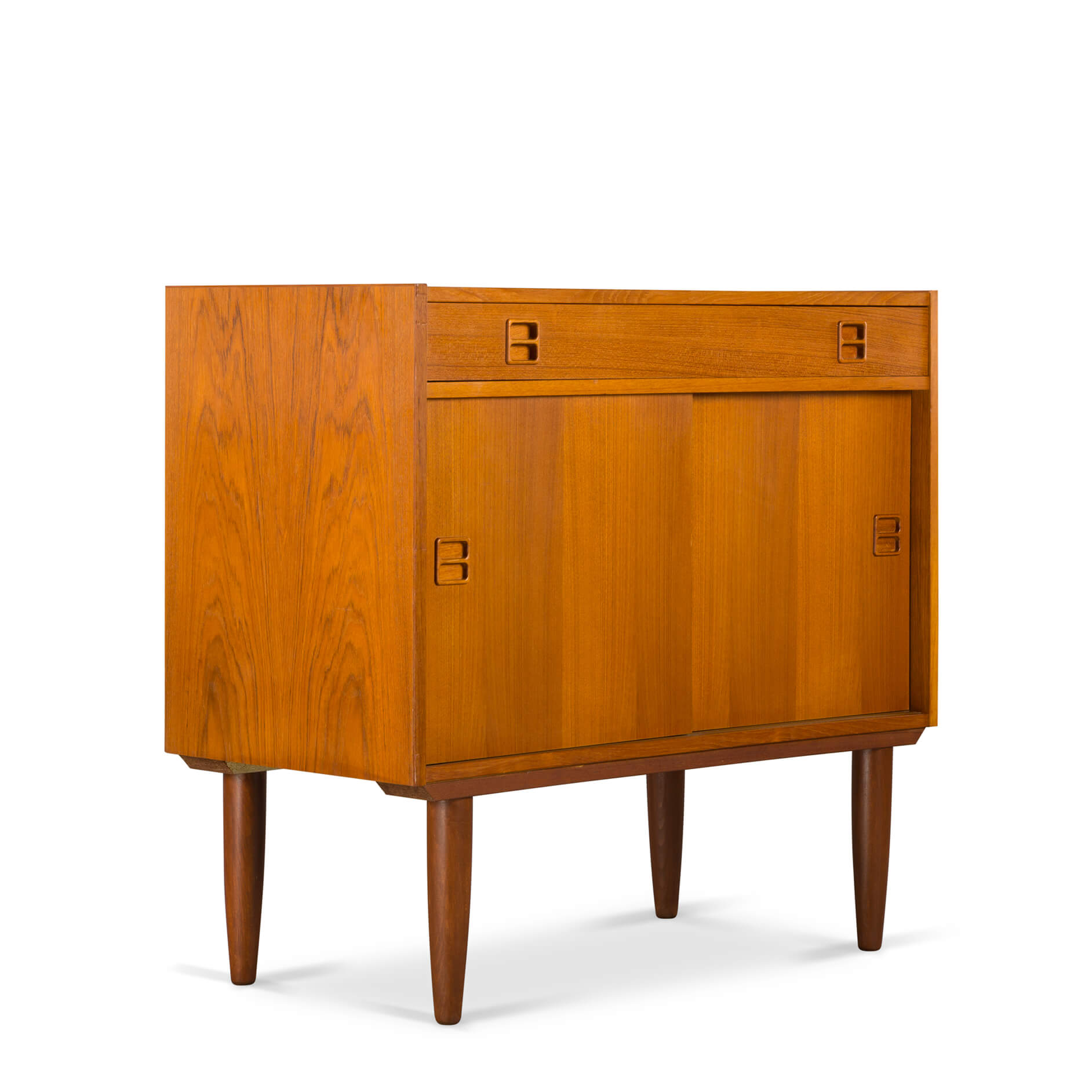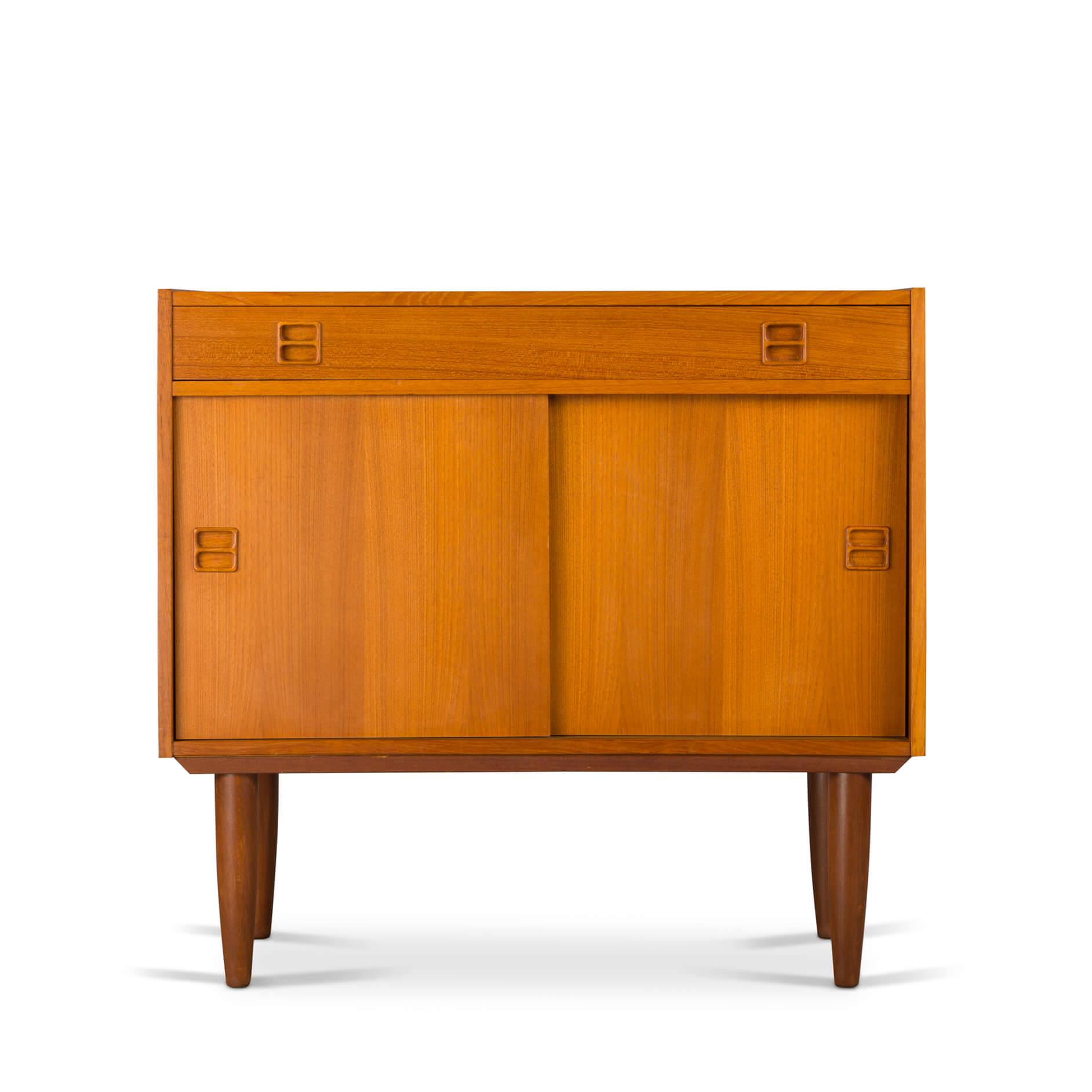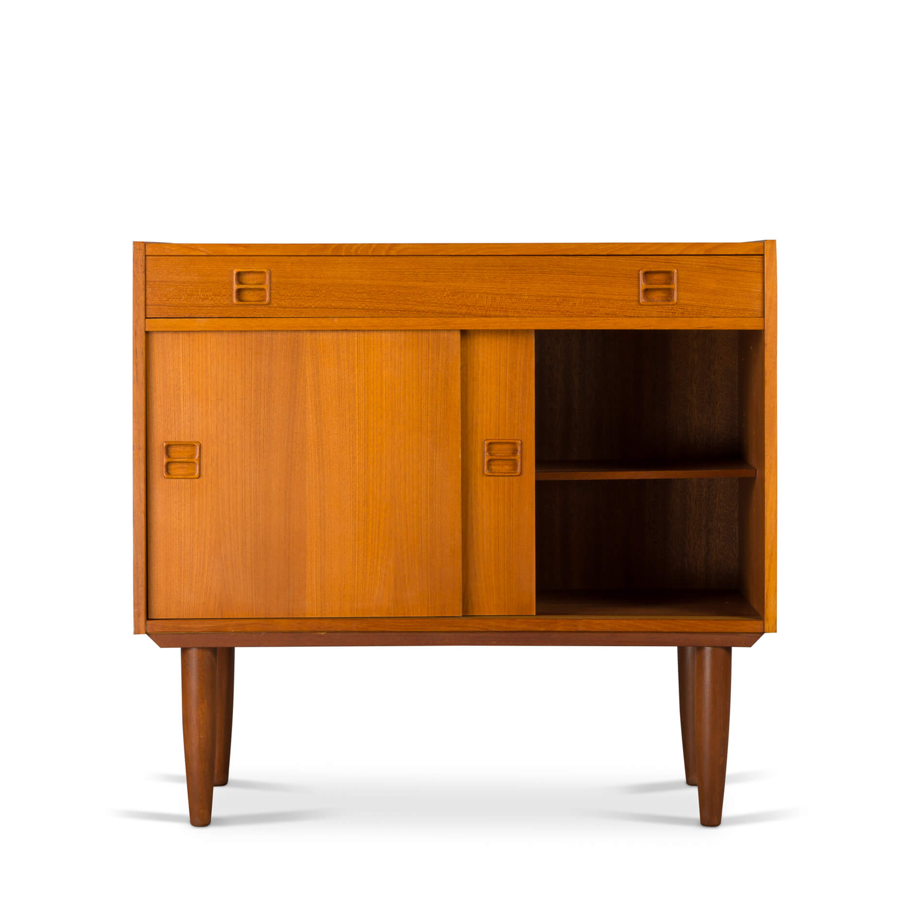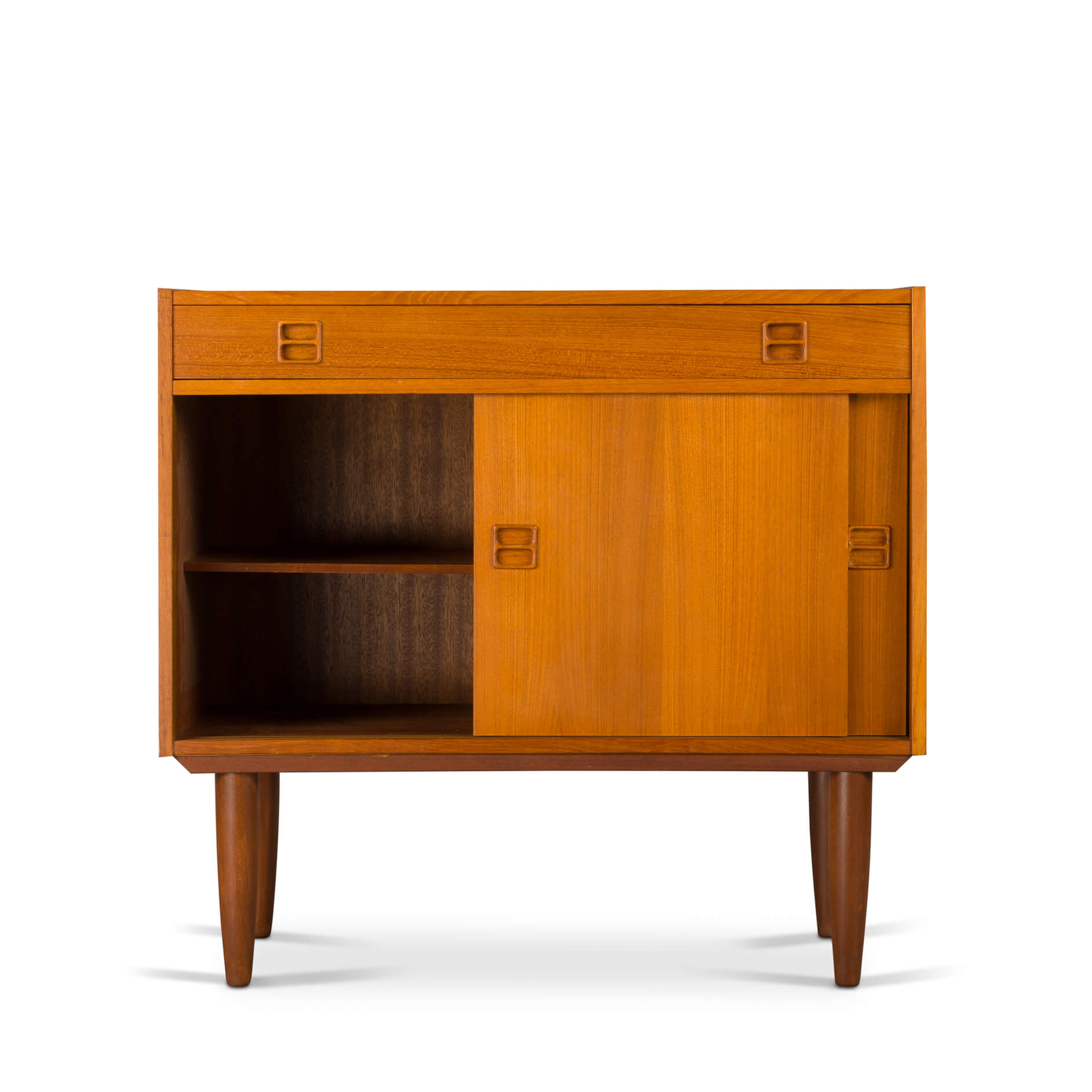 Een stijlvol klein dressoir. Uitgevoerd in teak door de Bornholm Møbelfabrik. Kenmerkend voor Bornholm zijn deze greepjes. De lade heeft nog de originele vilt bekleding. De plank is in hoogte verstelbaar en kan eruit gehaald worden indien gewenst.
