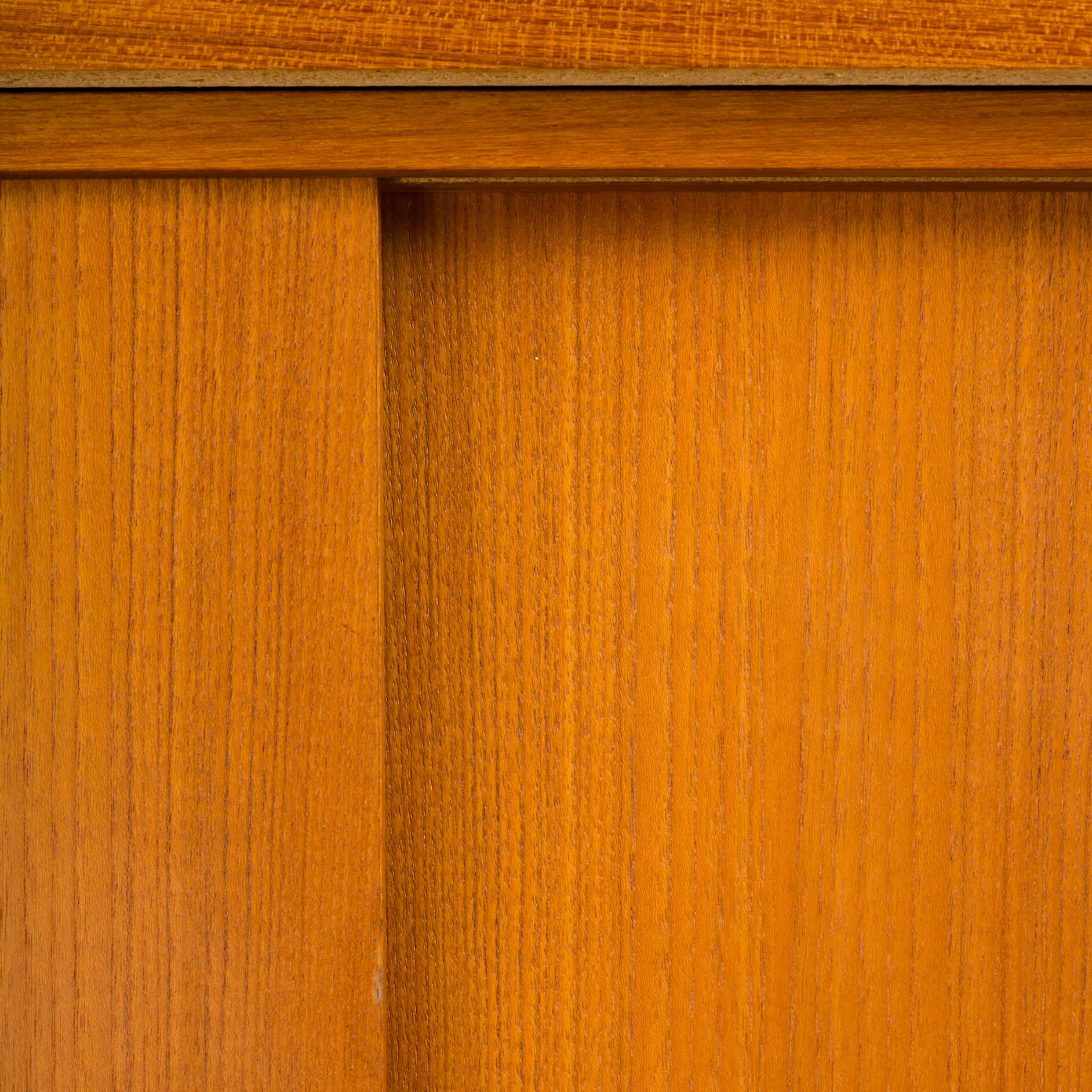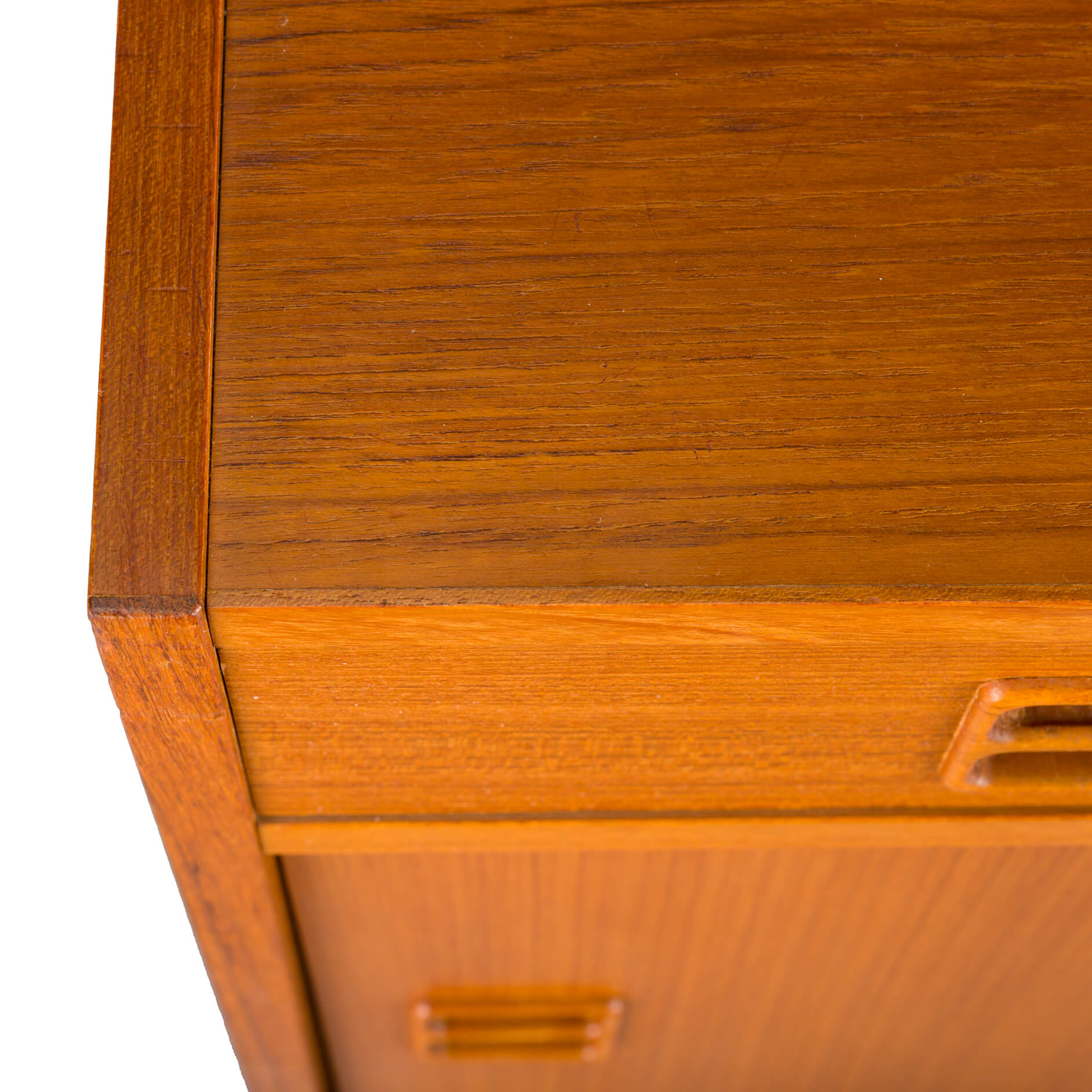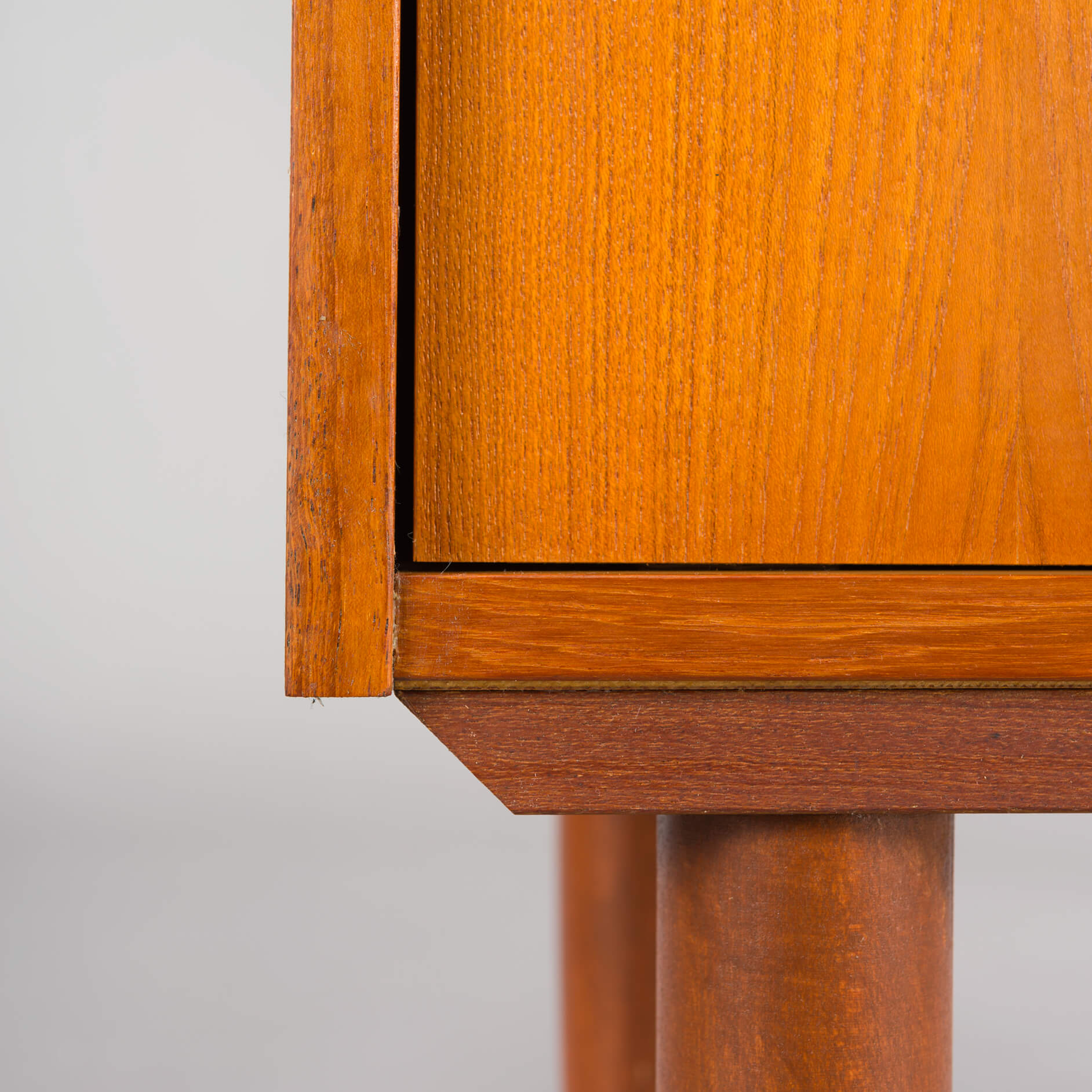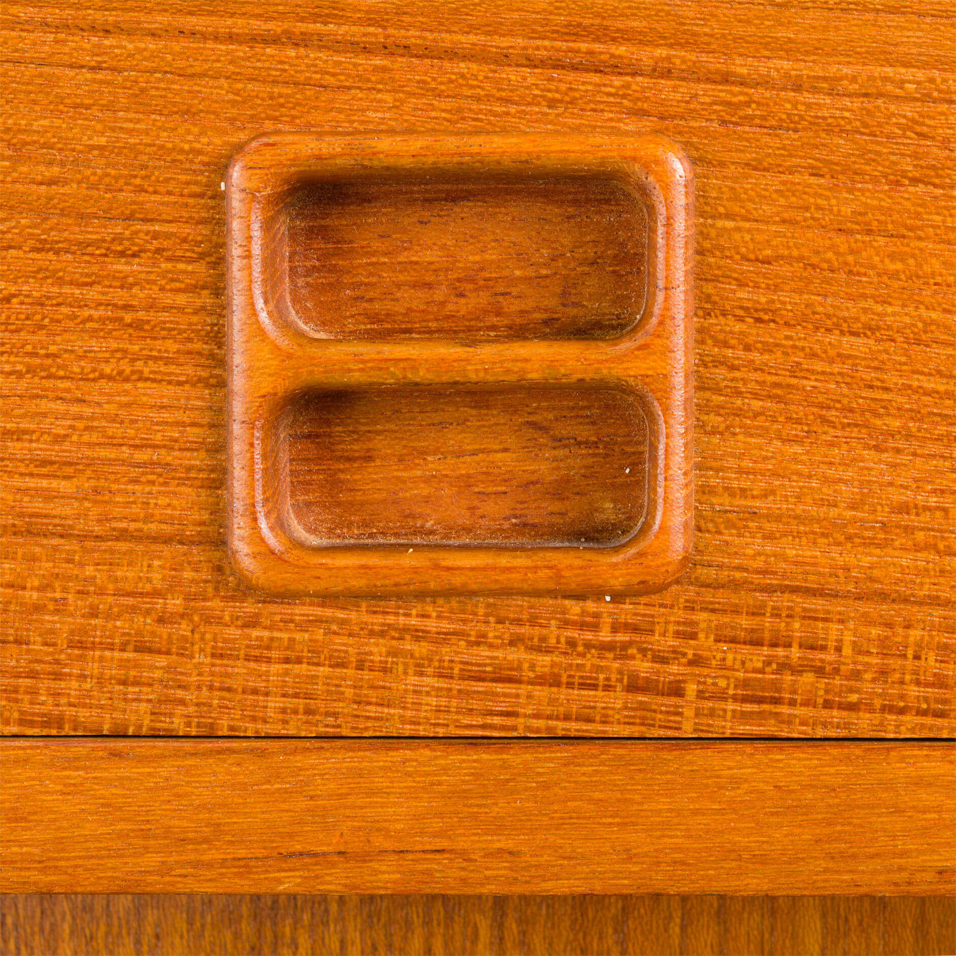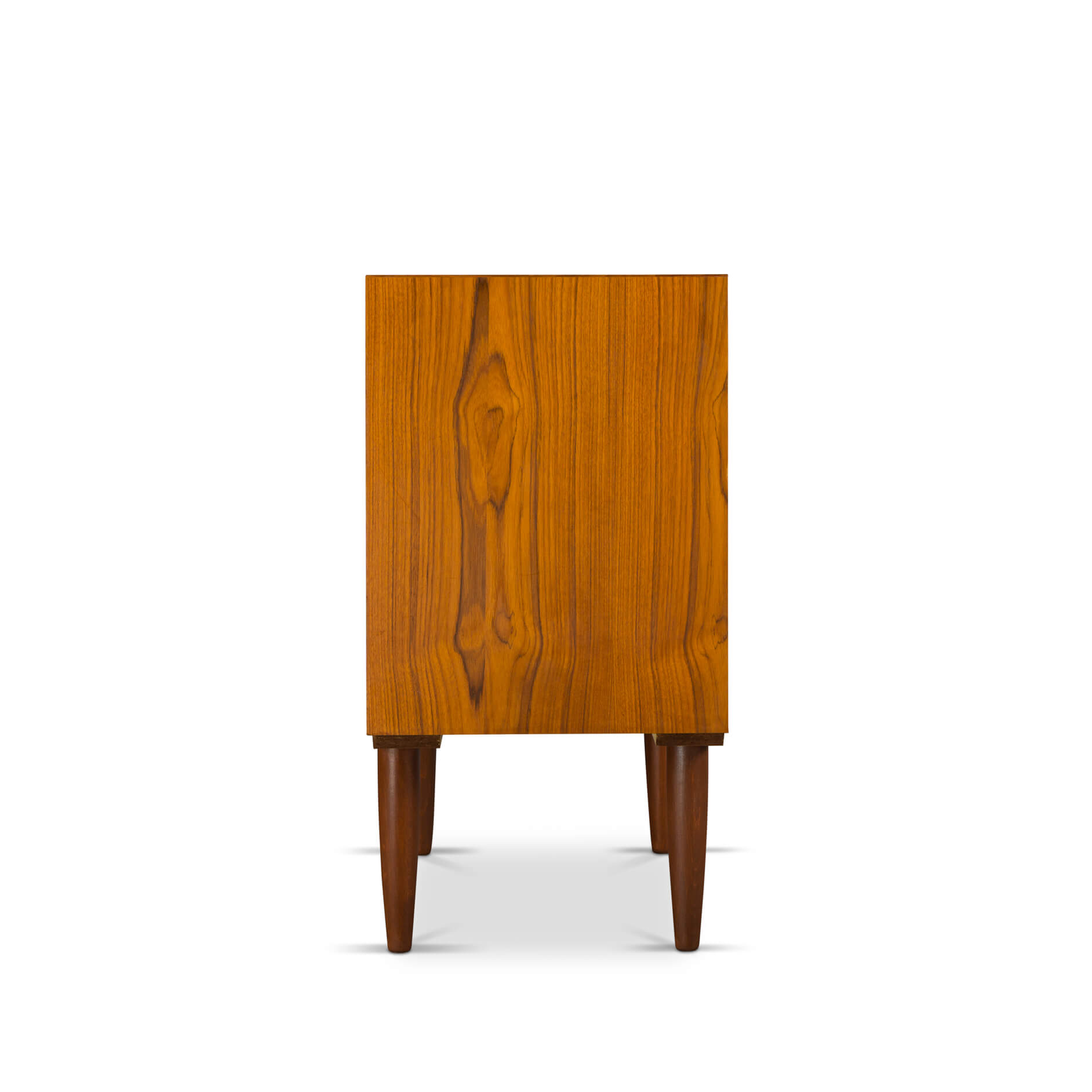 Een stijlvol klein dressoir. Uitgevoerd in teak door de Bornholm Møbelfabrik. Kenmerkend voor Bornholm zijn deze greepjes. De lade heeft nog de originele vilt bekleding. De plank is in hoogte verstelbaar en kan eruit gehaald worden indien gewenst.