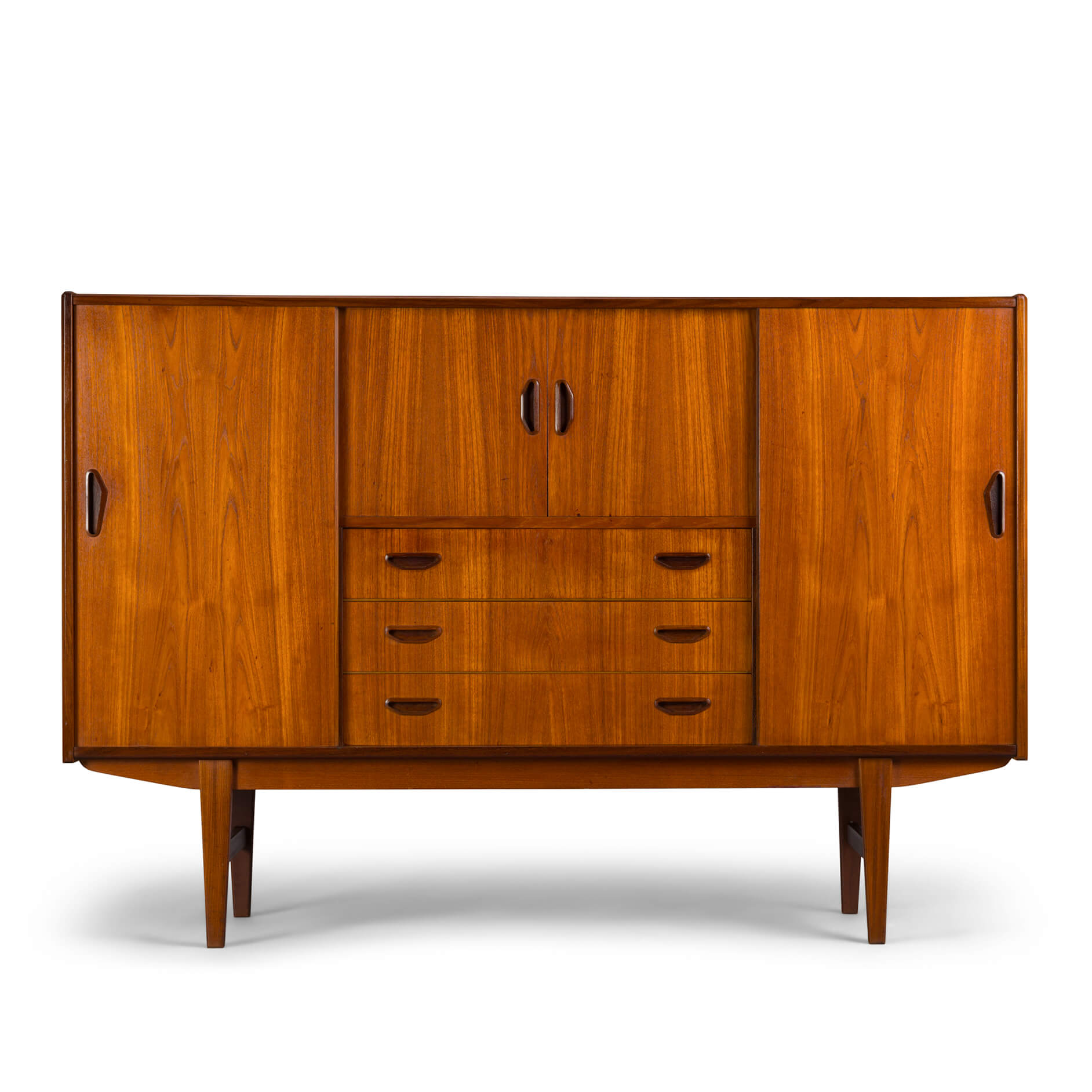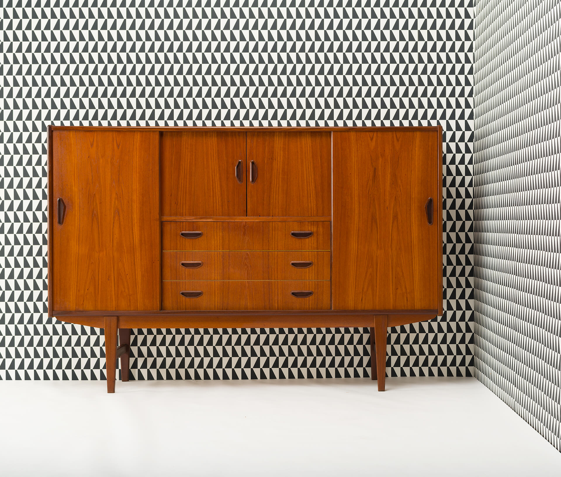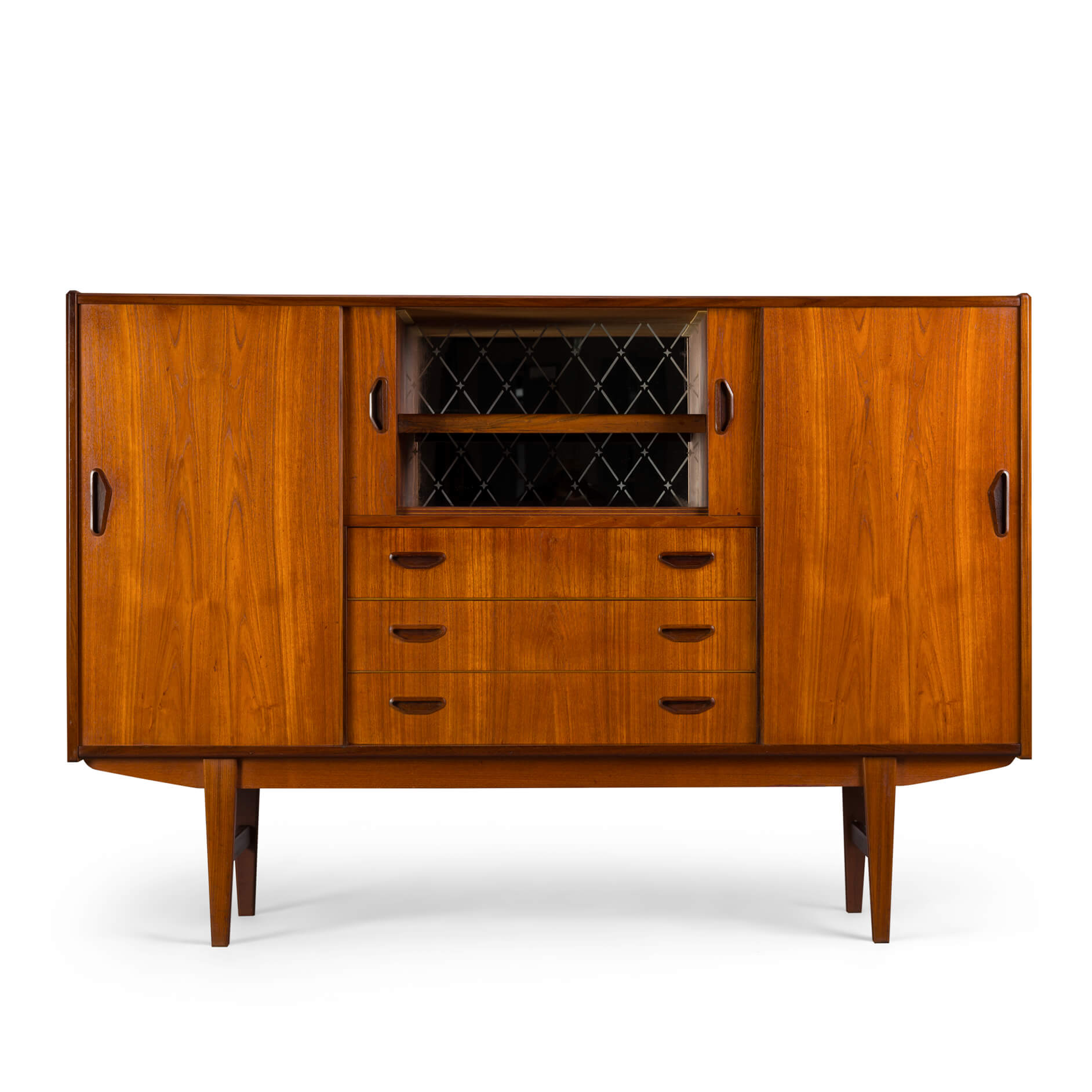In dit hoge dressoir kunnen behoorlijk wat spullen verdwijnen. In de typische mid-century stijl gemaakt midden jaren 60 in Denemarken heeft deze kast alle elementen die we verwachten van zo'n kast. Met 3 verstelbare planken achter de schuifdeuren link en rechts, en een bar gedeelte met spiegel en al in het midden waaronder een drietal laden met wat vlekken aan de binnenkant.