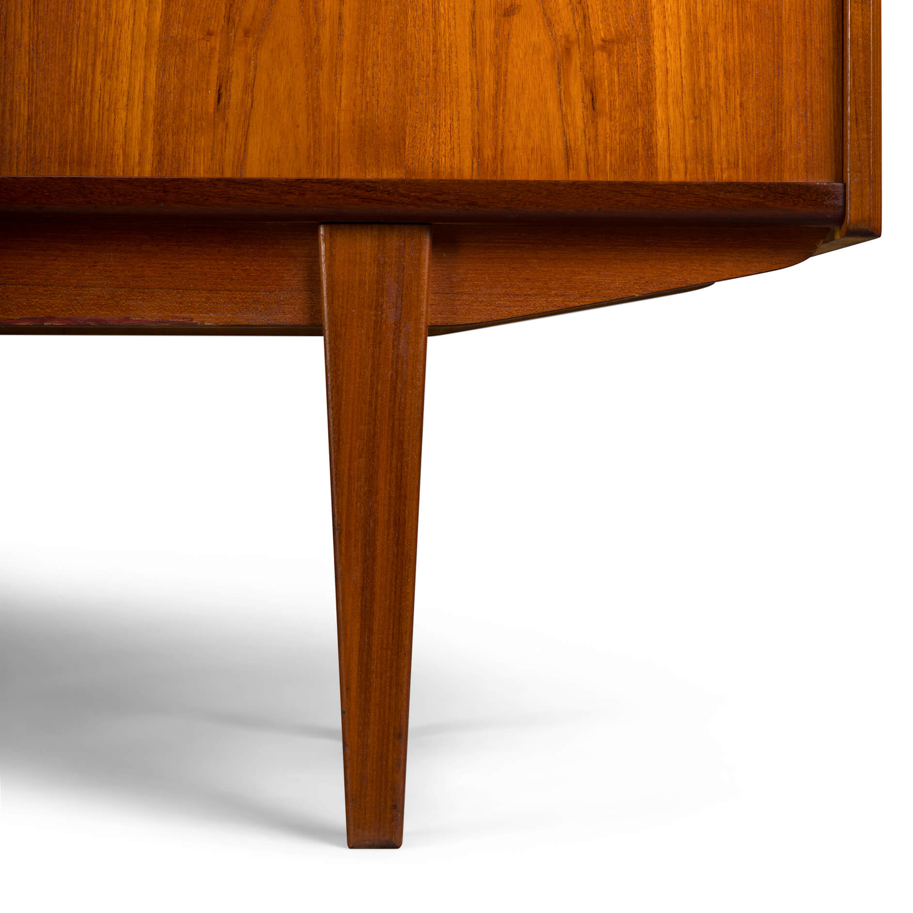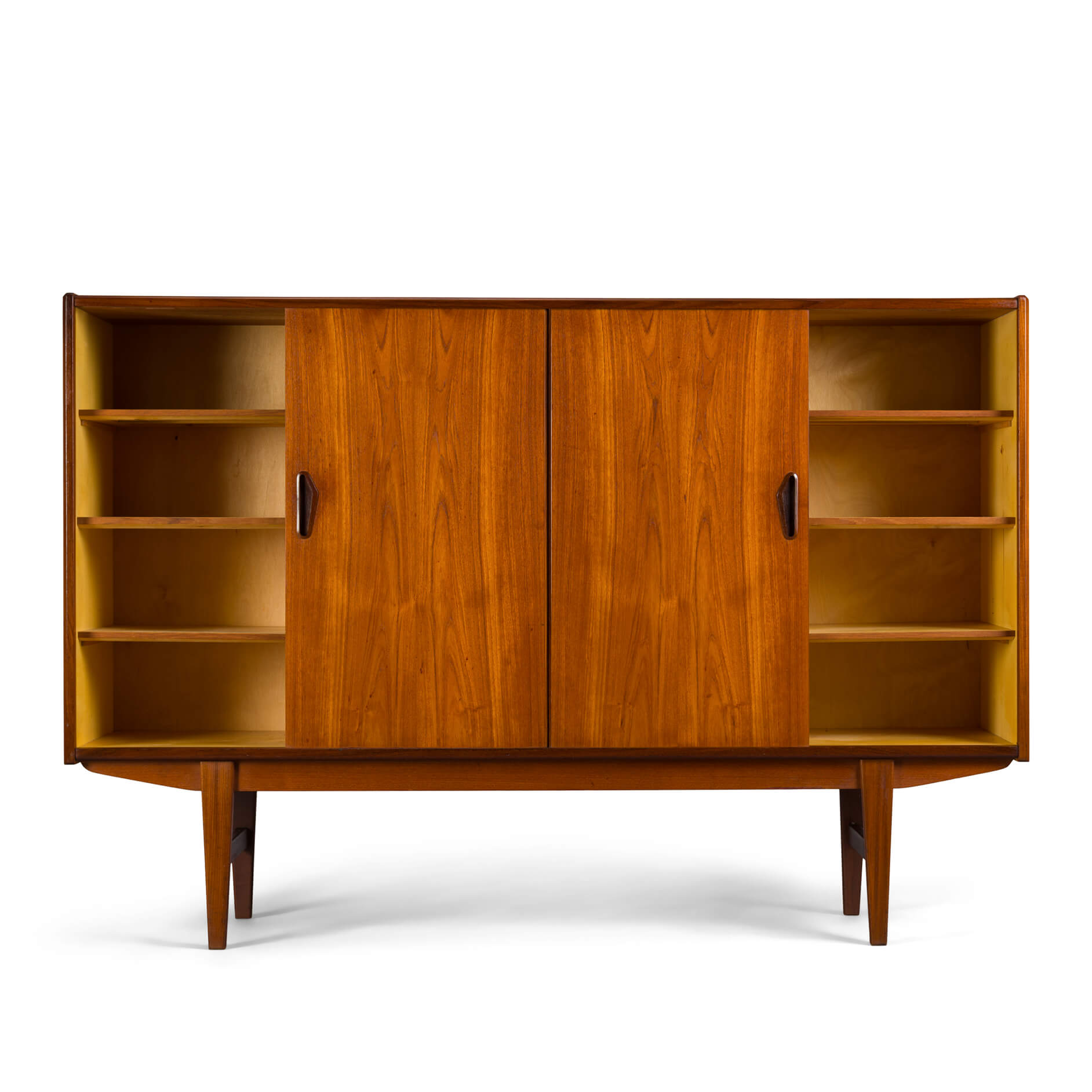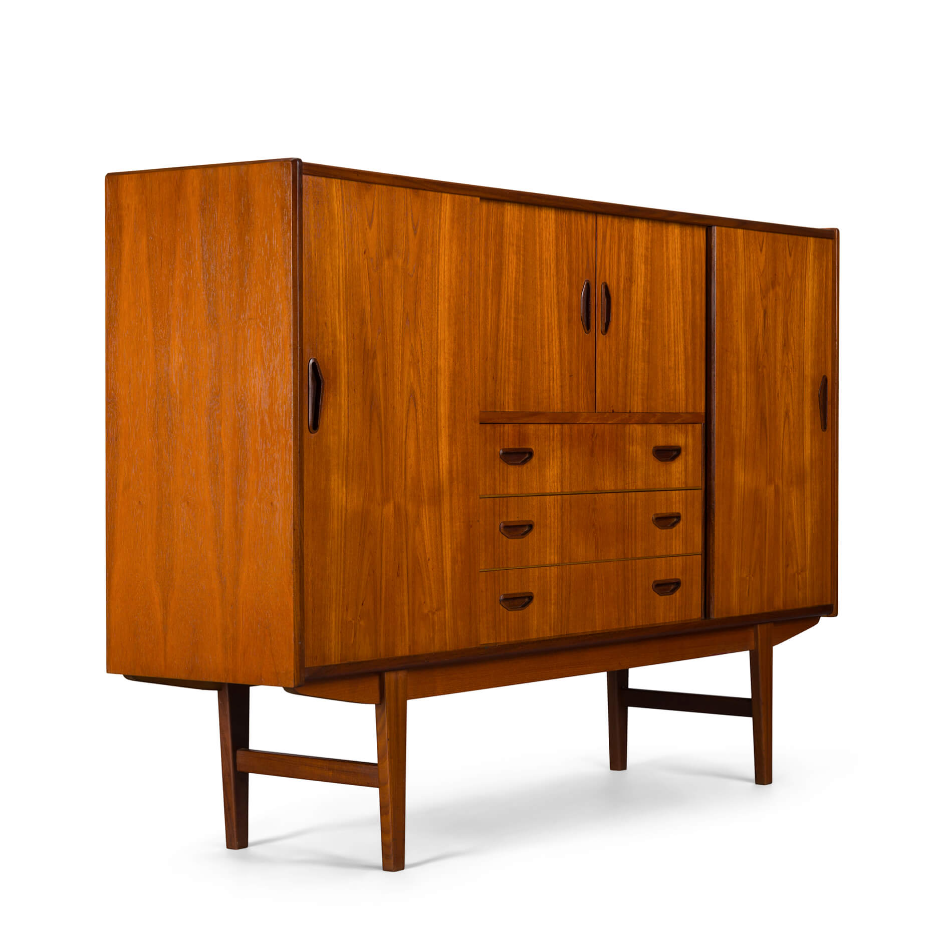 In dit hoge dressoir kunnen behoorlijk wat spullen verdwijnen. In de typische mid-century stijl gemaakt midden jaren 60 in Denemarken heeft deze kast alle elementen die we verwachten van zo'n kast. Met 3 verstelbare planken achter de schuifdeuren link en rechts, en een bar gedeelte met spiegel en al in het midden waaronder een drietal laden met wat vlekken aan de binnenkant.