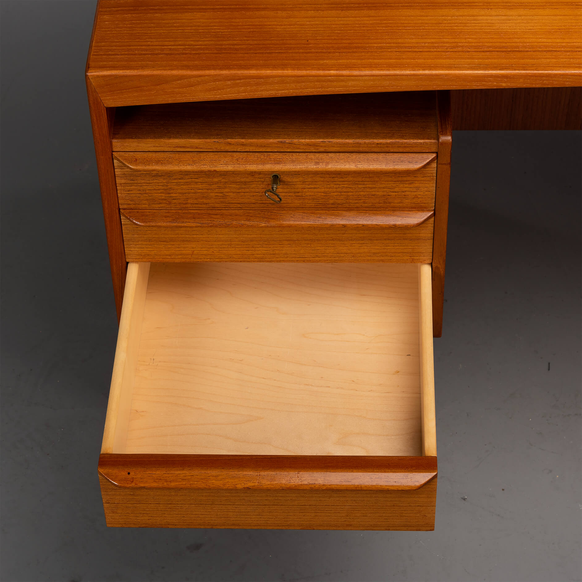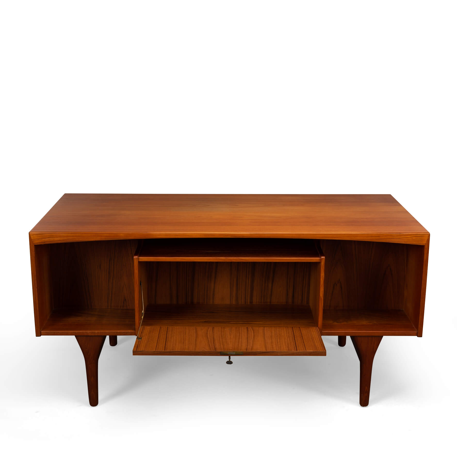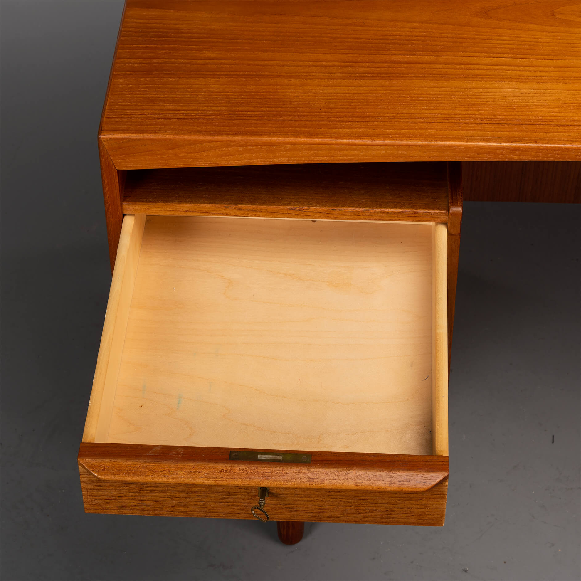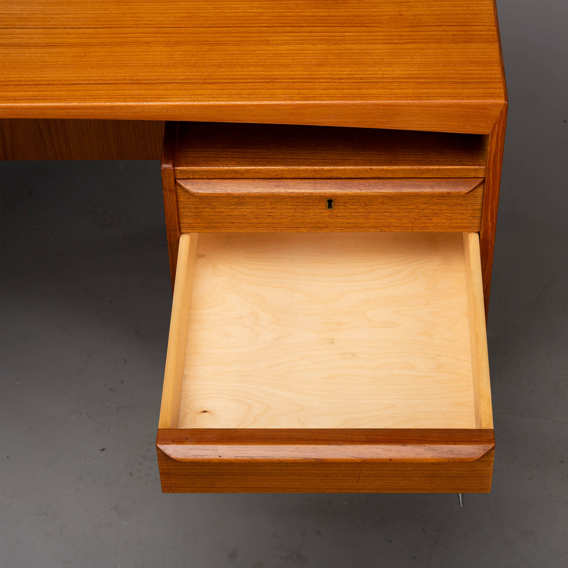 Mid size stylish midcentury teak bureau. Een eclectisch vrijstaand design bureau met een blad dat half zwevend boven de ladeblokken is gemonteerd. Deze twee ladeblokken hebben elk drie laden waarvan de bovenste afsluitbaar is. Aan de achterkant van het buro zijn ruimtes voor boeken en een met klep te openen ruimte die bovendien afsluitbaar is. De poten zijn organisch gevormd en zijn in lijn met de curve onder het blad.