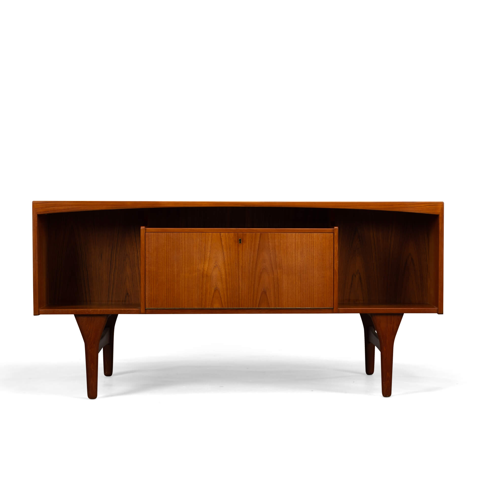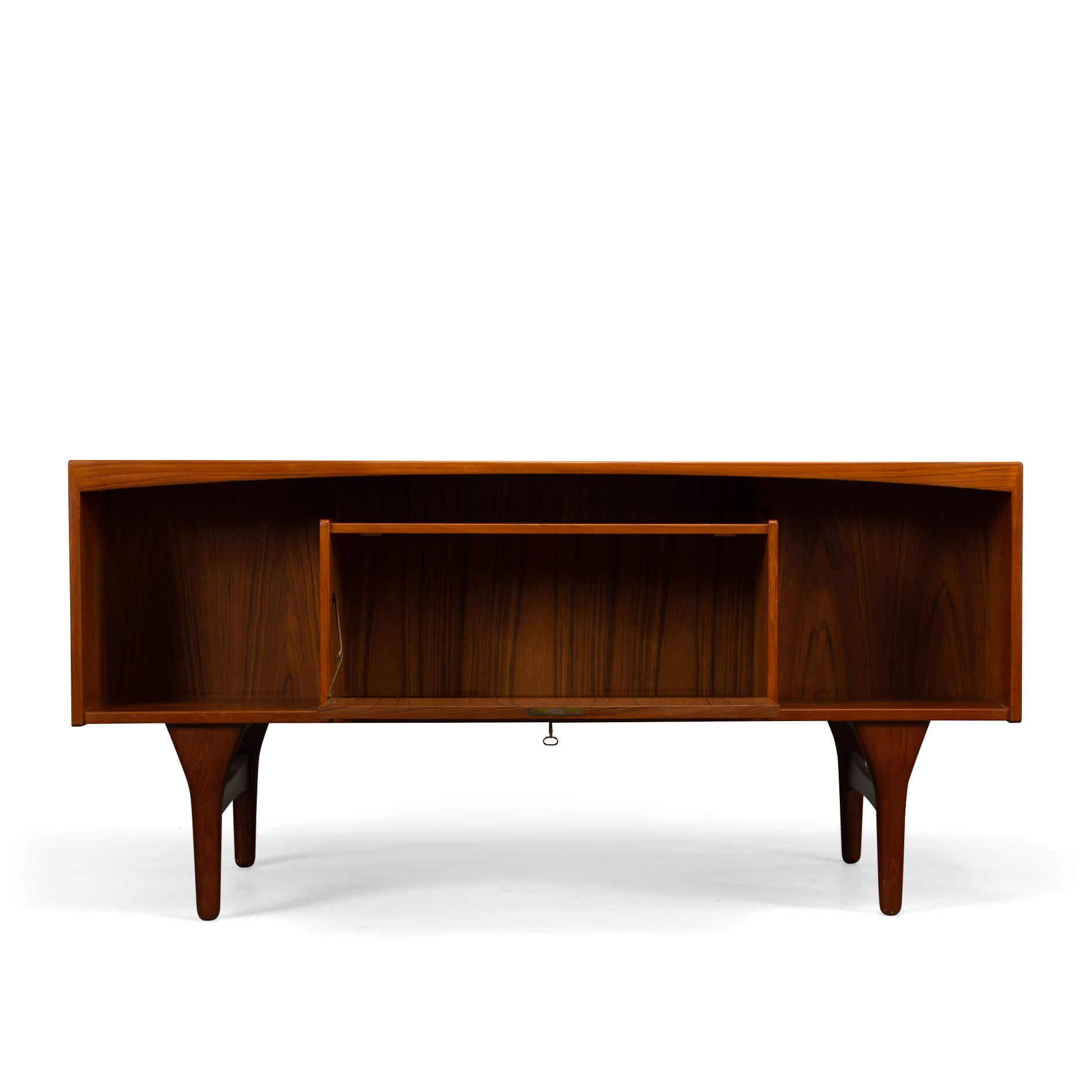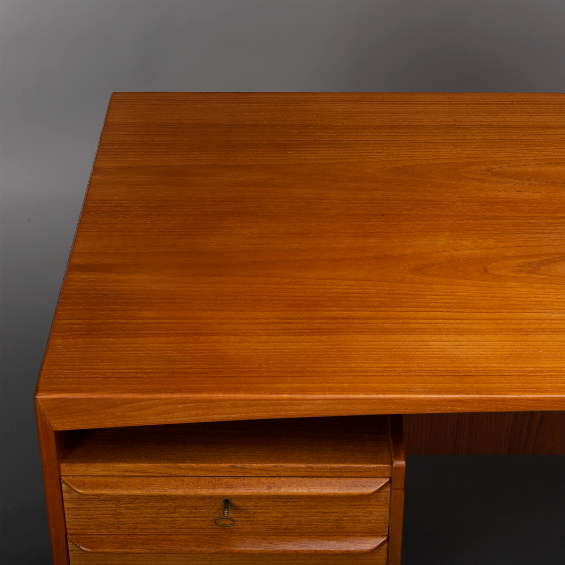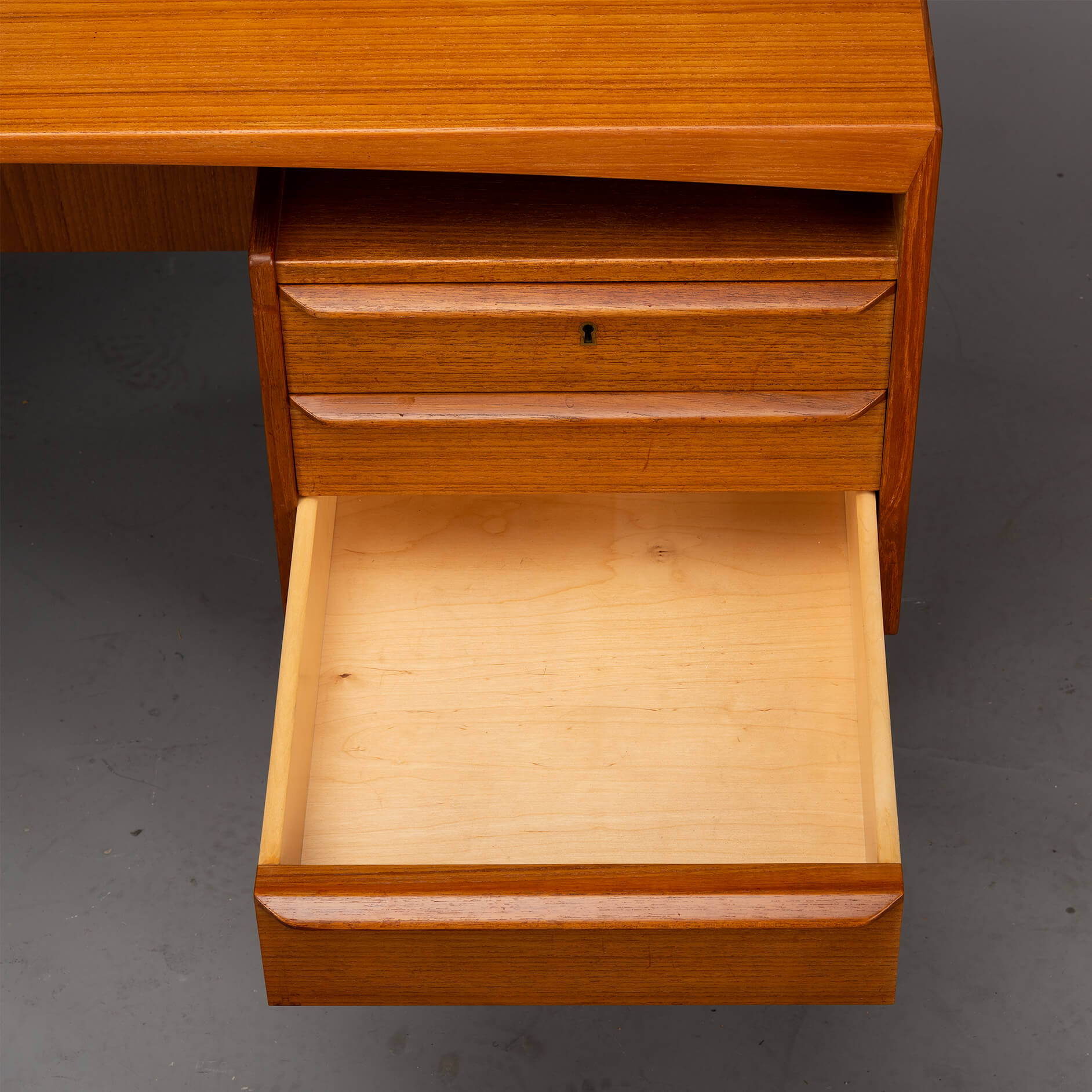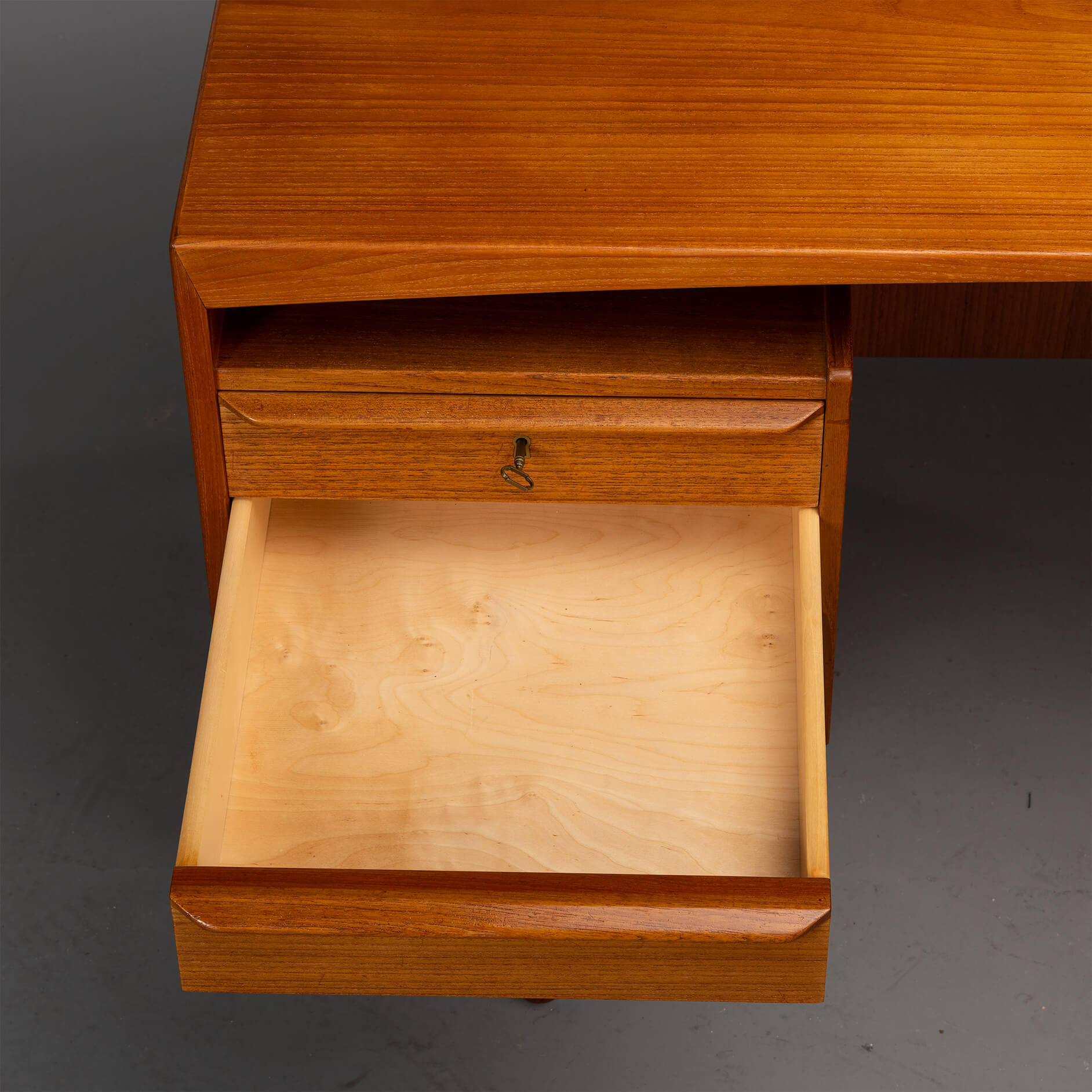 Mid size stylish midcentury teak bureau. Een eclectisch vrijstaand design bureau met een blad dat half zwevend boven de ladeblokken is gemonteerd. Deze twee ladeblokken hebben elk drie laden waarvan de bovenste afsluitbaar is. Aan de achterkant van het buro zijn ruimtes voor boeken en een met klep te openen ruimte die bovendien afsluitbaar is. De poten zijn organisch gevormd en zijn in lijn met de curve onder het blad.