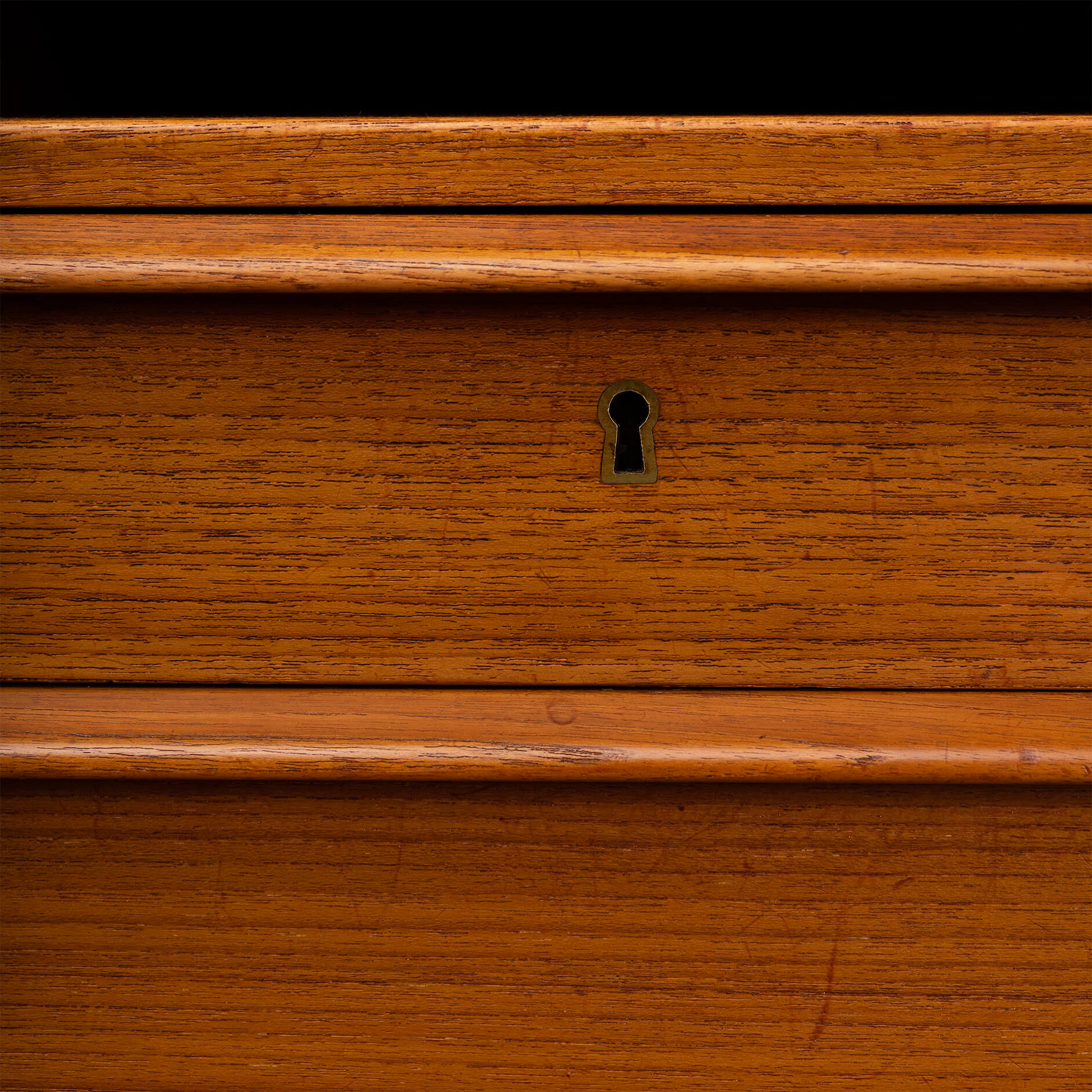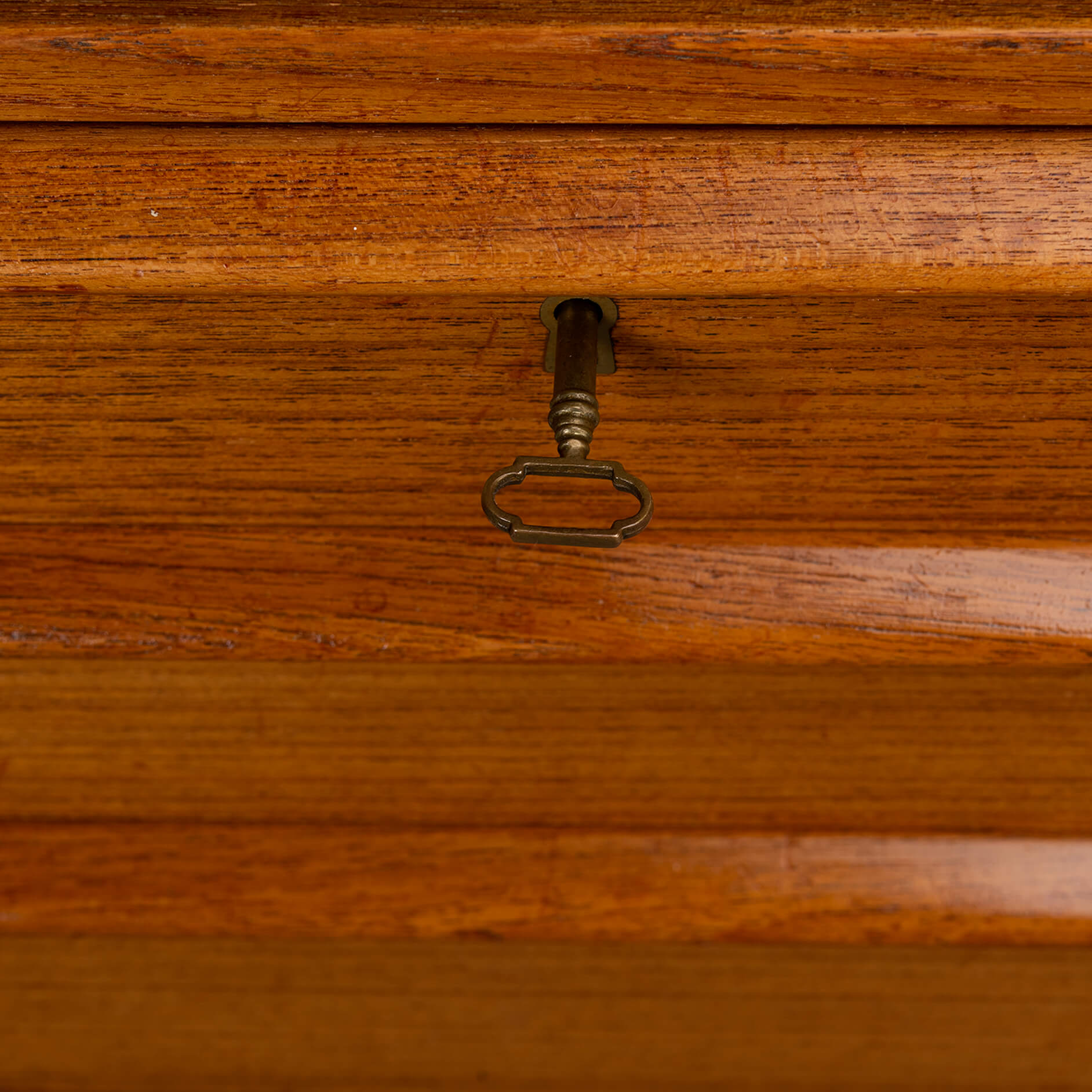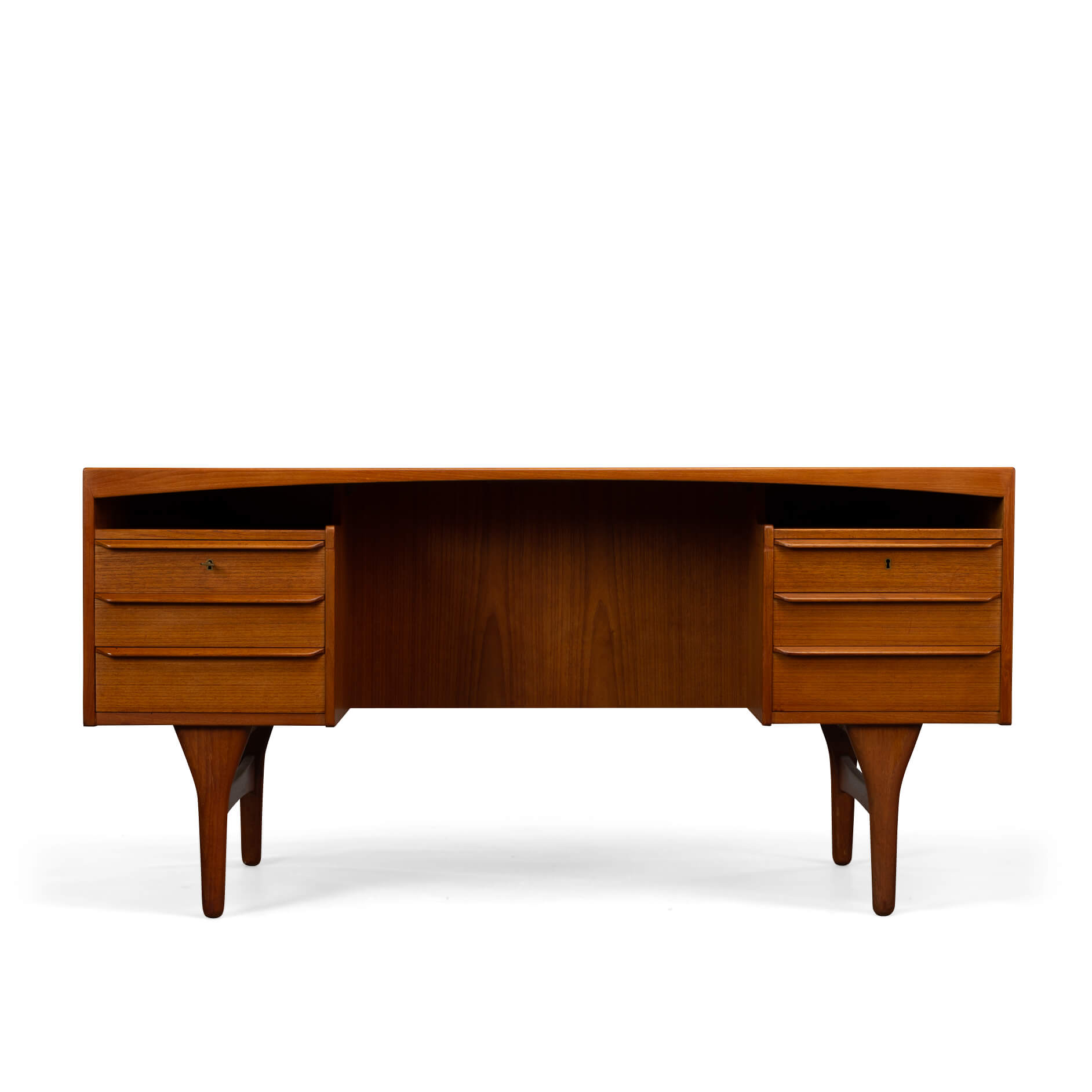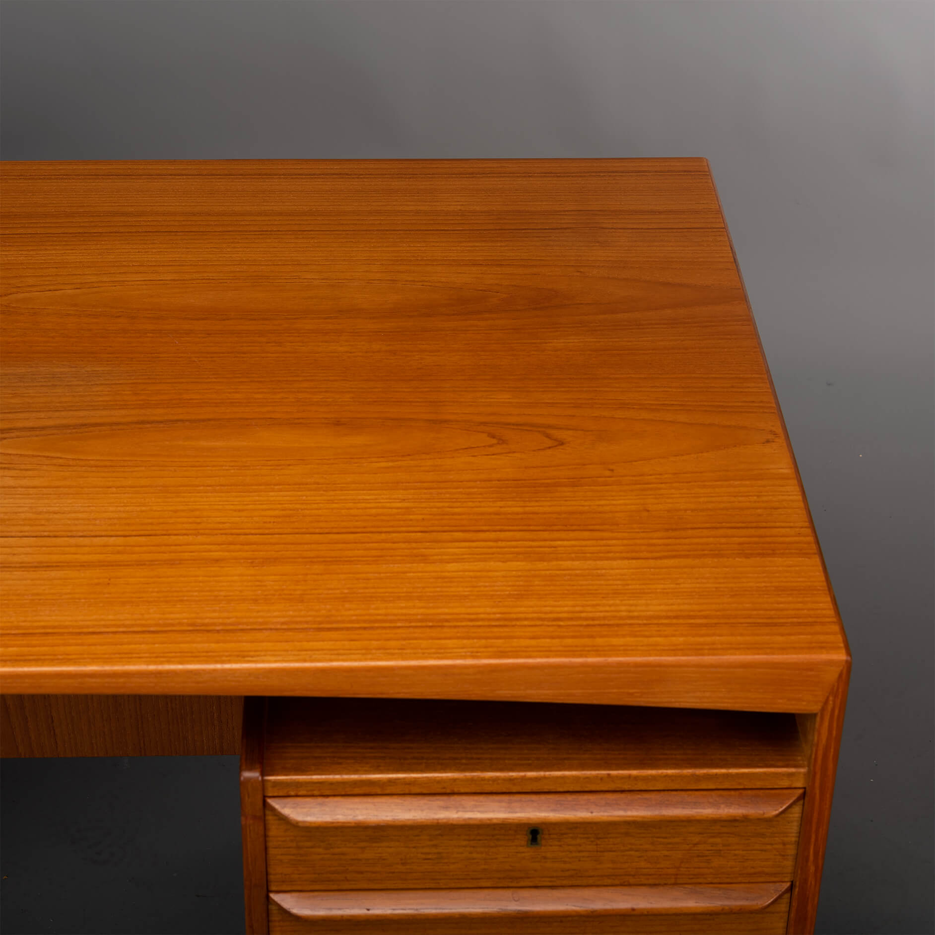 Mid size stylish midcentury teak bureau. Een eclectisch vrijstaand design bureau met een blad dat half zwevend boven de ladeblokken is gemonteerd. Deze twee ladeblokken hebben elk drie laden waarvan de bovenste afsluitbaar is. Aan de achterkant van het buro zijn ruimtes voor boeken en een met klep te openen ruimte die bovendien afsluitbaar is. De poten zijn organisch gevormd en zijn in lijn met de curve onder het blad.