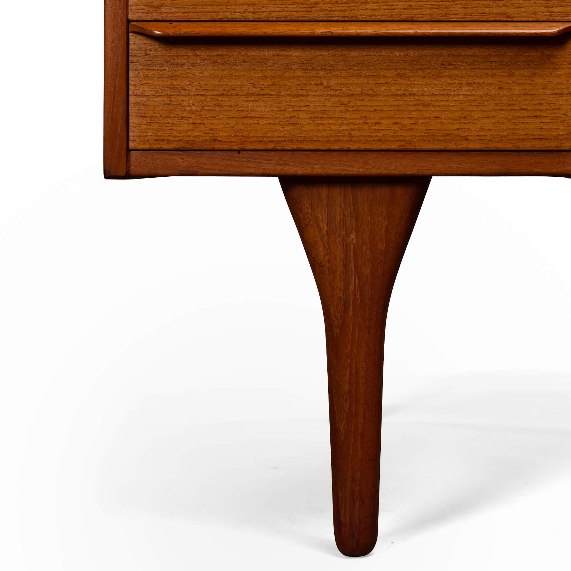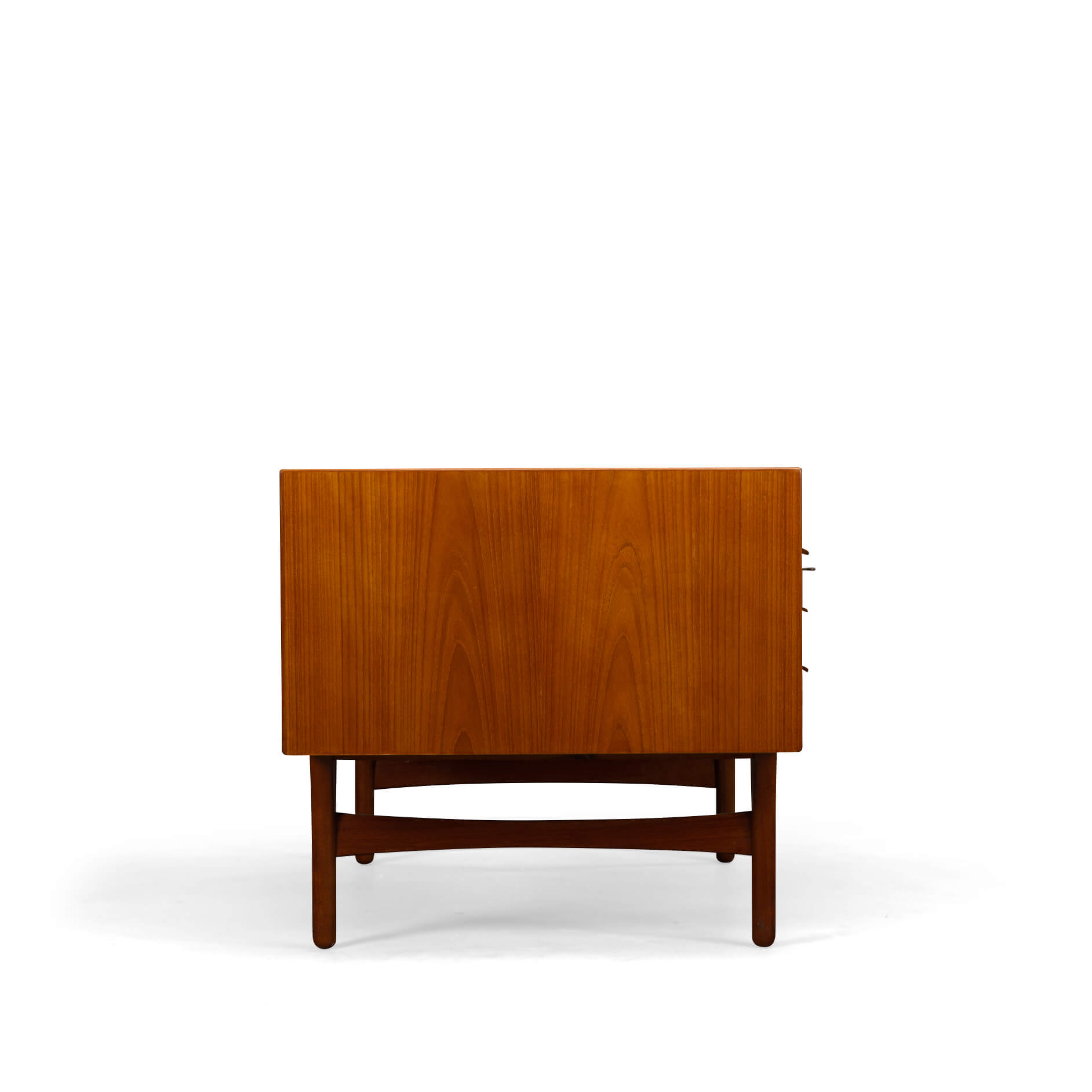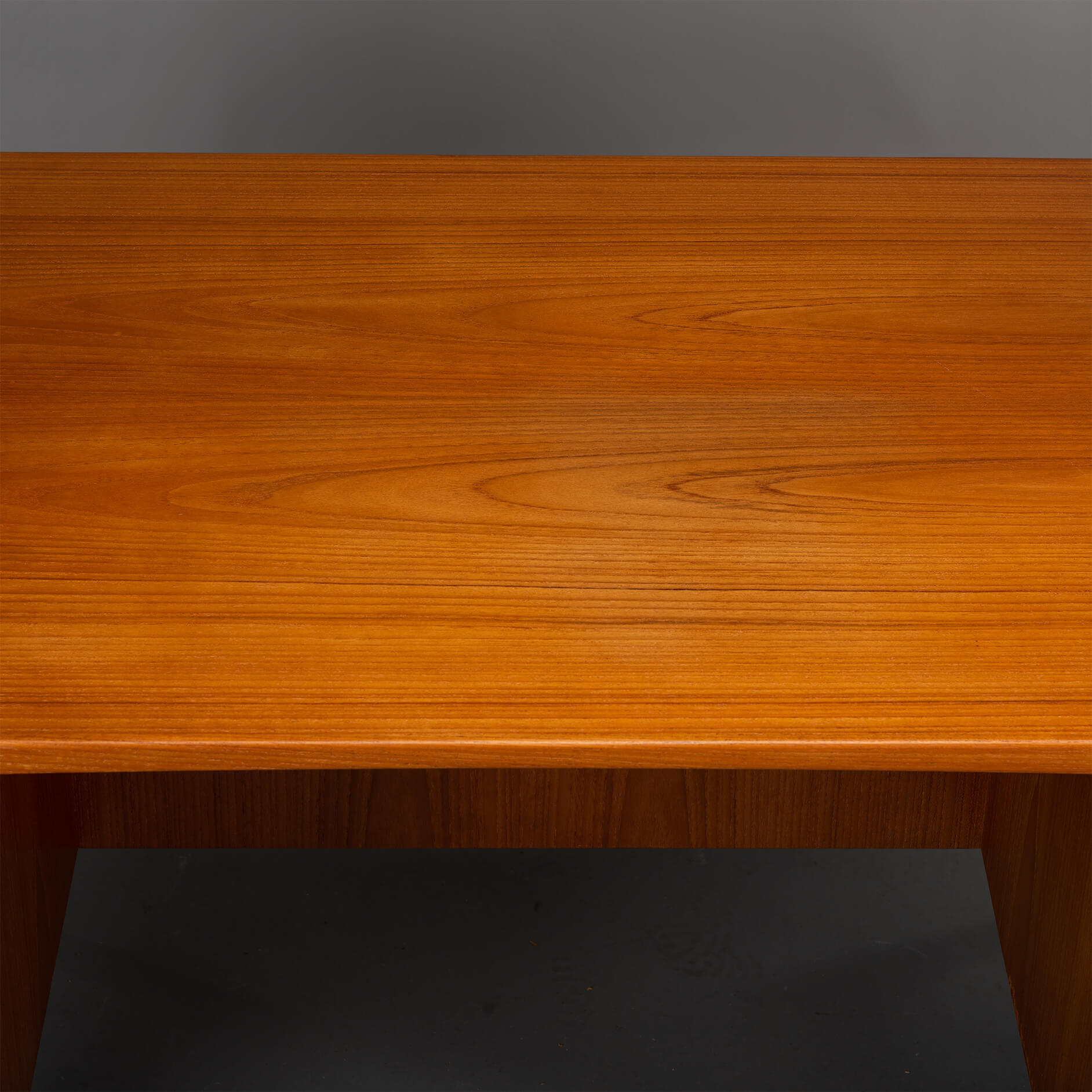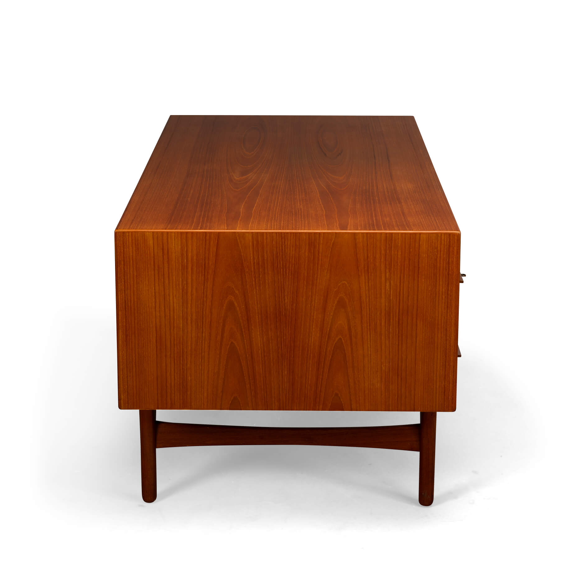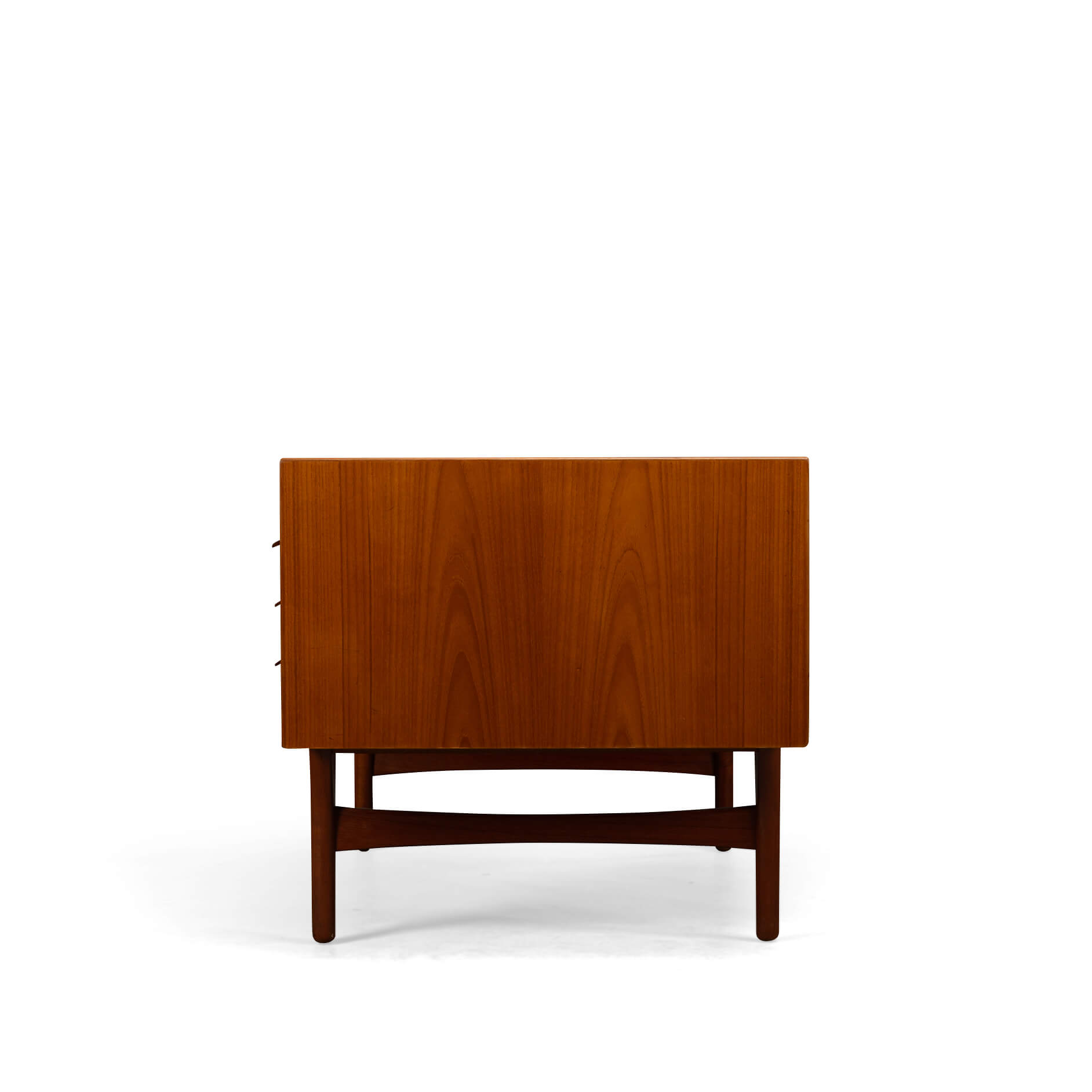 Mid size stylish midcentury teak bureau. Een eclectisch vrijstaand design bureau met een blad dat half zwevend boven de ladeblokken is gemonteerd. Deze twee ladeblokken hebben elk drie laden waarvan de bovenste afsluitbaar is. Aan de achterkant van het buro zijn ruimtes voor boeken en een met klep te openen ruimte die bovendien afsluitbaar is. De poten zijn organisch gevormd en zijn in lijn met de curve onder het blad.