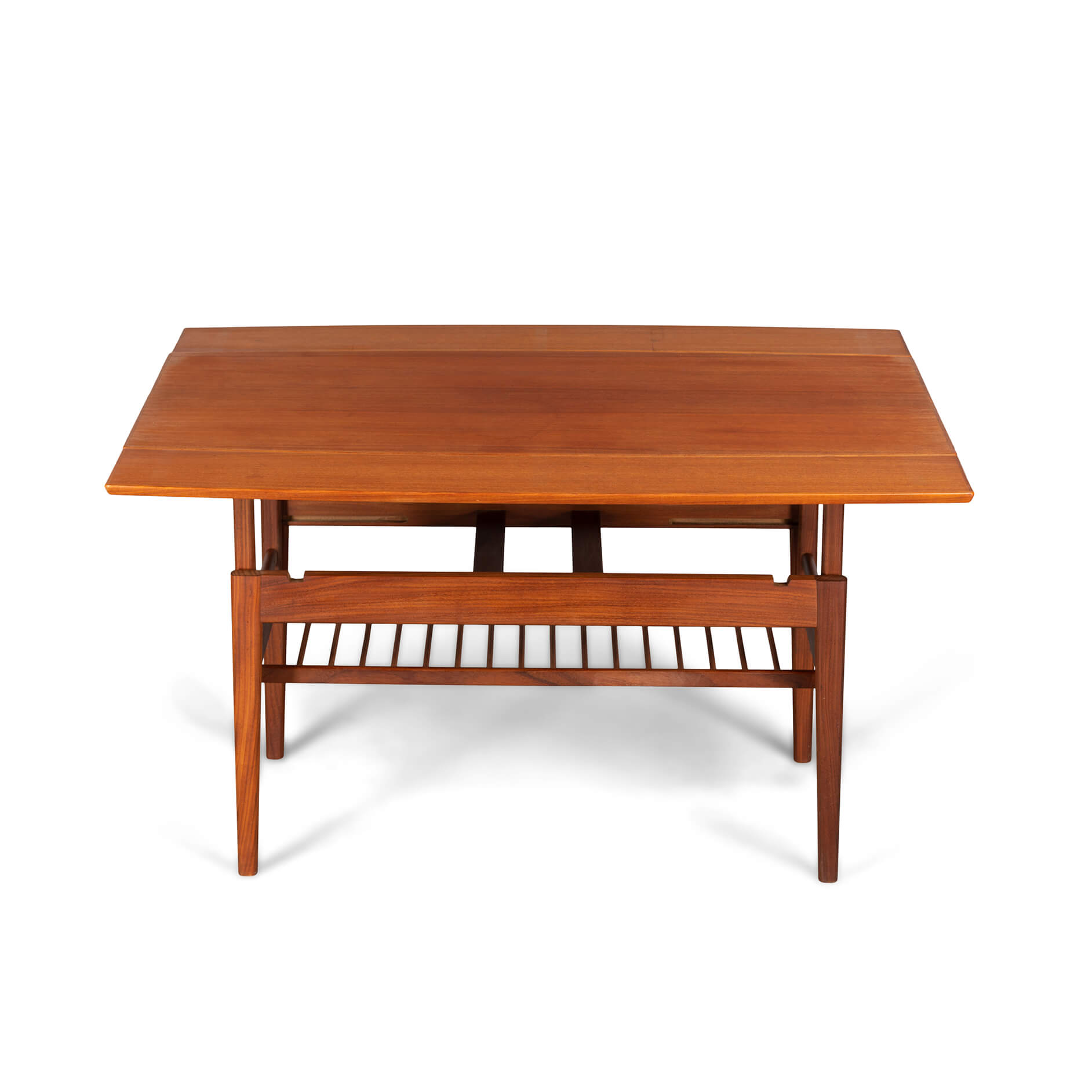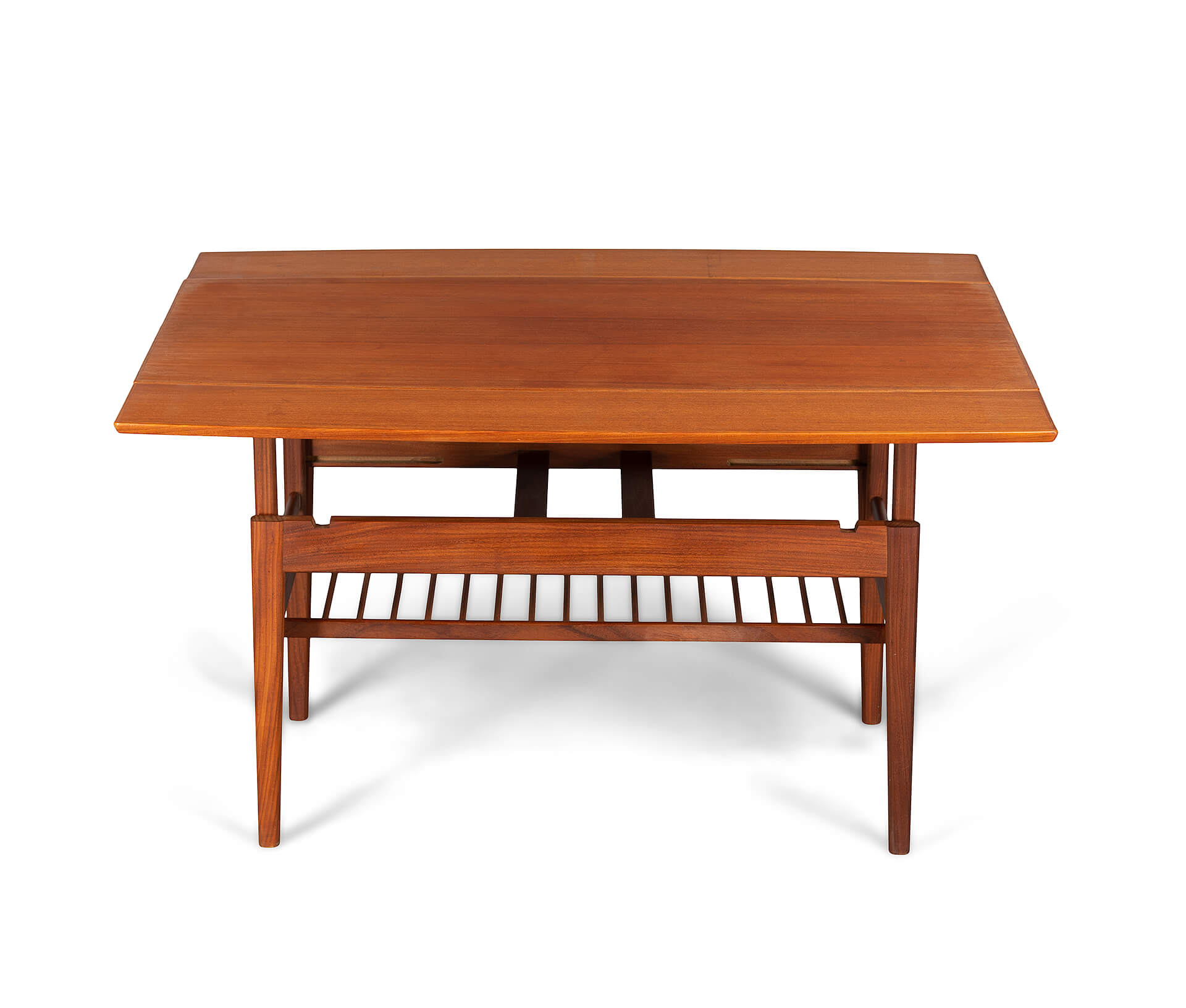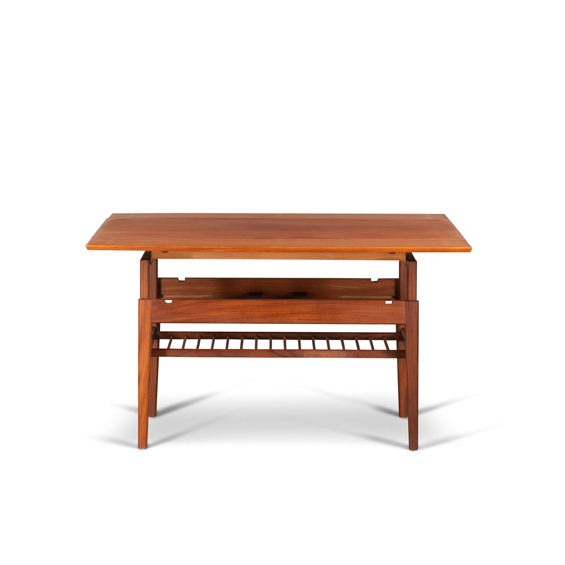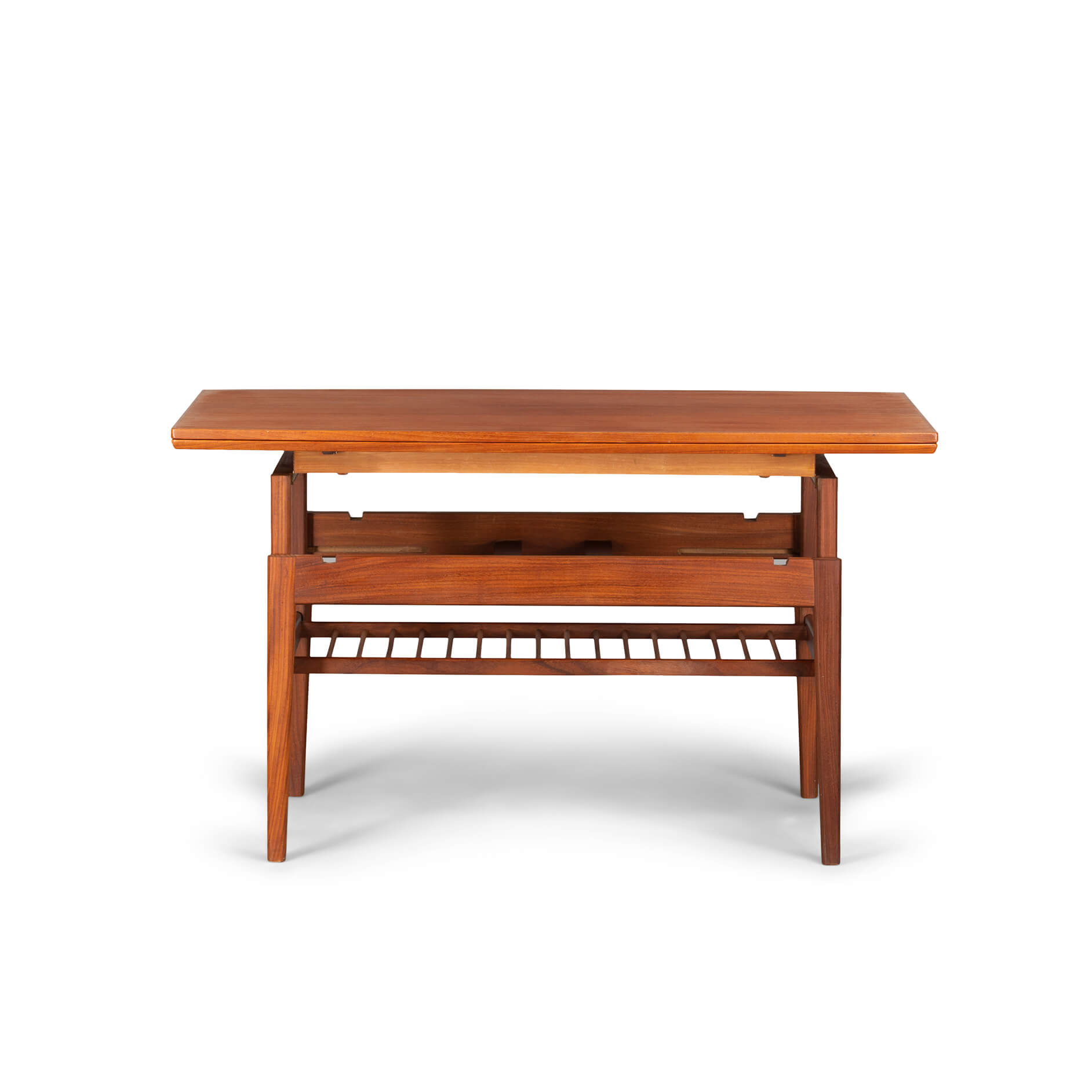Deze multifunctionele tafel van teak verkeert in een zeer goede vintage staat. Overigens is deze tafel een zeldzame vondst vanwege het tijdschriftenrek onder het blad van de salontafel.