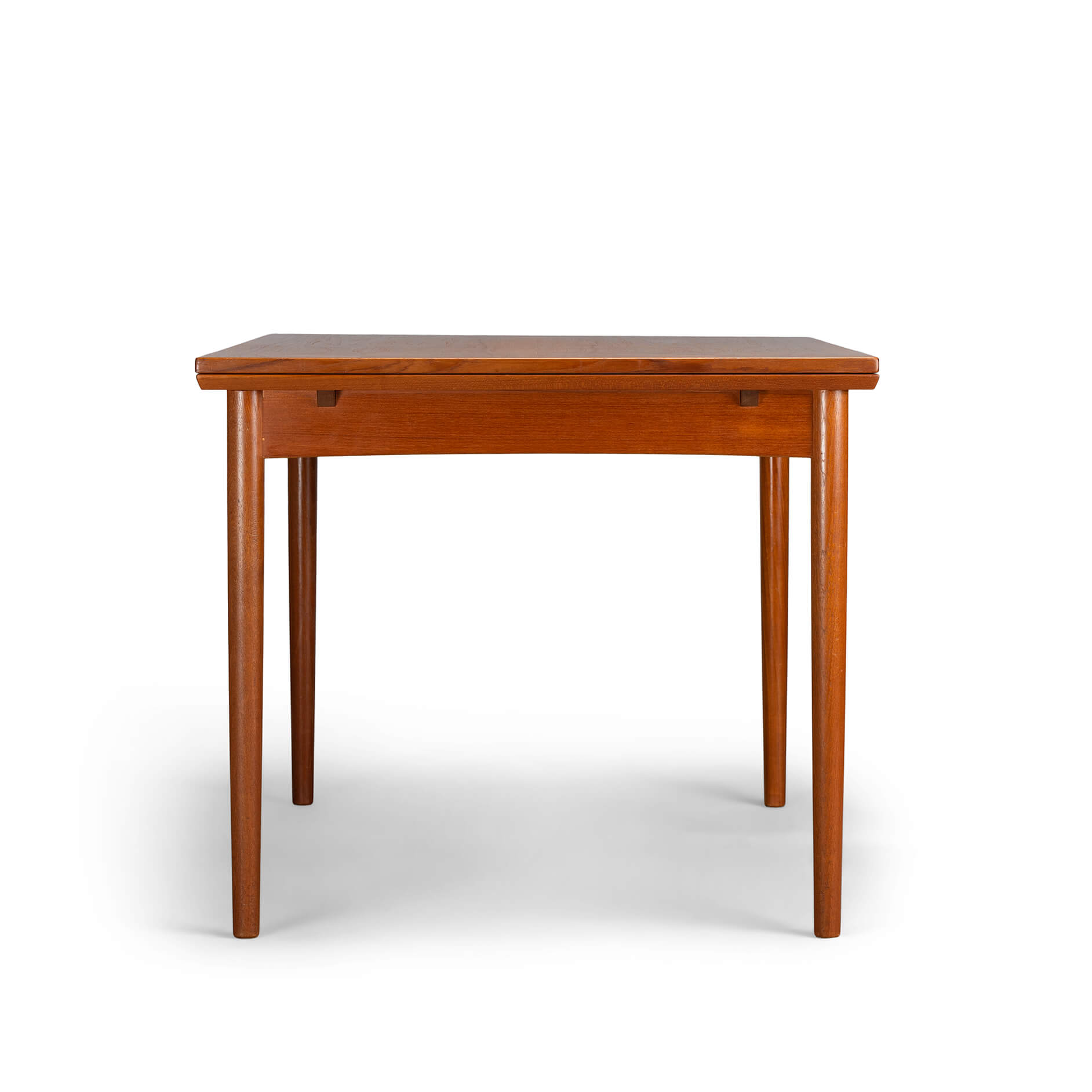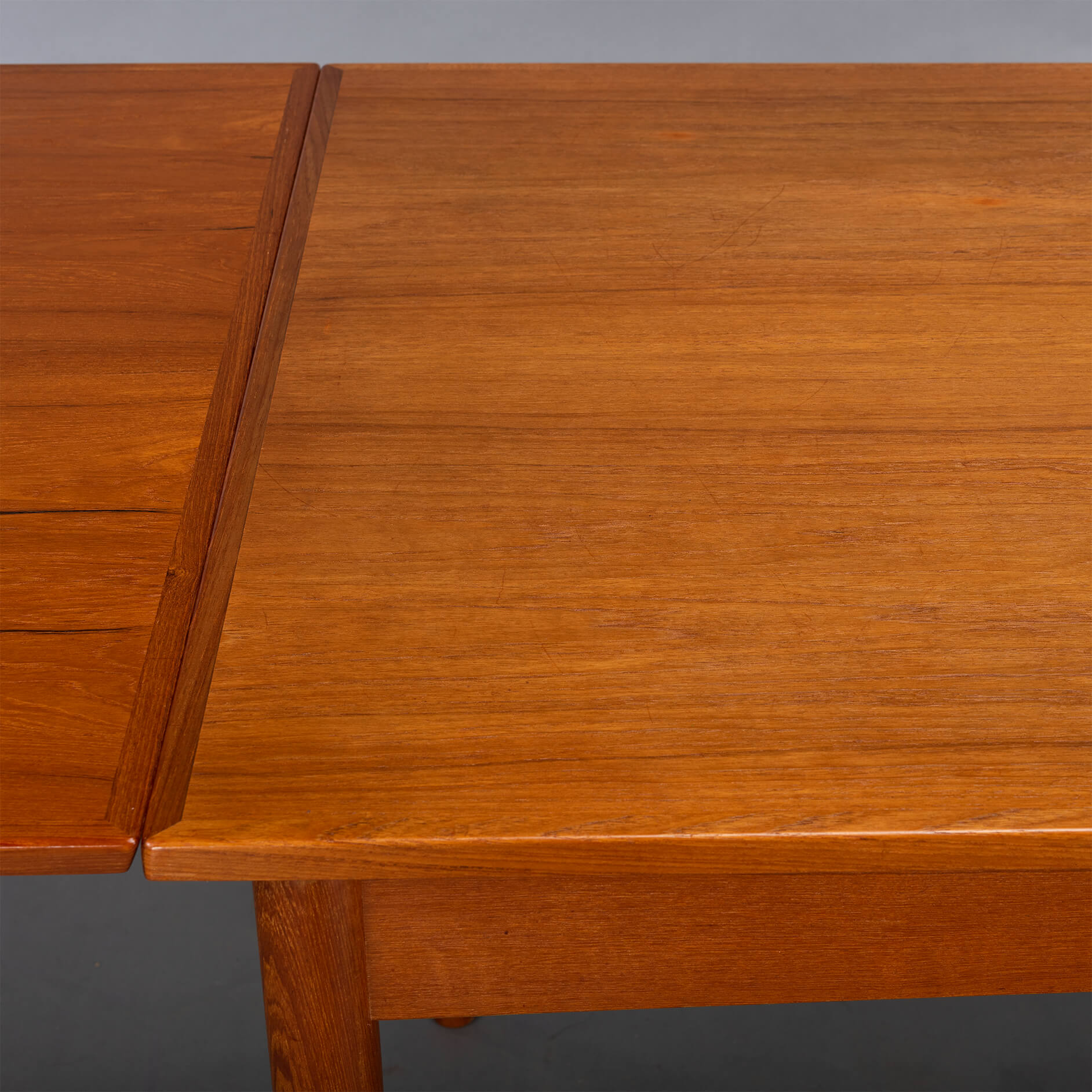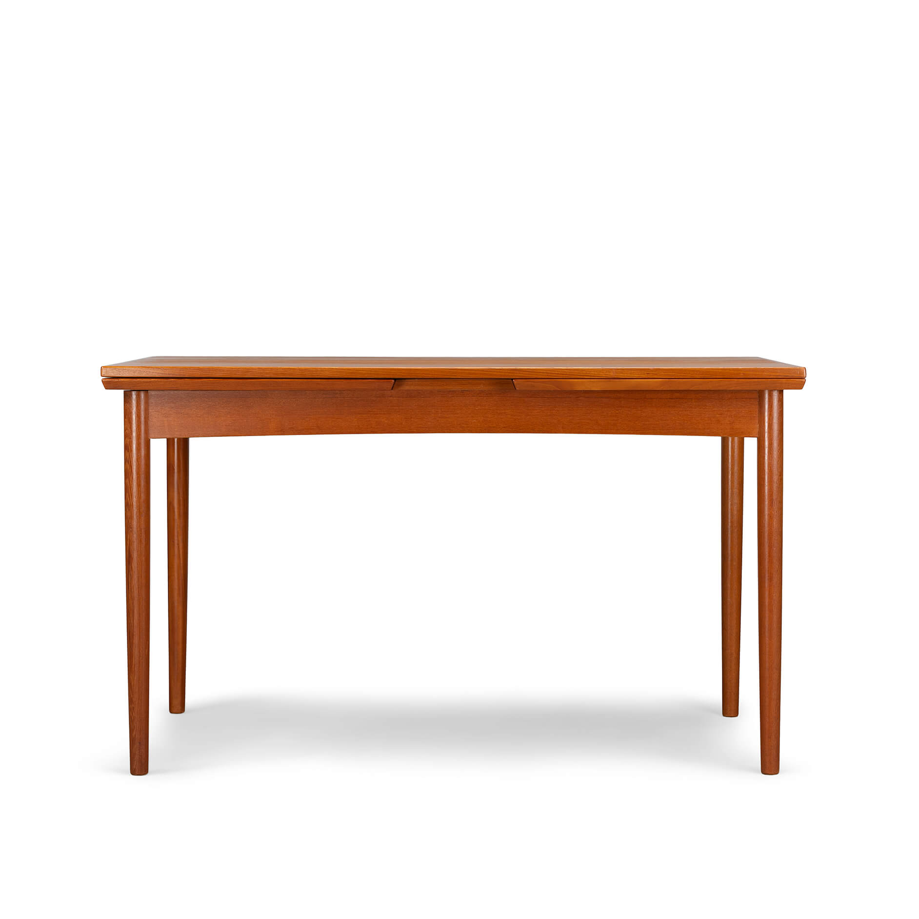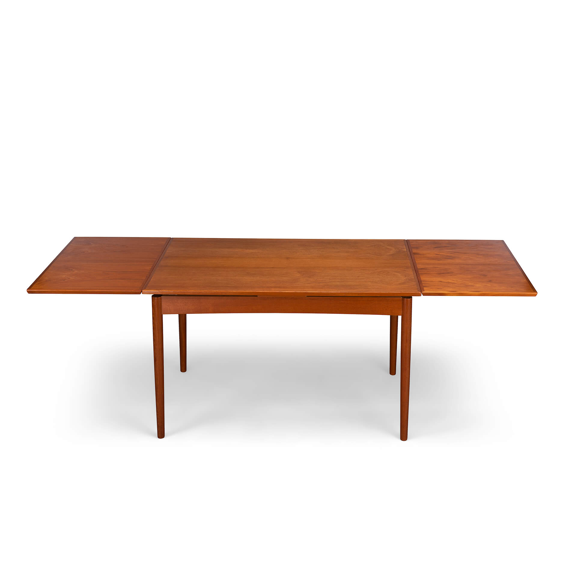 Deze Deense eetkamer tafel uit teak is gemaakt midden jaren 60. Deze tafel heeft massief houten poten en is uitschuifbaar aan weerszijden tot een totaal van 229 cm. Beide uitschuifbladen zitten verborgen onder het blad en schuiven uit middels een robuust mechanisme. Ieder uitschuifbaar blad is 52cm.