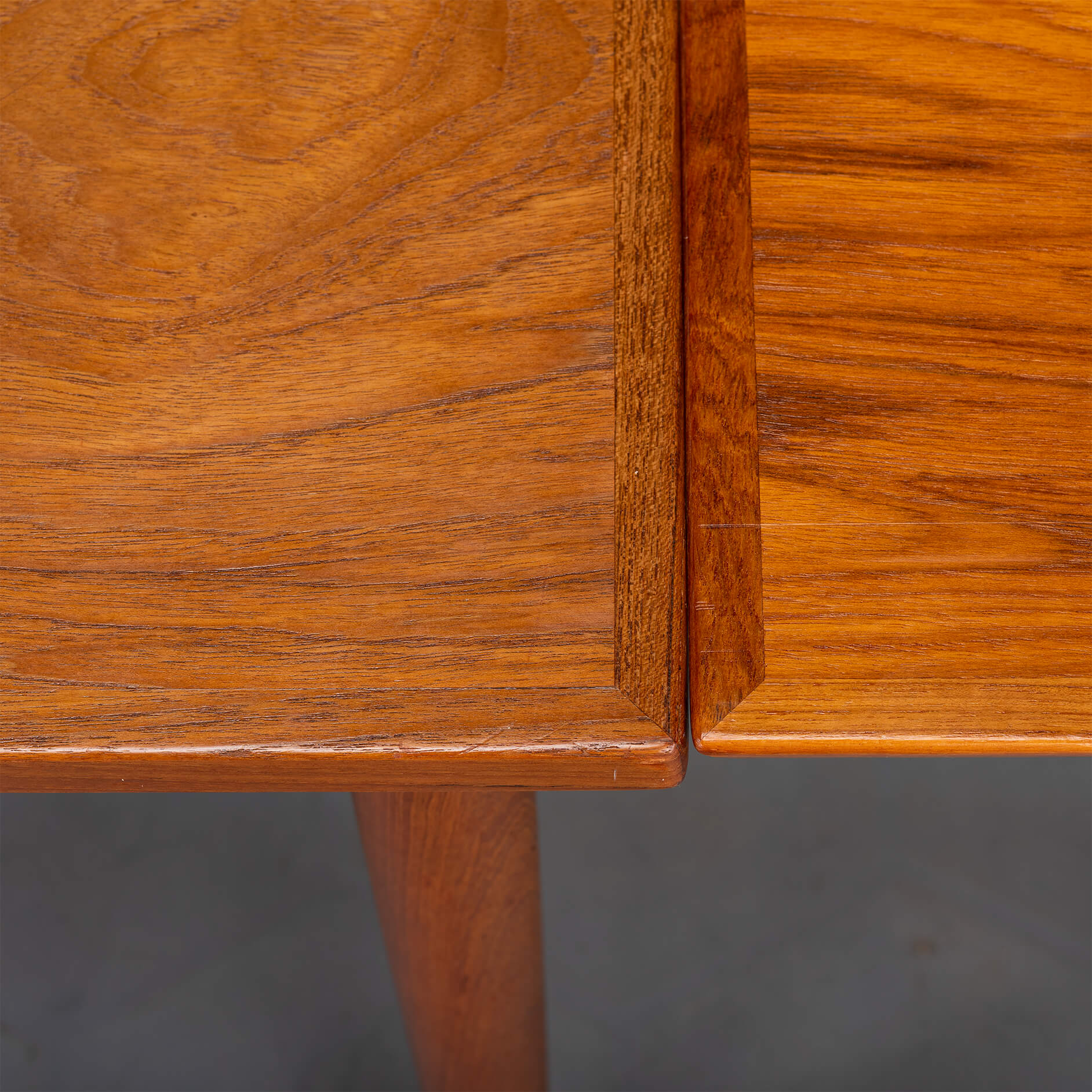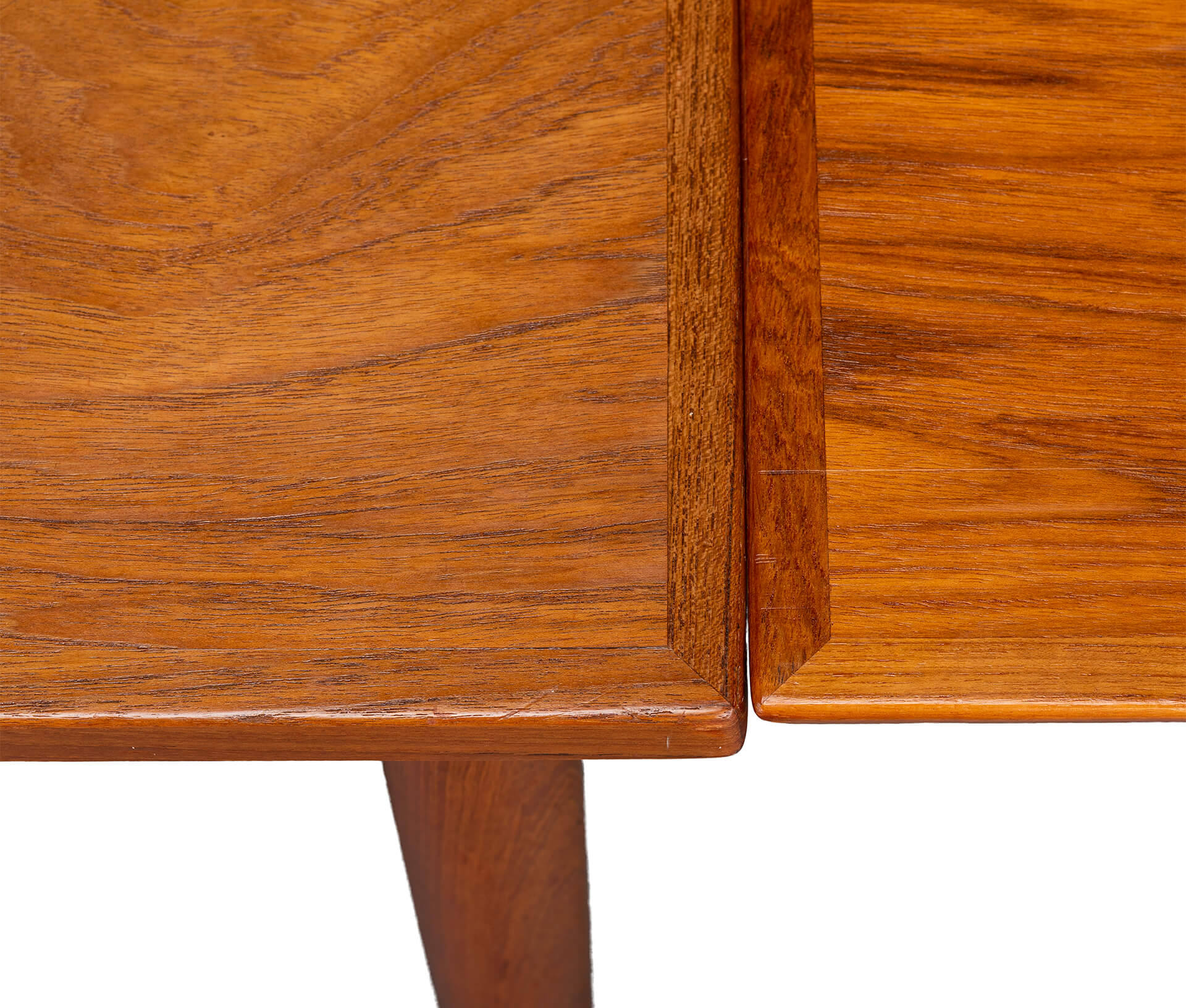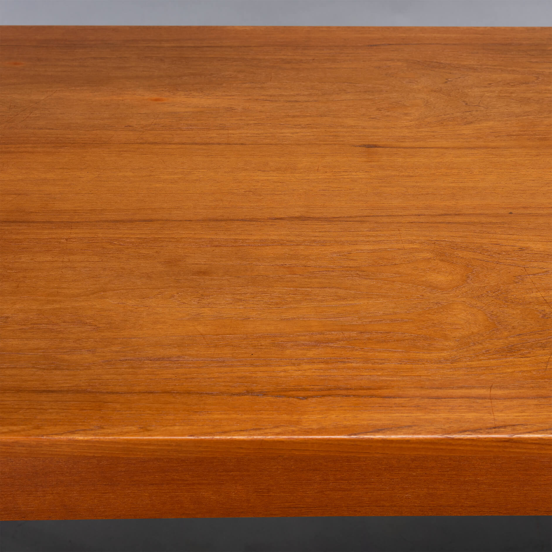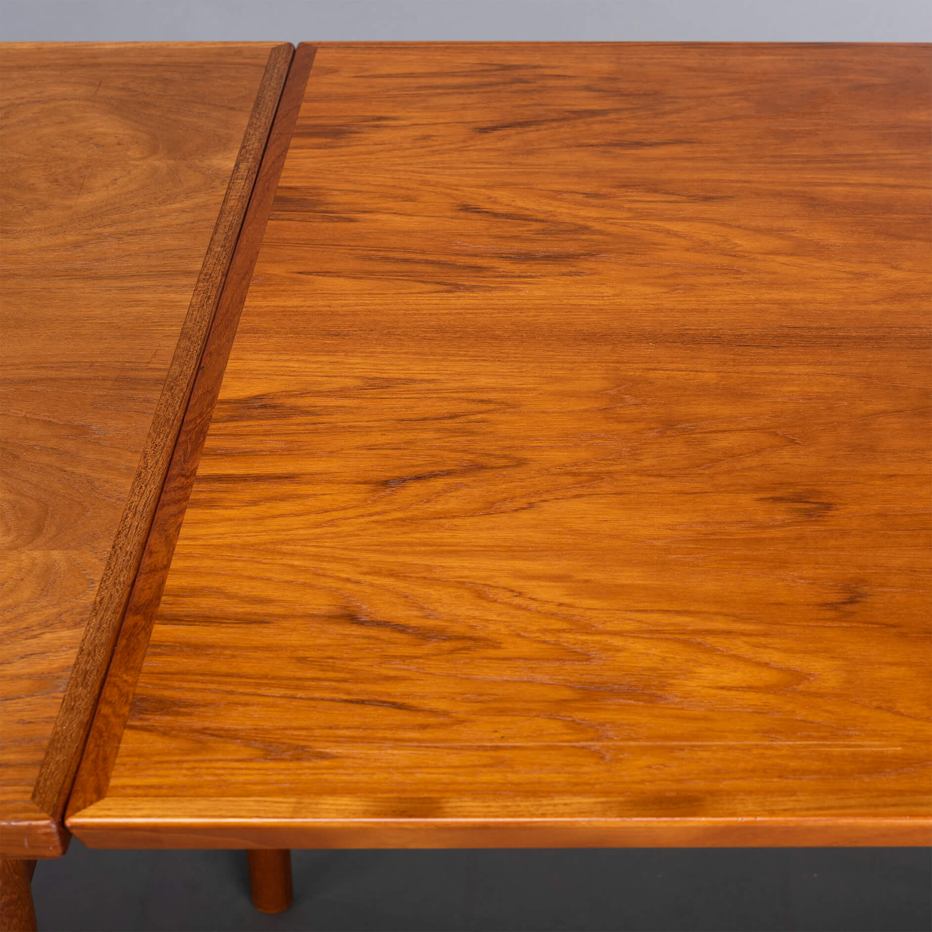 Deze Deense eetkamer tafel uit teak is gemaakt midden jaren 60. Deze tafel heeft massief houten poten en is uitschuifbaar aan weerszijden tot een totaal van 229 cm. Beide uitschuifbladen zitten verborgen onder het blad en schuiven uit middels een robuust mechanisme. Ieder uitschuifbaar blad is 52cm.