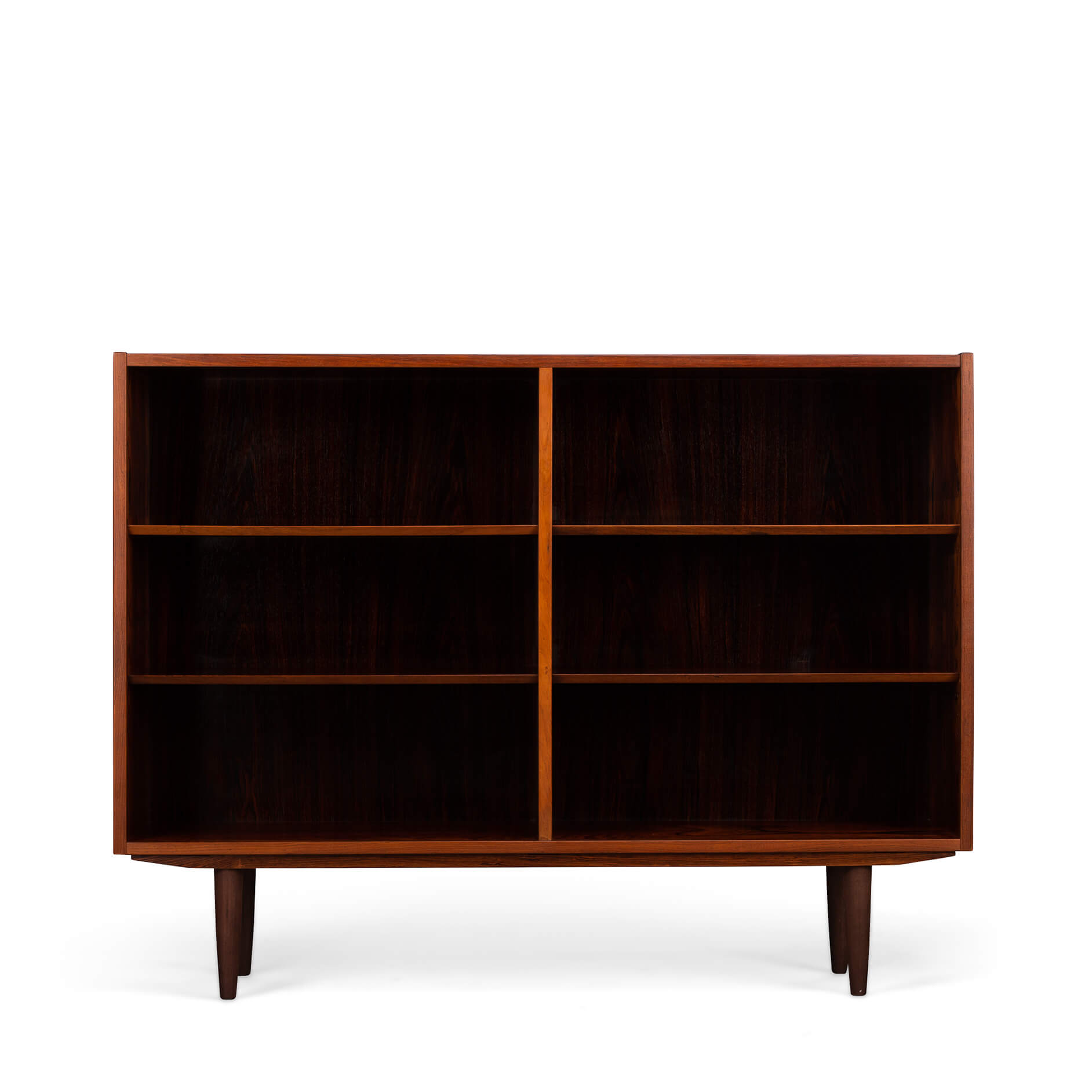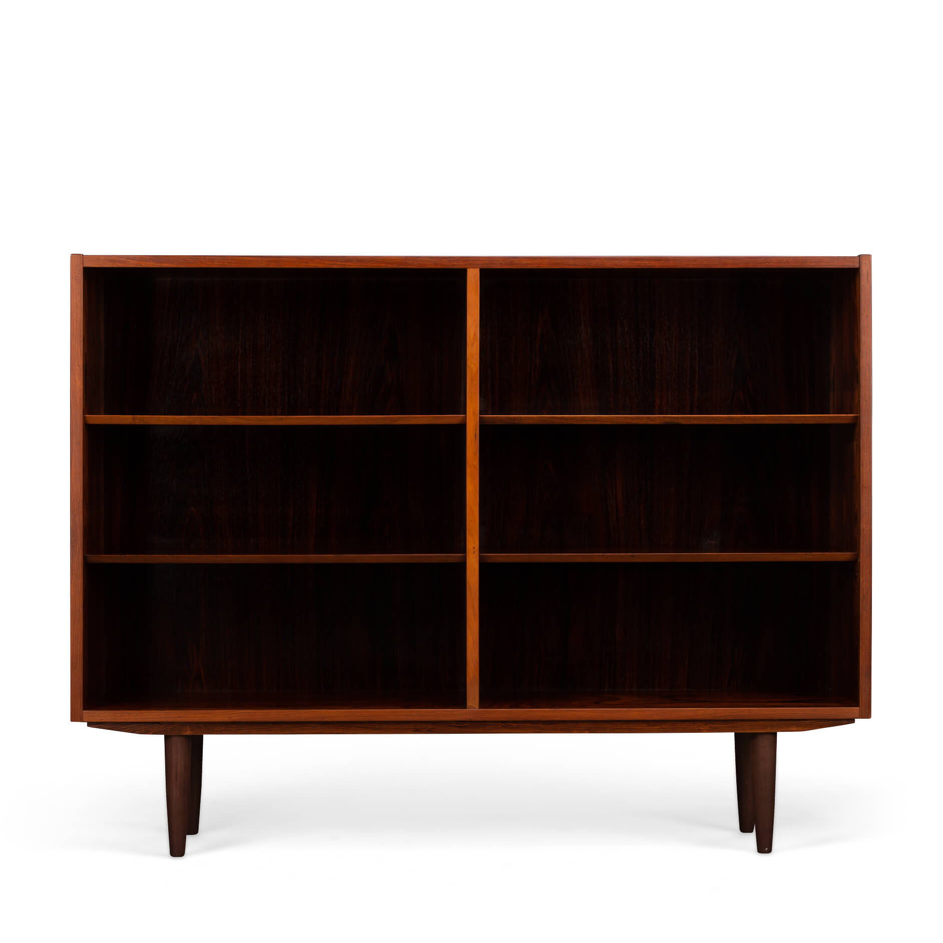 Deense lage boekenkast in prachtig palissander fineer. Het palissander is mooi verkleurd in de loop van de jaren. De kast is ontworpen door Carlo Jensen en gemaakt door Hundevad & Co. Helaas is de sticker verloren geraakt in de loop van de jaren. Een Hundevad boekenkast is echter altijd te herkennen aan de planken die afgeschuind zijn.