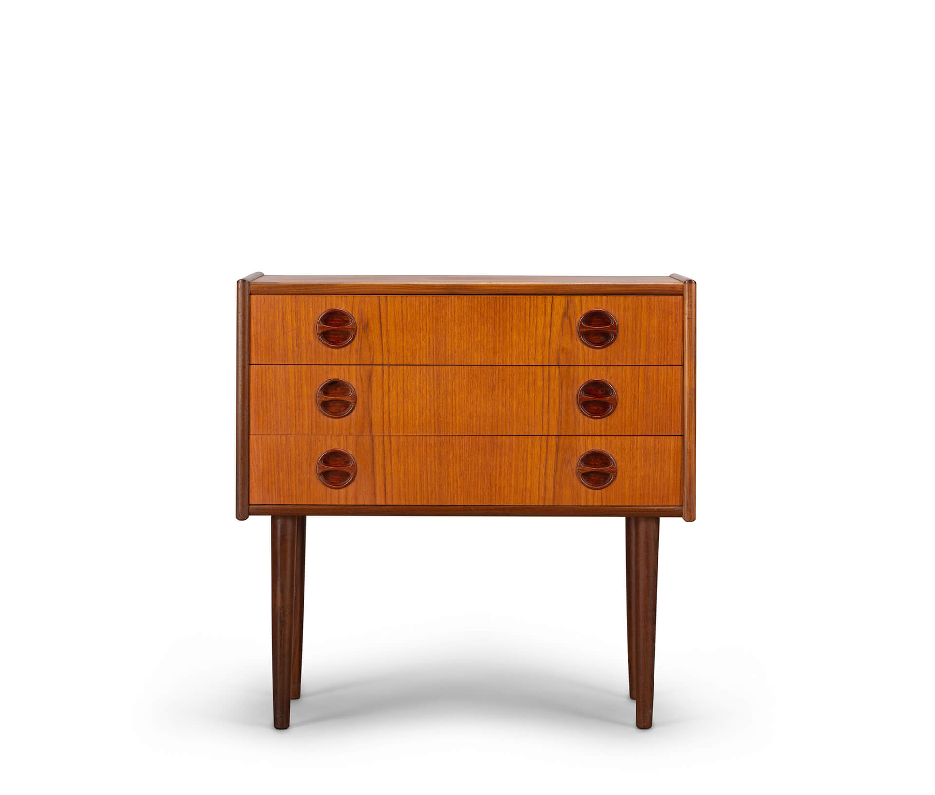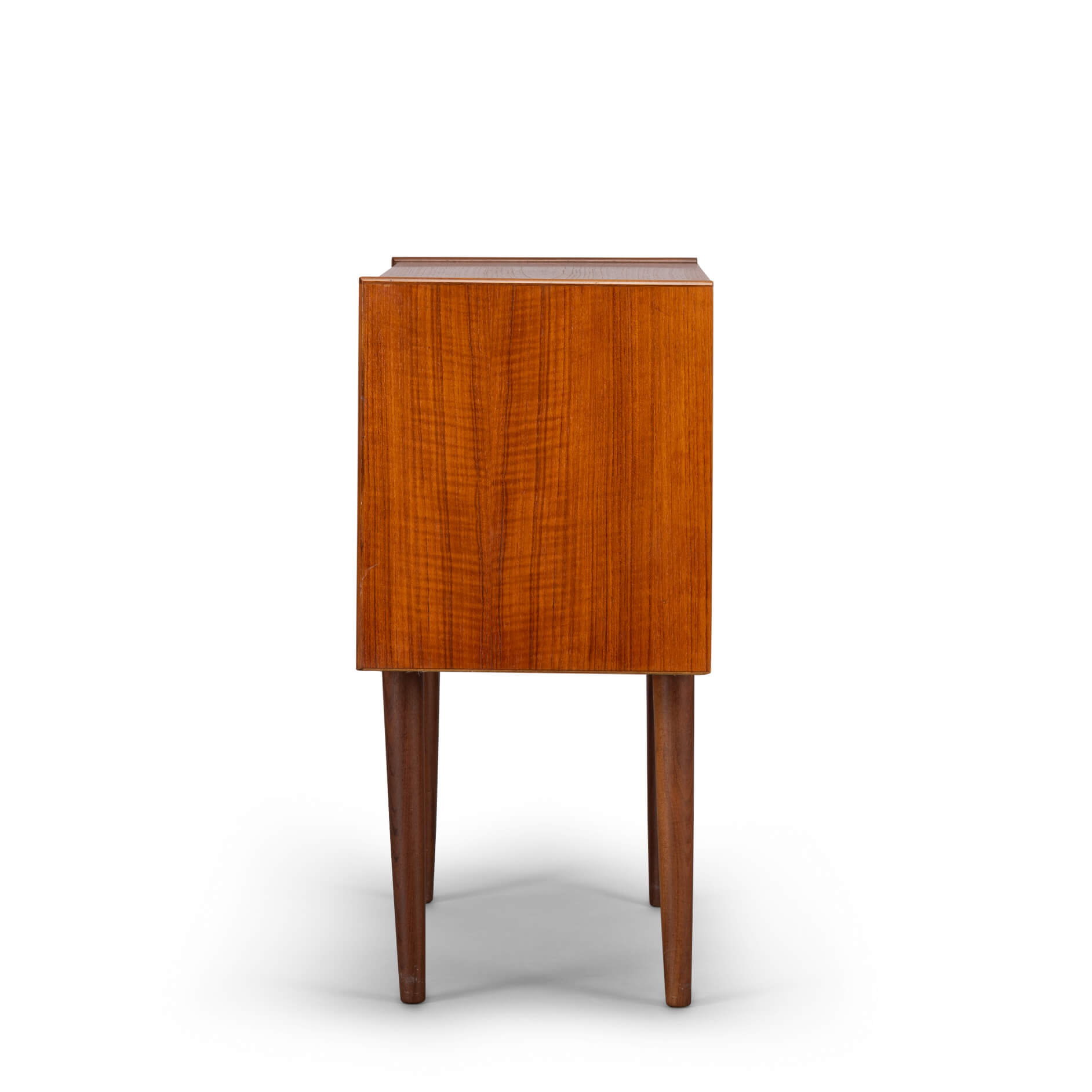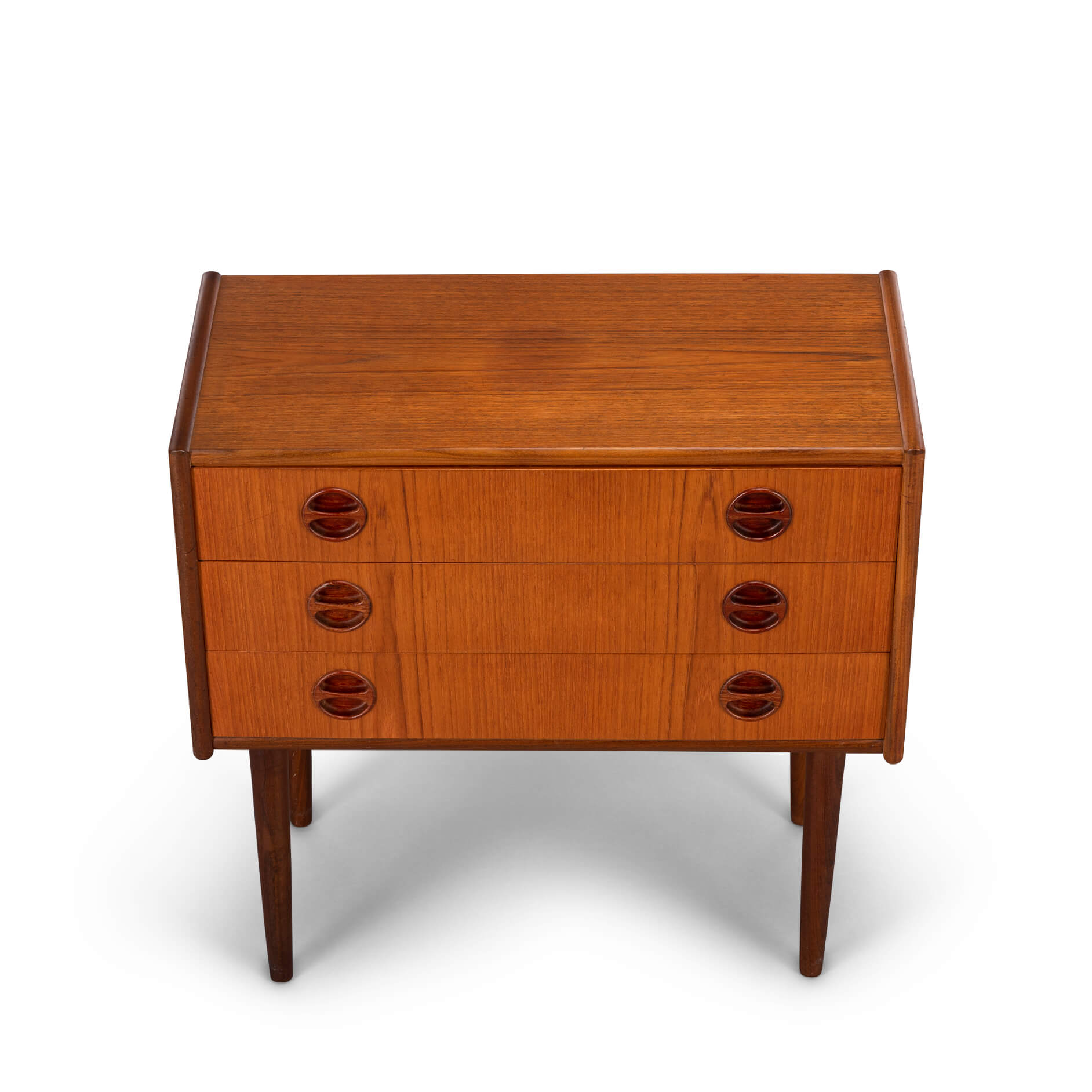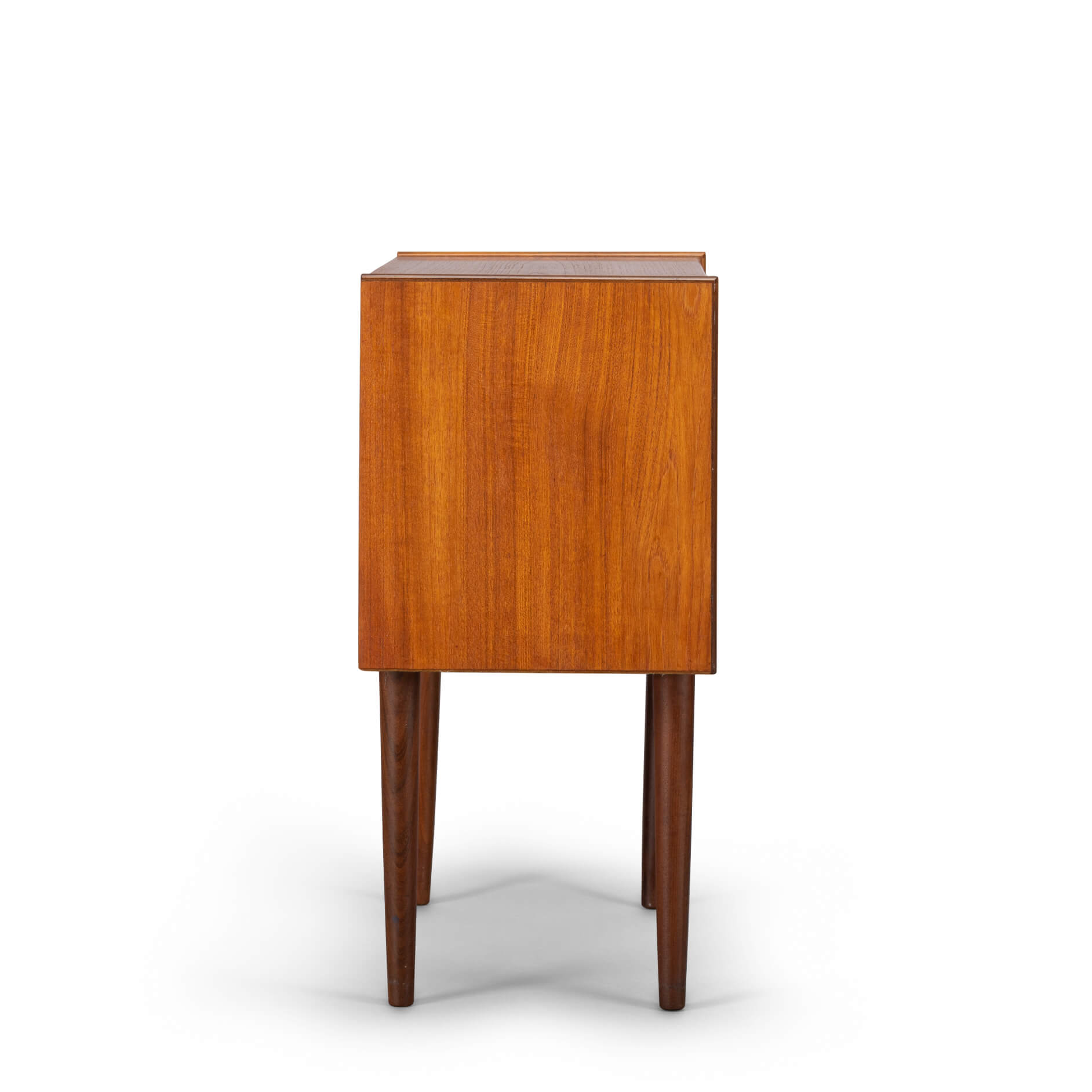 Dit kleine Deense (nacht)kastje is uitgevoerd in teak en gemaakt in de late jaren 60. Drie lades met coole grepen, zo kenmerkend voor die tijd zorgen voor de sixties look.