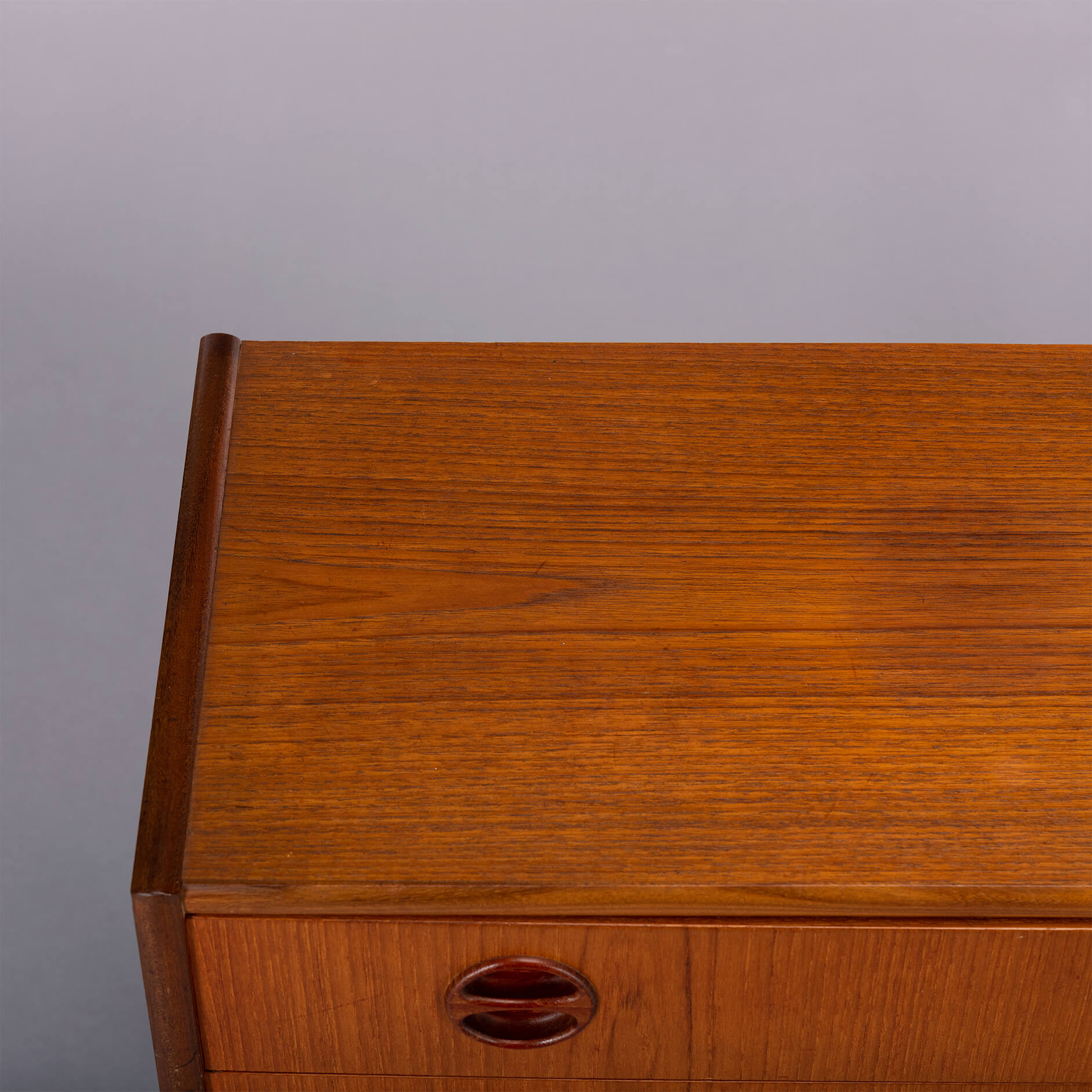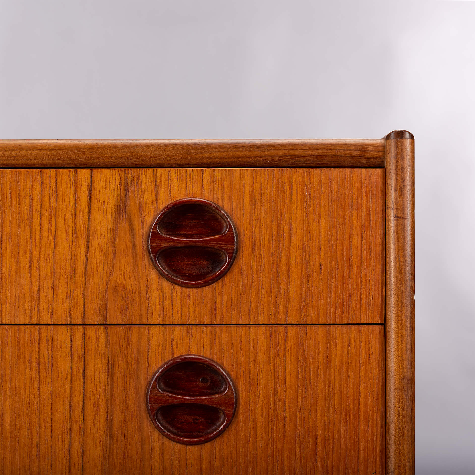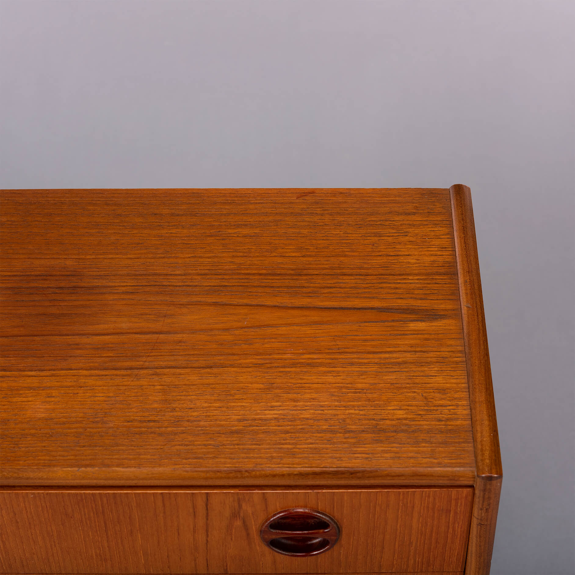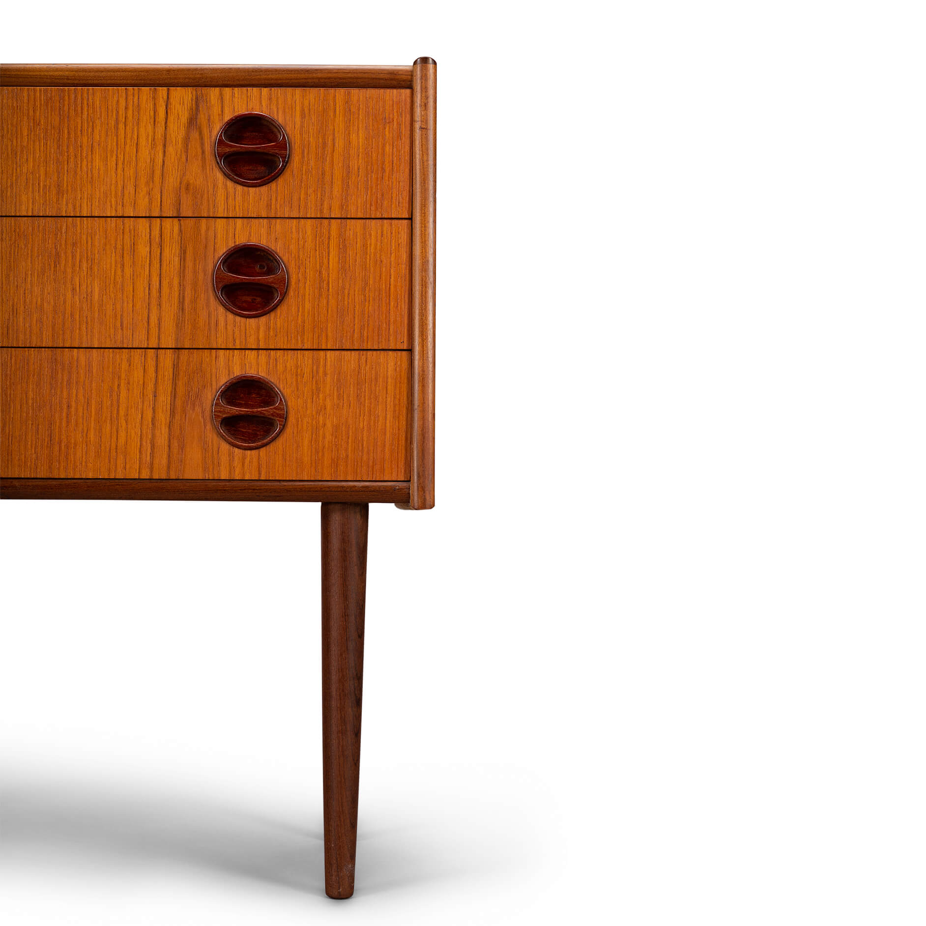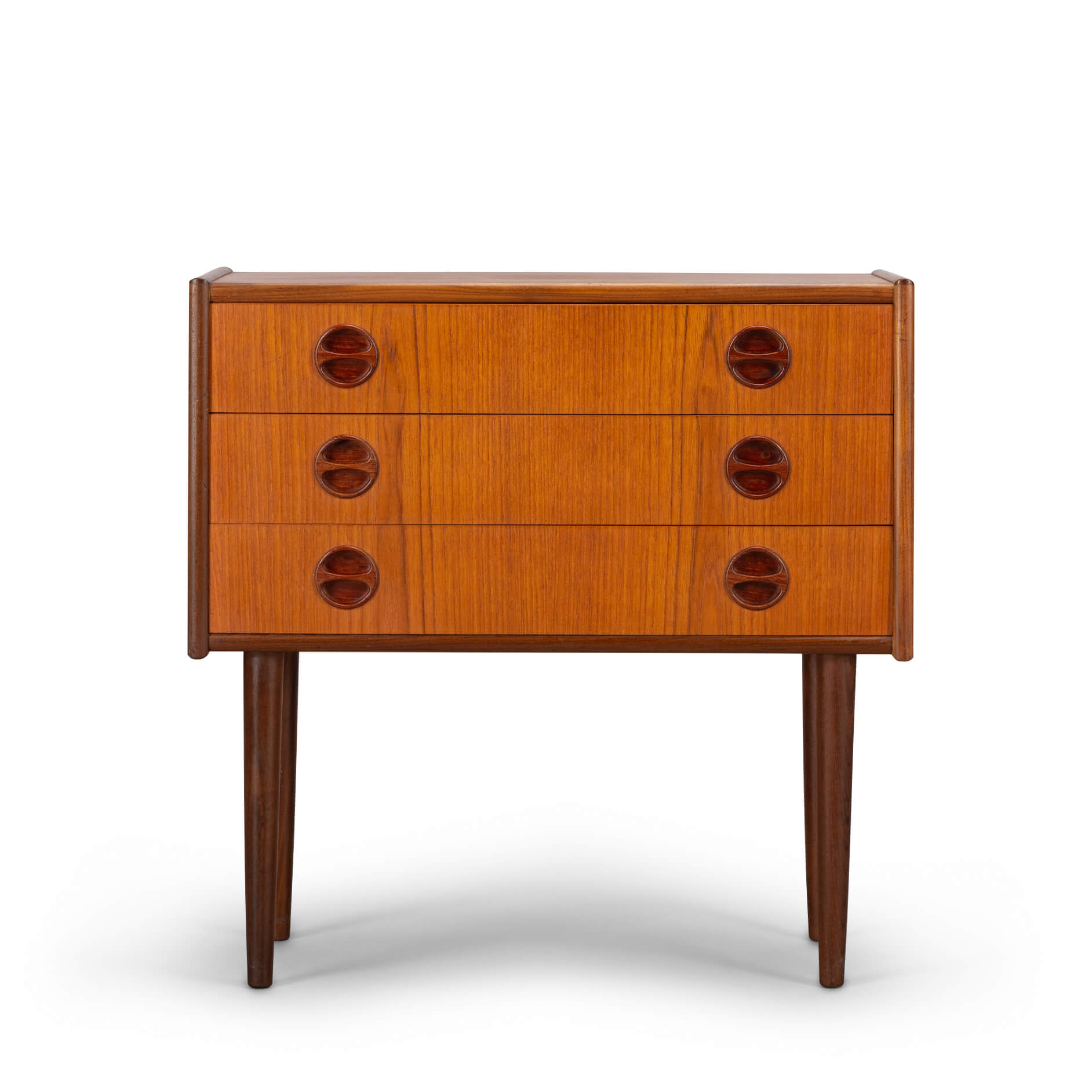 Dit kleine Deense (nacht)kastje is uitgevoerd in teak en gemaakt in de late jaren 60. Drie lades met coole grepen, zo kenmerkend voor die tijd zorgen voor de sixties look.