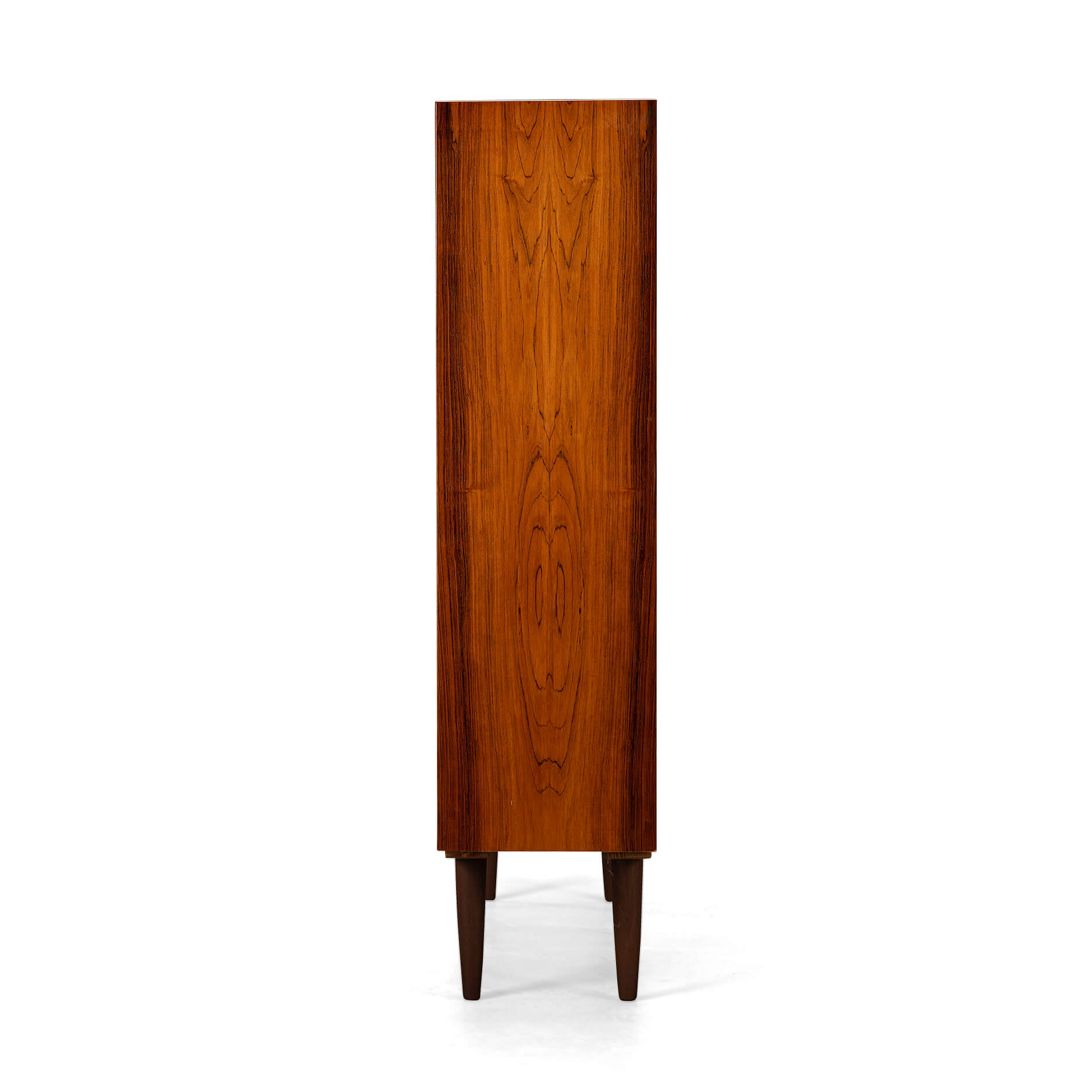 Deense hoge boekenkast in prachtig palissander fineer. Design by Carlo Jensen en gemaakt door Hundevad & Co. Deze hoge vintage boekenkast verkeert in een zeer goede vintage staat en heeft in totaal 6 in hoogte verstelbare planken verdeeld over de twee helften van de kast.