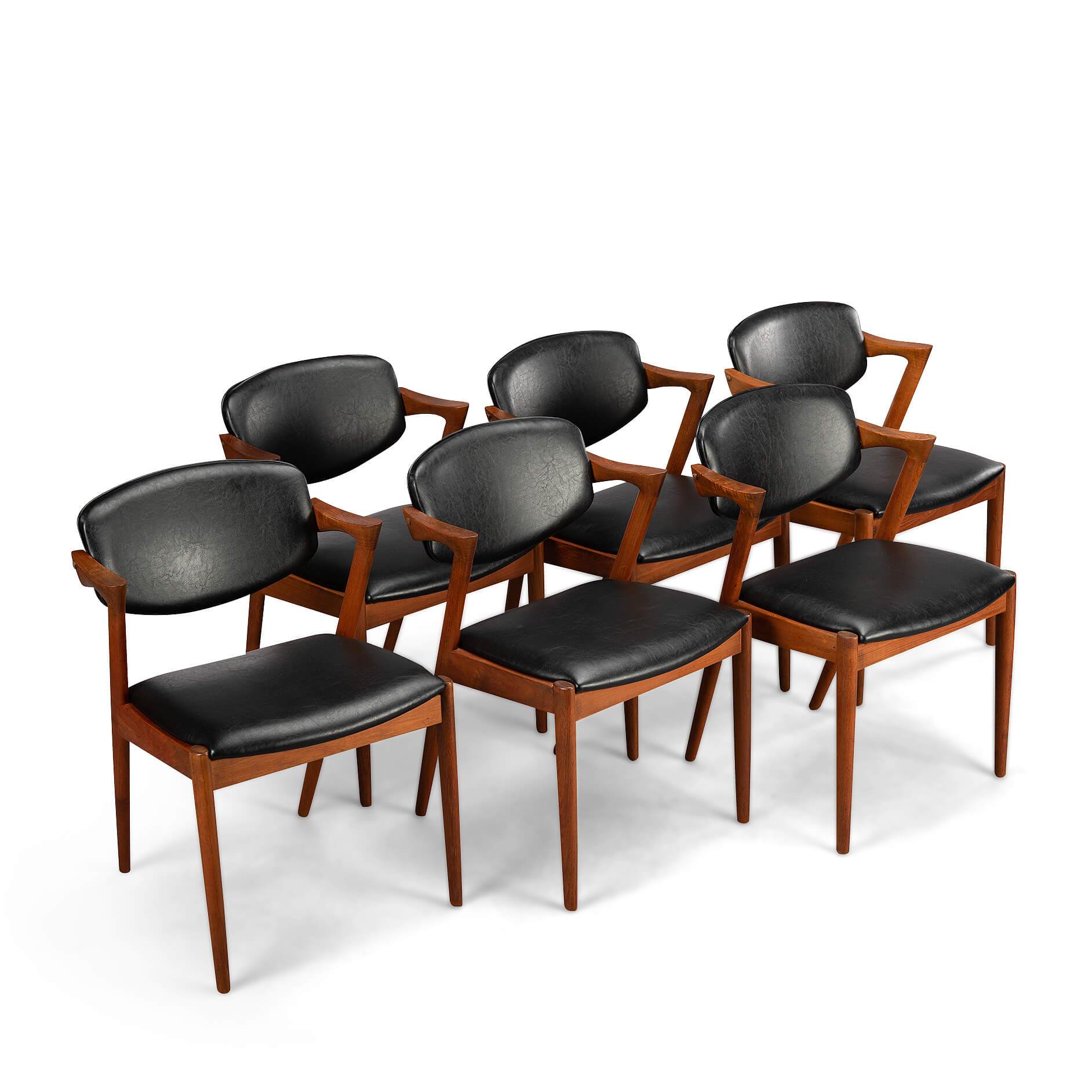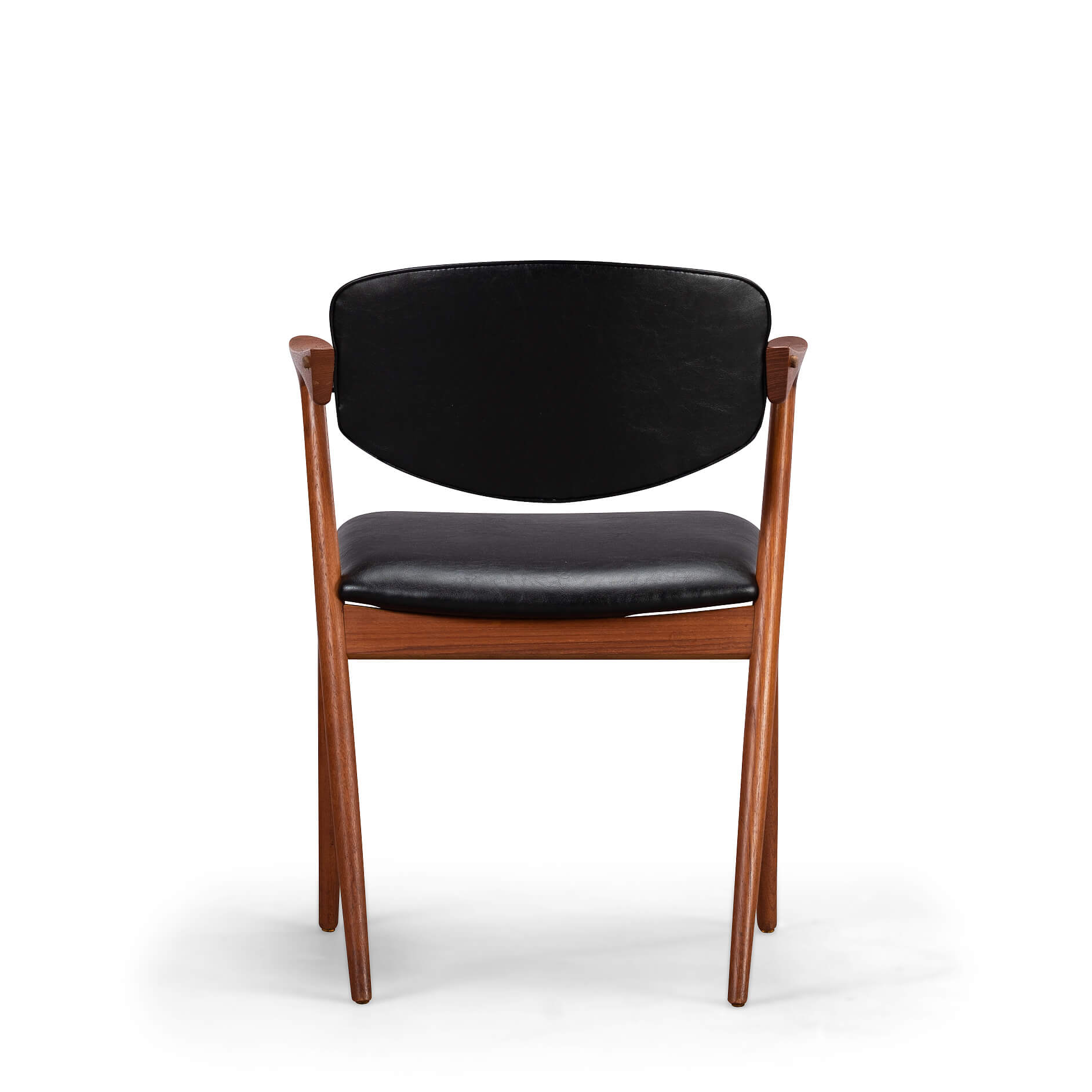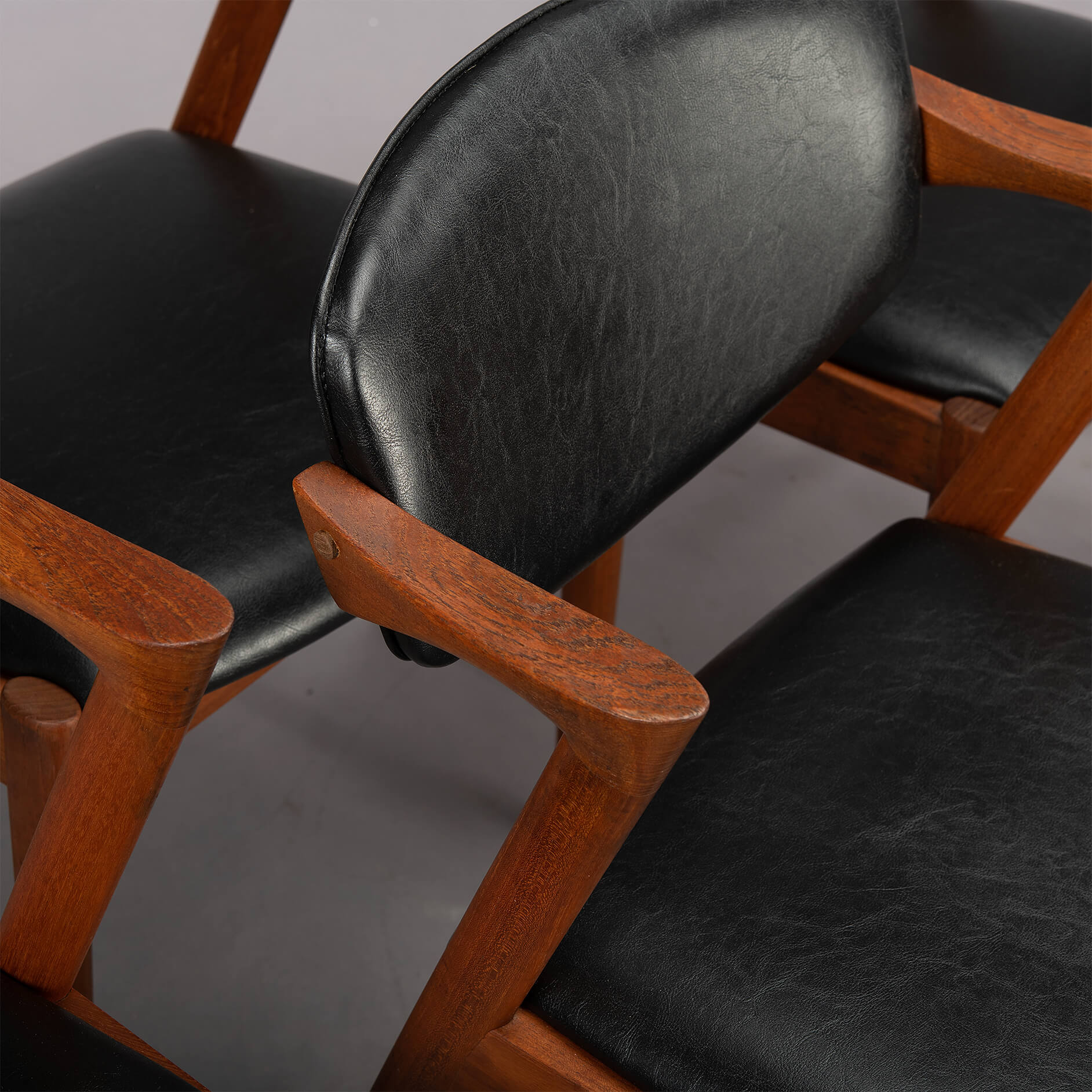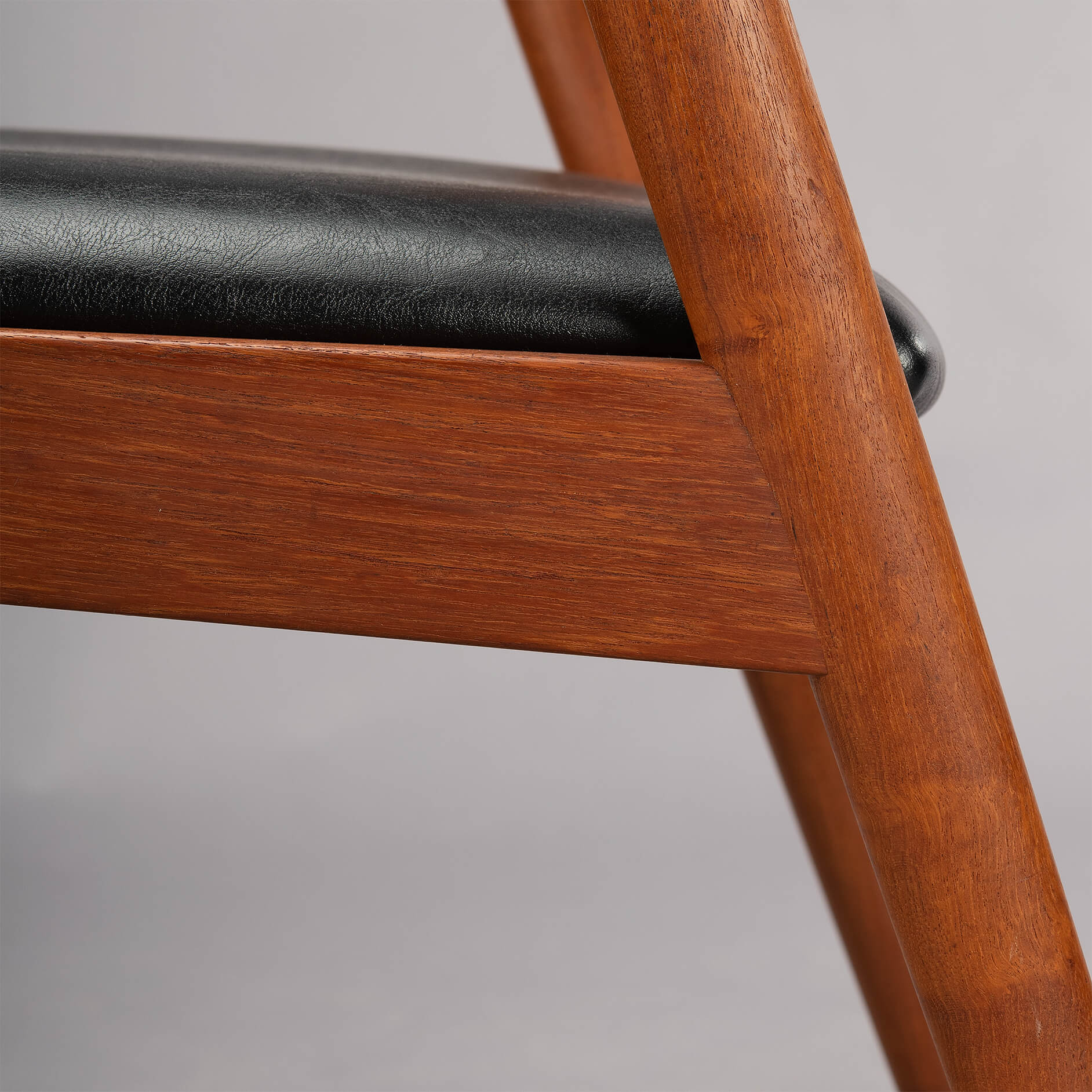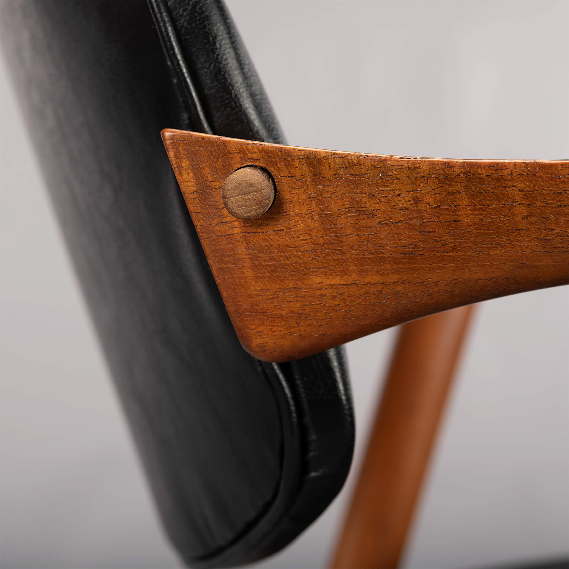 Wat op het eerste gezicht mogelijk wat oncomfortabel oogt, zit eigenlijk als gegoten. De armleuningen hebben exact de juiste lengte. Lang genoeg om steun te bieden, kort genoeg om niet in de weg te zitten bij het uit de stoel komen. Duidelijk over nagedacht door Kristiansen. De set van 6 is van teak en opnieuw gestofeerd door onze professionele stoffeerder met een hoogwaardige (Retro) kunstleer en daardoor in zeer goede vintage conditie. Deze Retro leatherette heeft een subtiele glans, waardoor deze erg lijkt op de originele bekleding.
