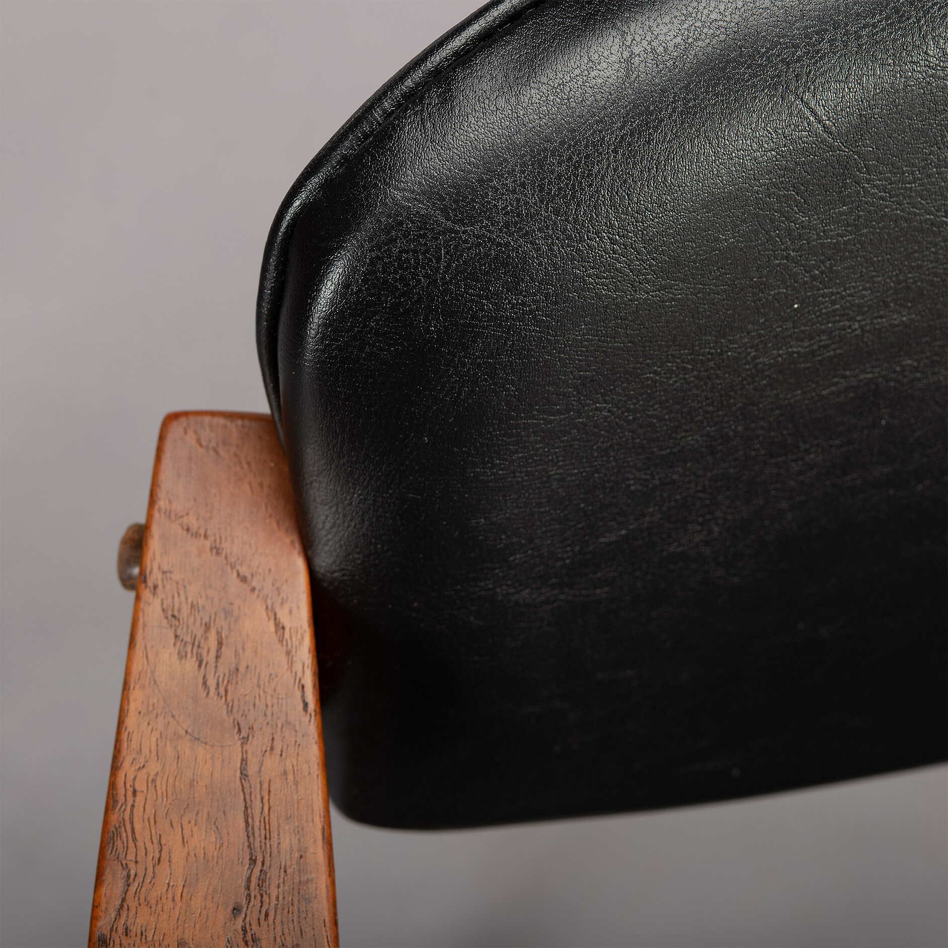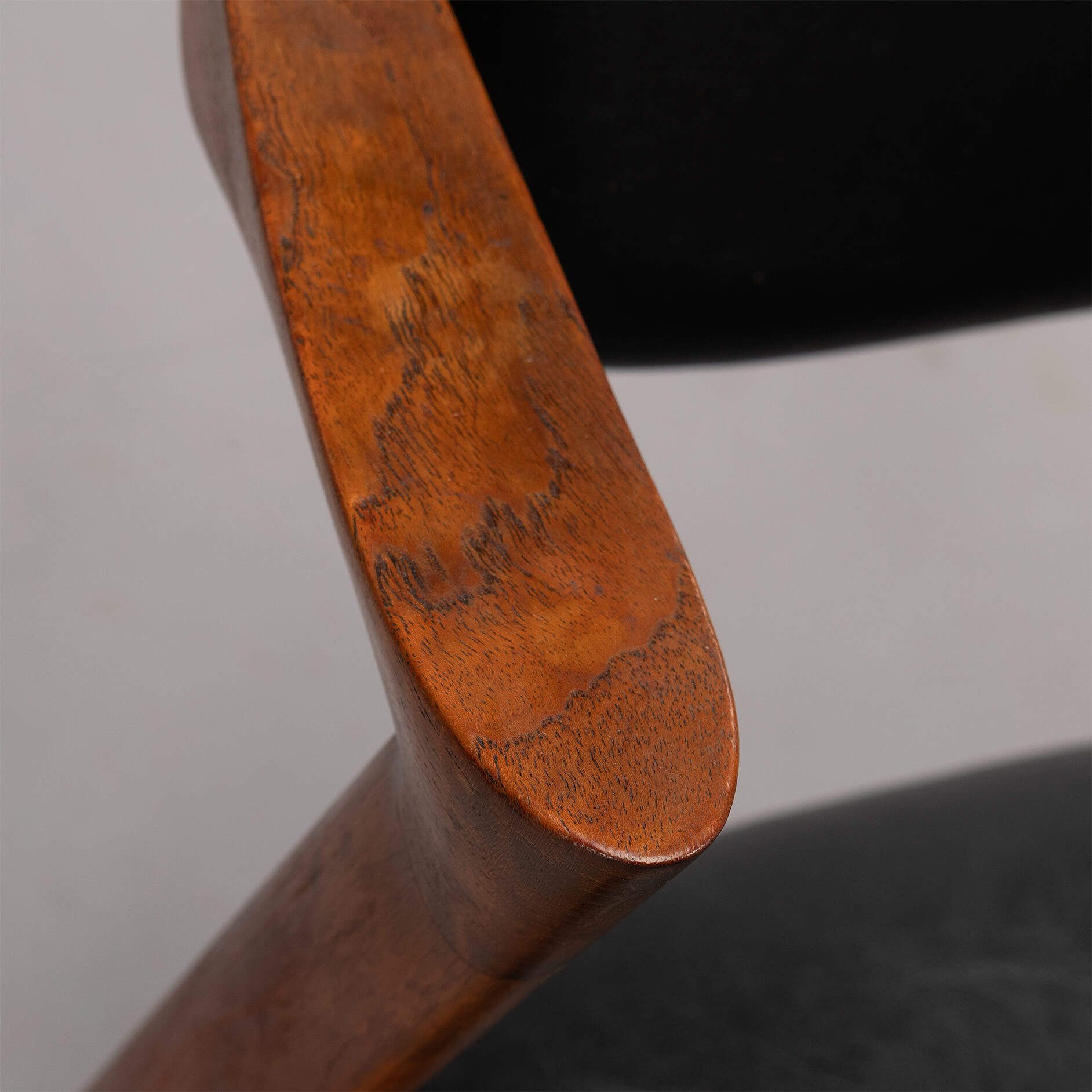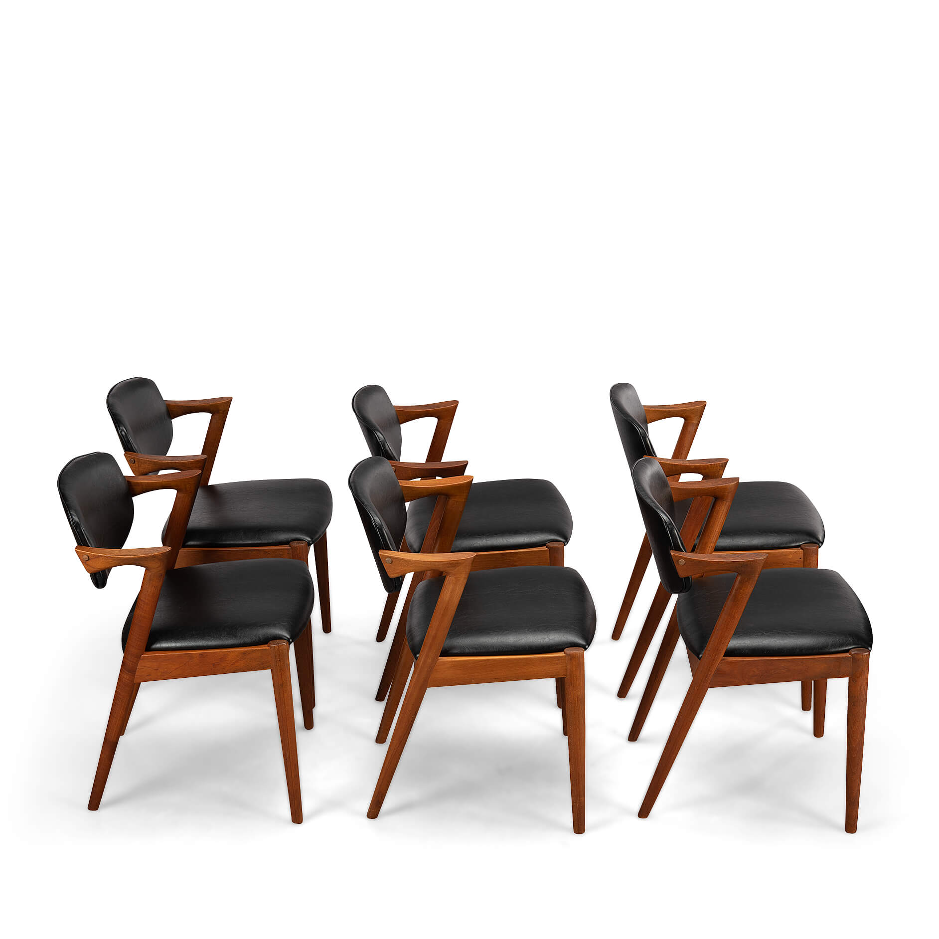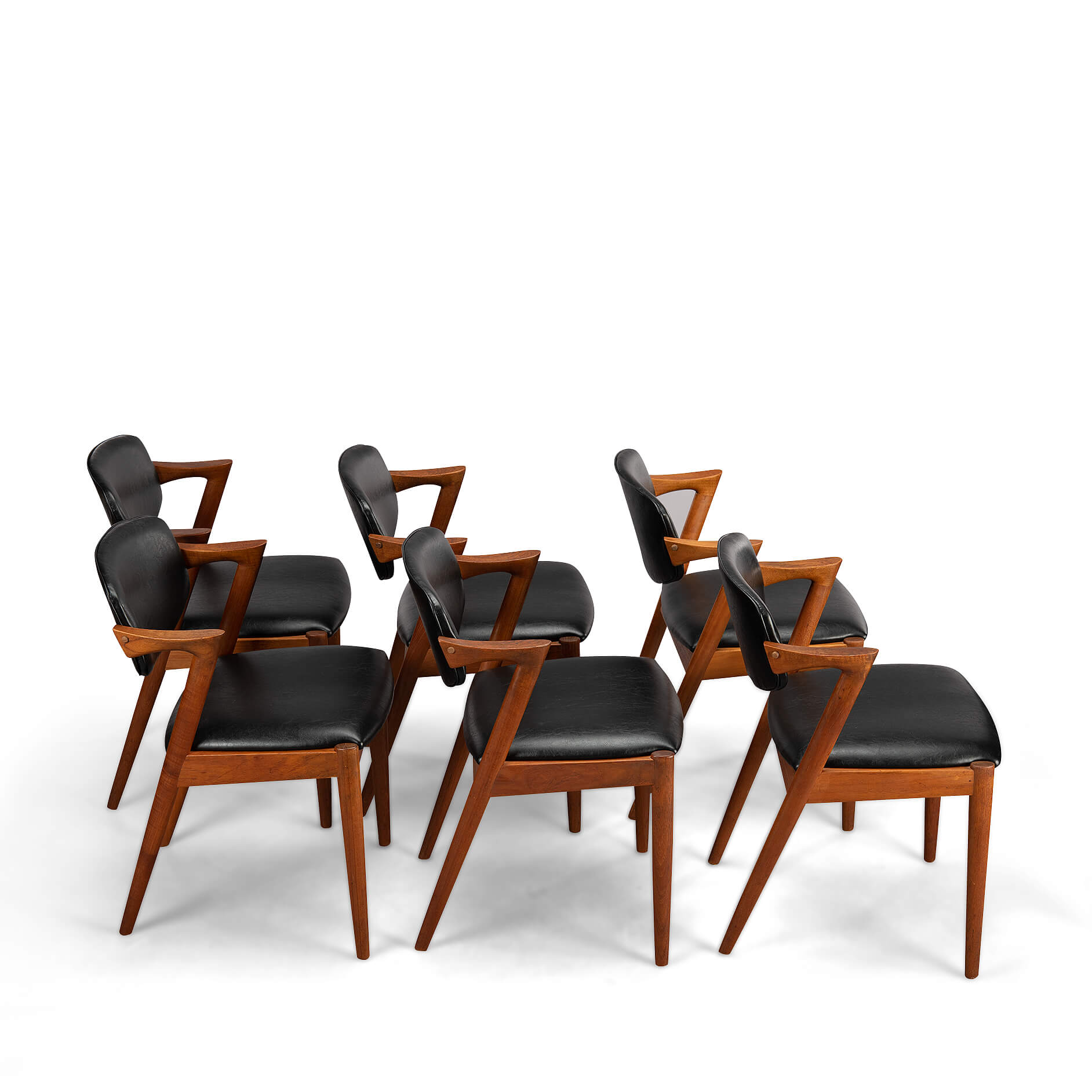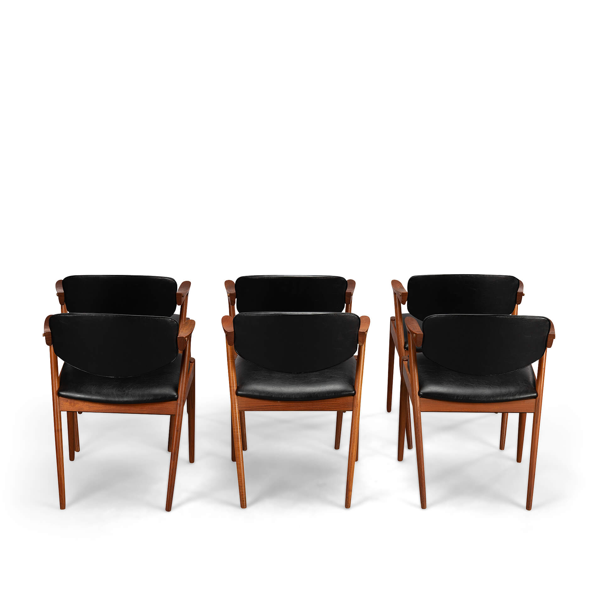 Wat op het eerste gezicht mogelijk wat oncomfortabel oogt, zit eigenlijk als gegoten. De armleuningen hebben exact de juiste lengte. Lang genoeg om steun te bieden, kort genoeg om niet in de weg te zitten bij het uit de stoel komen. Duidelijk over nagedacht door Kristiansen. De set van 6 is van teak en opnieuw gestofeerd door onze professionele stoffeerder met een hoogwaardige (Retro) kunstleer en daardoor in zeer goede vintage conditie. Deze Retro leatherette heeft een subtiele glans, waardoor deze erg lijkt op de originele bekleding.