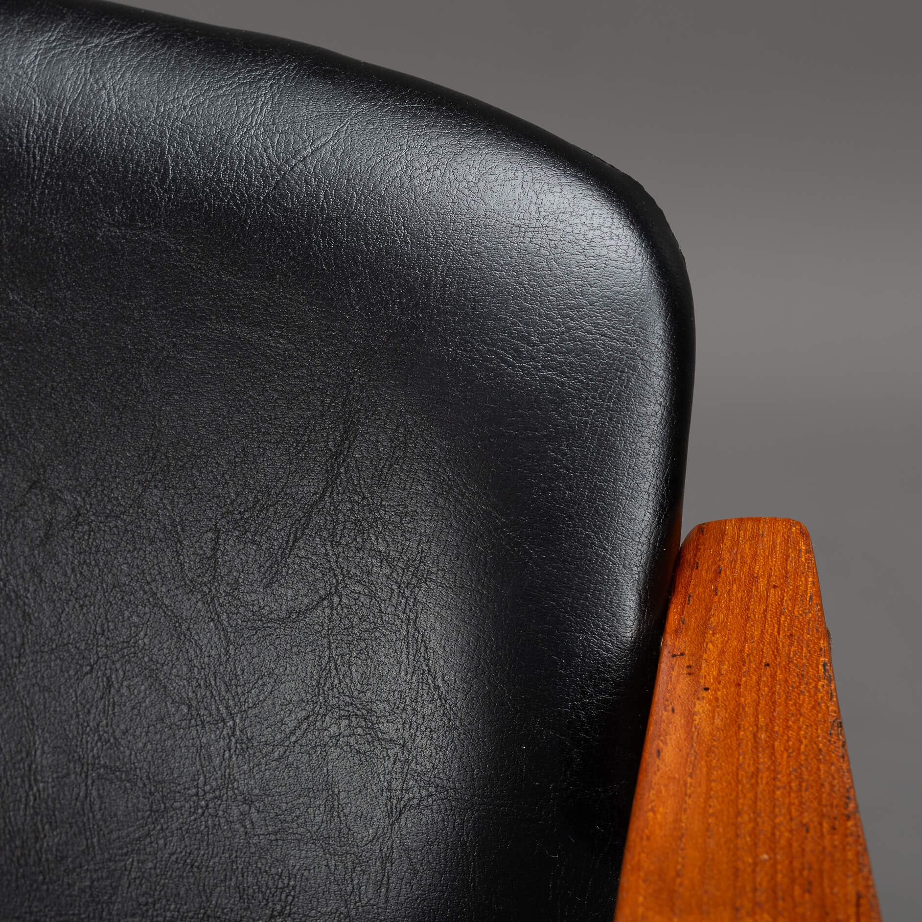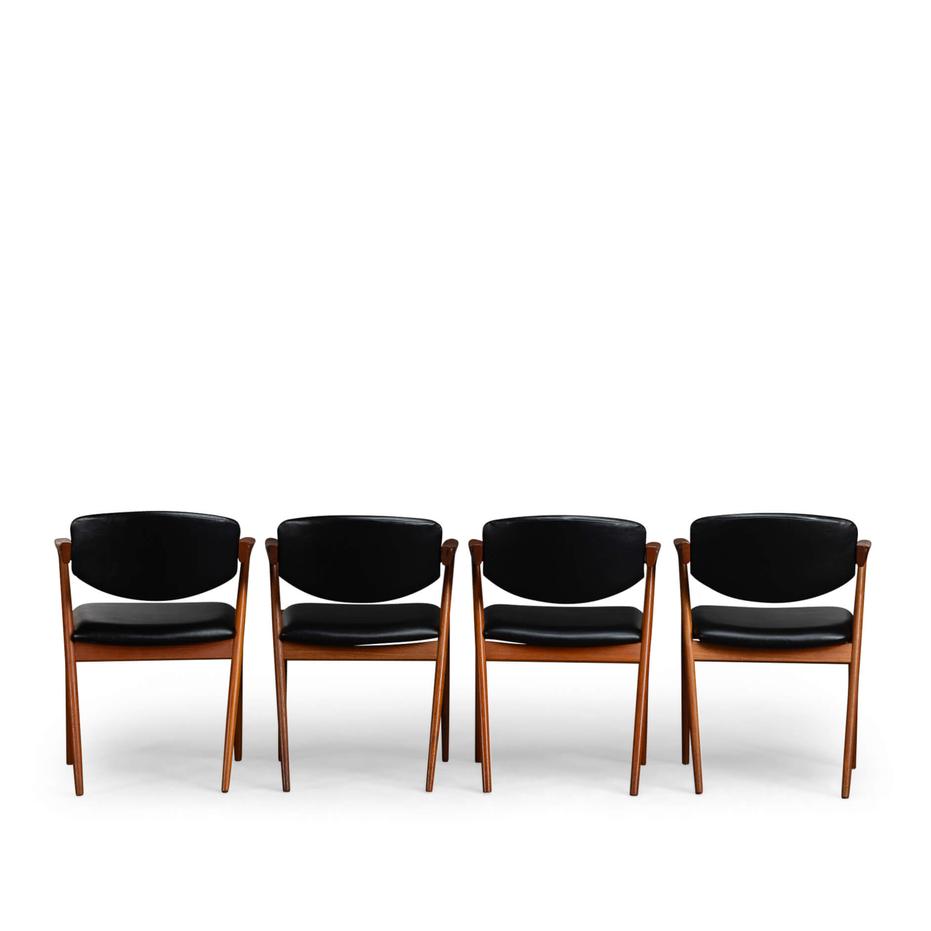 Wat op het eerste gezicht mogelijk wat oncomfortabel oogt, zit eigenlijk als gegoten. De armleuningen hebben exact de juiste lengte. Lang genoeg om steun te bieden, kort genoeg om niet in de weg te zitten bij het uit de stoel komen. Duidelijk over nagedacht door Kristiansen. De set van vier is van teak en opnieuw gestofeerd door onze professionele stoffeerder met een hoogwaardige (Retro) kunstleer en daardoor in zeer goede vintage conditie. We kiezen altijd voor deze Retro leatherette vanwege de hoge kwaliteit en de subtiele glans, waardoor deze erg lijkt op de originele bekleding. Dit wordt bevestigd door onze klanten.